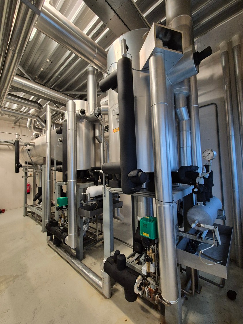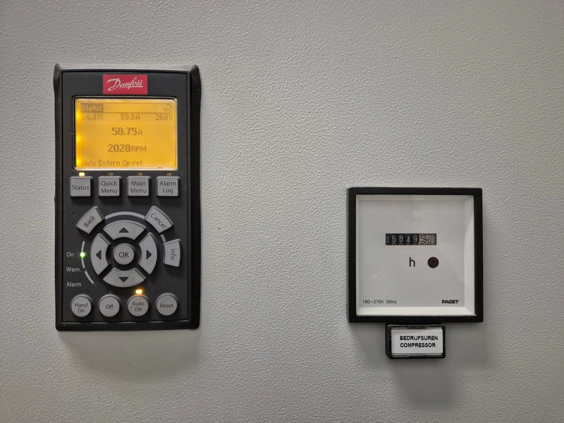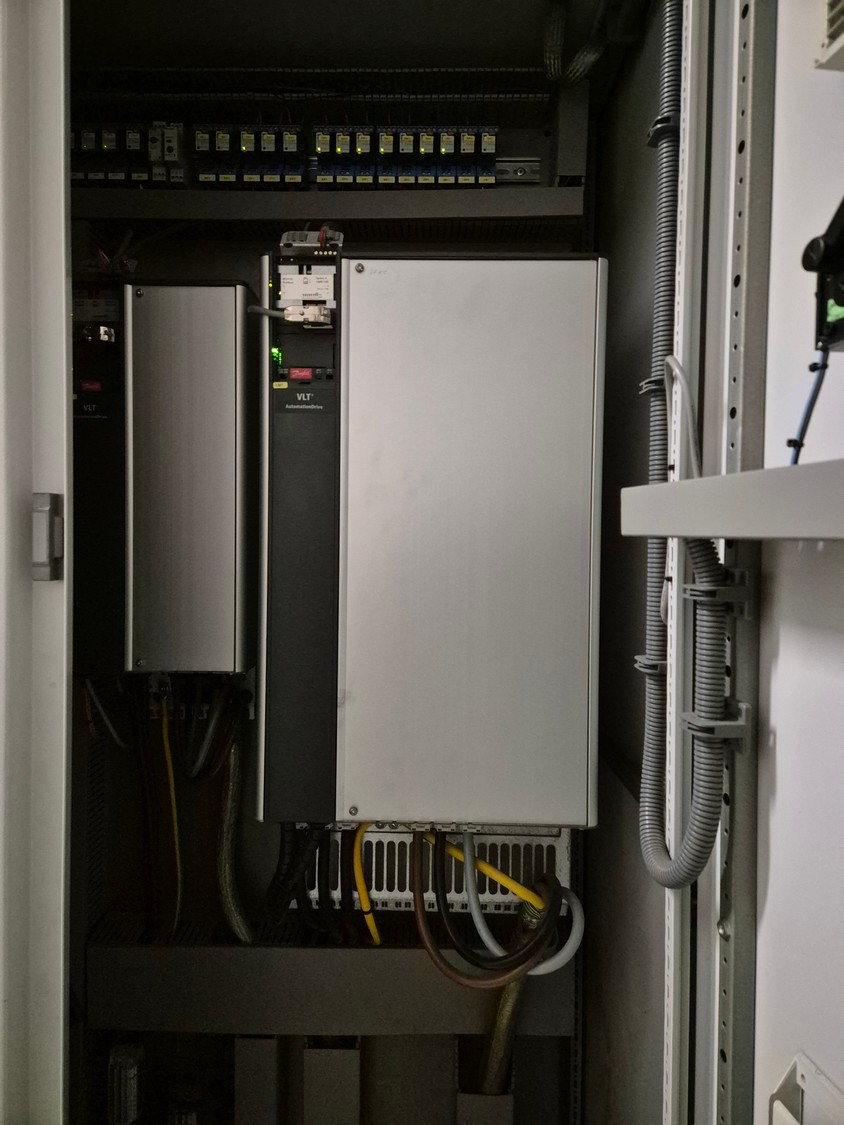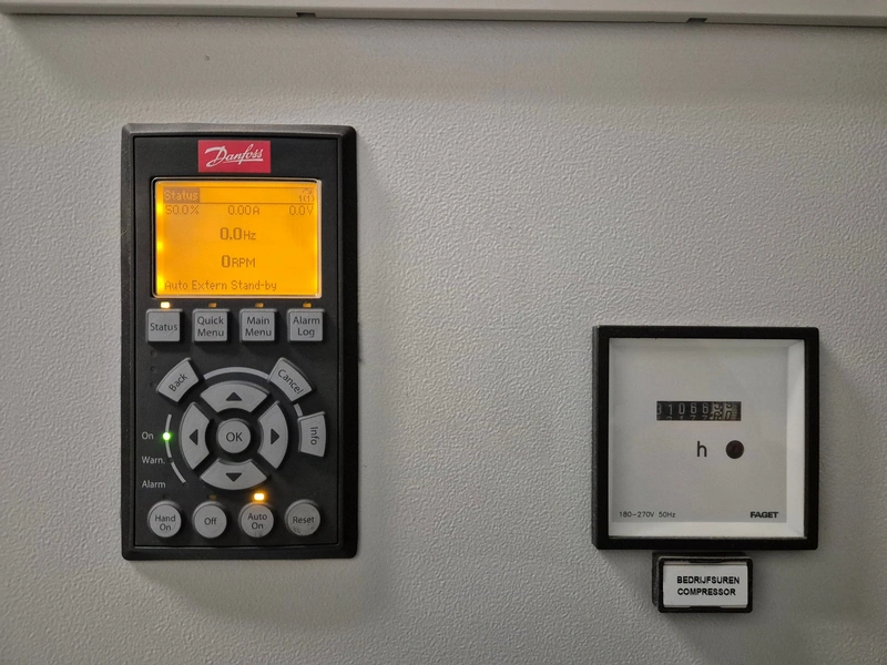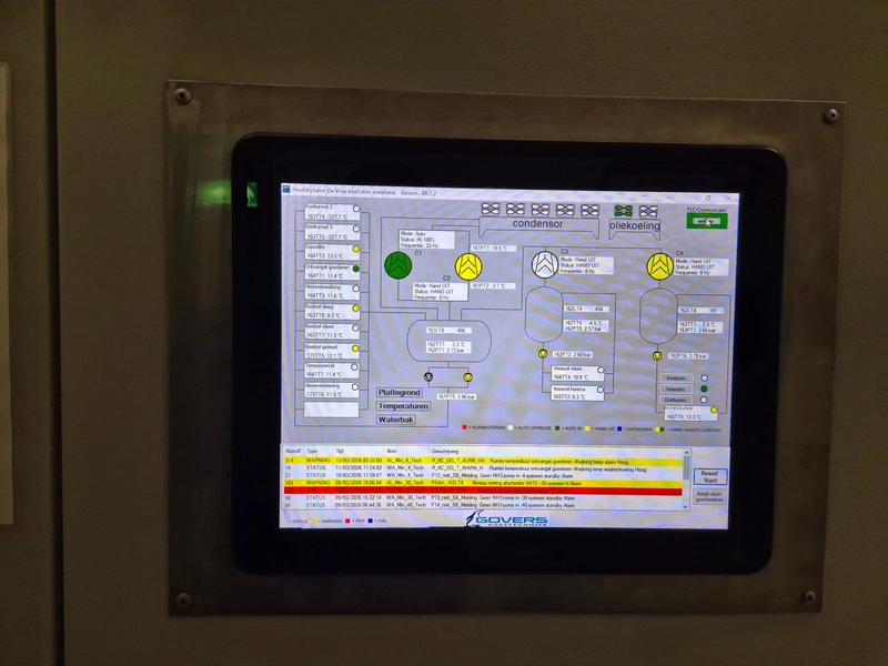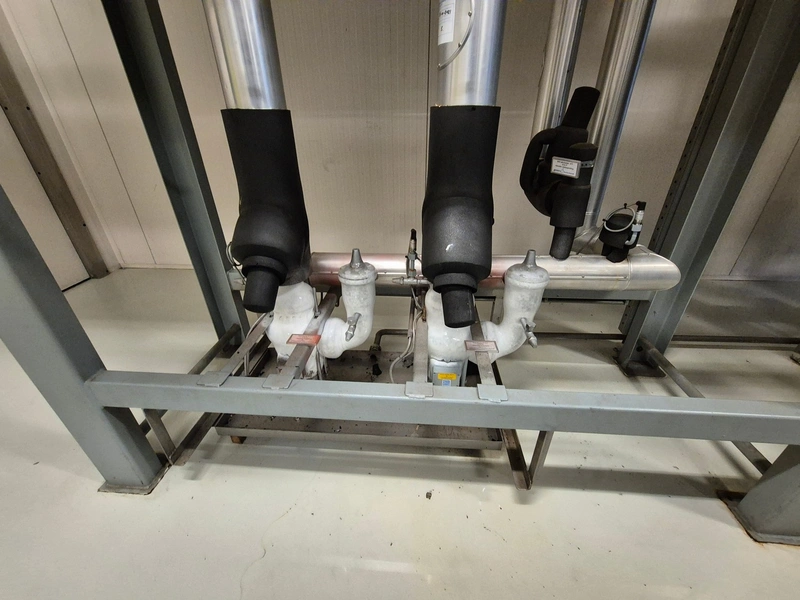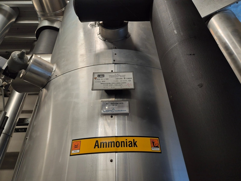 Bitzer Kühlmaschinenbau GmbH NH3 compressor installation with 4 pcs. Bitzer Kühlmaschinenbau GmbH screw compressor, compressor 1: (-4˚C section), type: OSKA 8851 K, cooling capacity: 235 kW, 3000 rates per minute / 50 Hz, nominal capacity: 90 kW, compressor 2: (-4˚C section), type OSKA 8551-K, cooling capacity: 284 kW, 3500 rates per minute / 60 Hz, nominal capacity: 90 kW, compressor 3: (-30˚C section), type: OSKAB 7461 K, cooling capacity: 82 kW, 3500 rates per minute / 60 Hz, nominal capacity: 30 kW, compressor 4: (-40˚C section), type: OSKAB 8571 K, cooling capacity: 90 kW, 3500 rates per minute / 60 Hz, nominal capacity: 75 kW, 3 pcs. WITT separation vessel, refrigerant: NH3, capacity: 500 kW / 75 kW / 150 kW, volume: 1950 liter / 753 liter / 330 liter, 4 pcs. Witt liquid pumps, type: HRP 3232, motor capacity: 1.0 kW, complete switch cabinet, total dimensions switch cabinet: 7000 mm x 600 mm x 2200 mm.