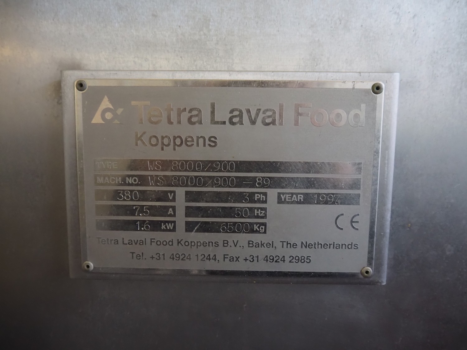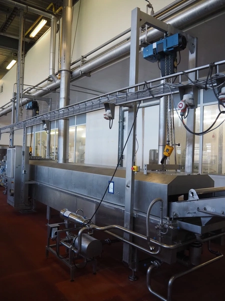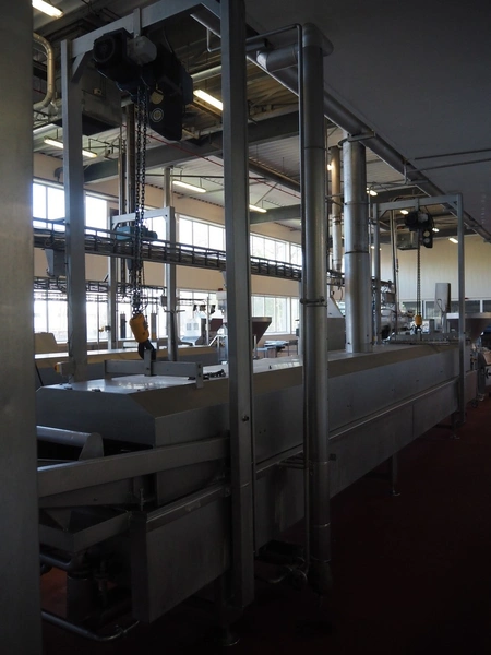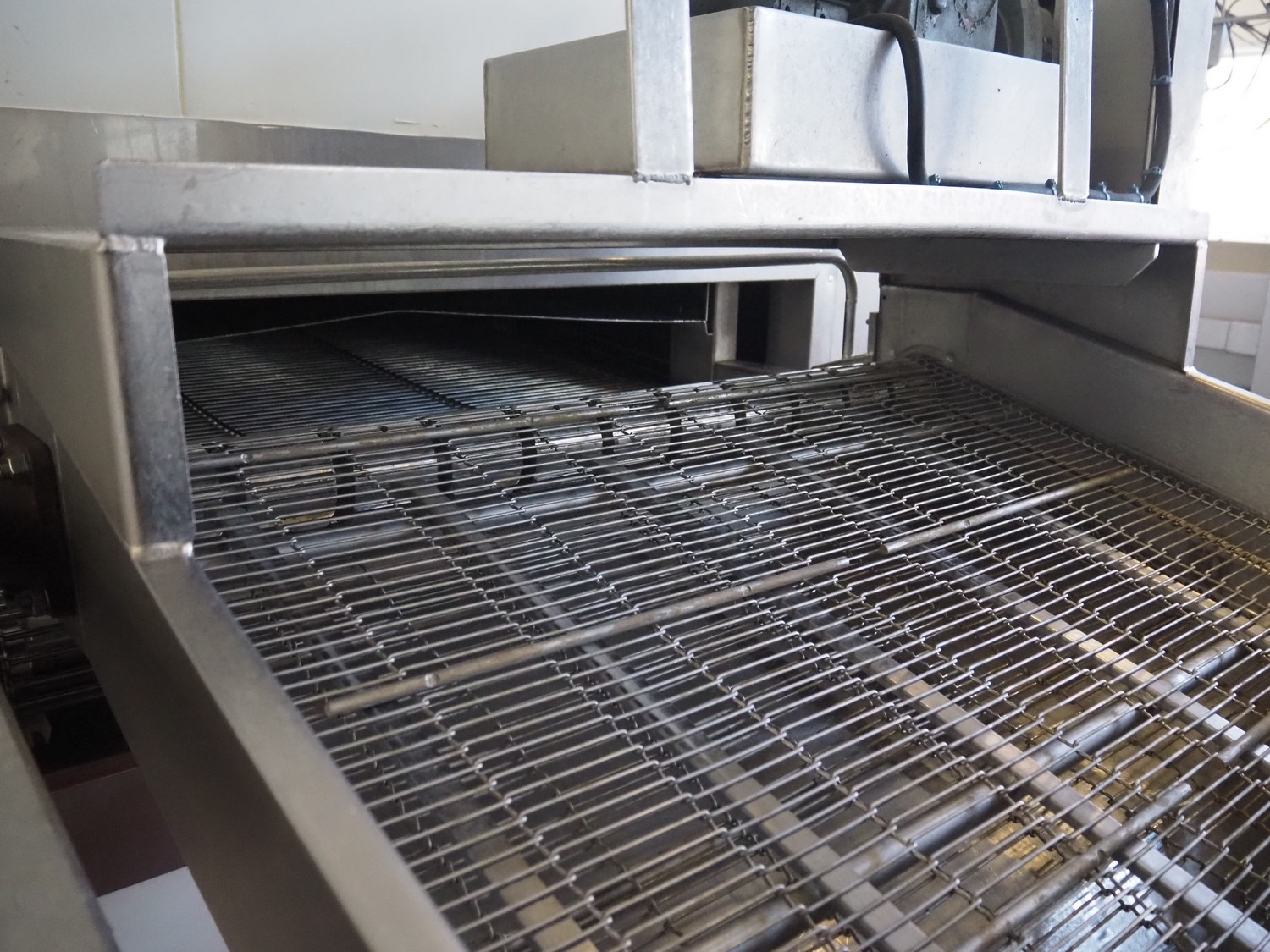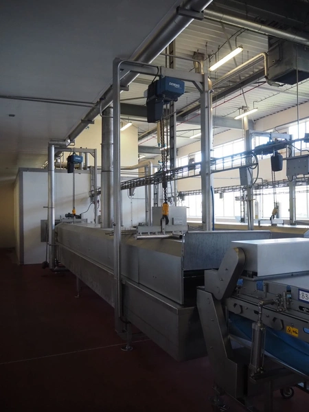 Koppens cooking line, type: WS 8000 / 900, machine number: WS 8000 / 900 - 89, year of construction: 1997, 380 V, 3 Ph, 50 Hz, 7.5 A, 1.6 kW, weight: 6500 kg, s/s mesh belt, belt width: 900 mm, cooking length: 8000 mm, dimensions cooking line: 9500 mm x 2000 mm x 3650 mm, 2 Demag electrical chain hoists, Alfa Laval centrifugal pump, type: LKH 5/132 SSS 2.2 kW, year of construction: 2004, dimensions centrifugal pump: 1100 mm x 600 mm x 900 mm.