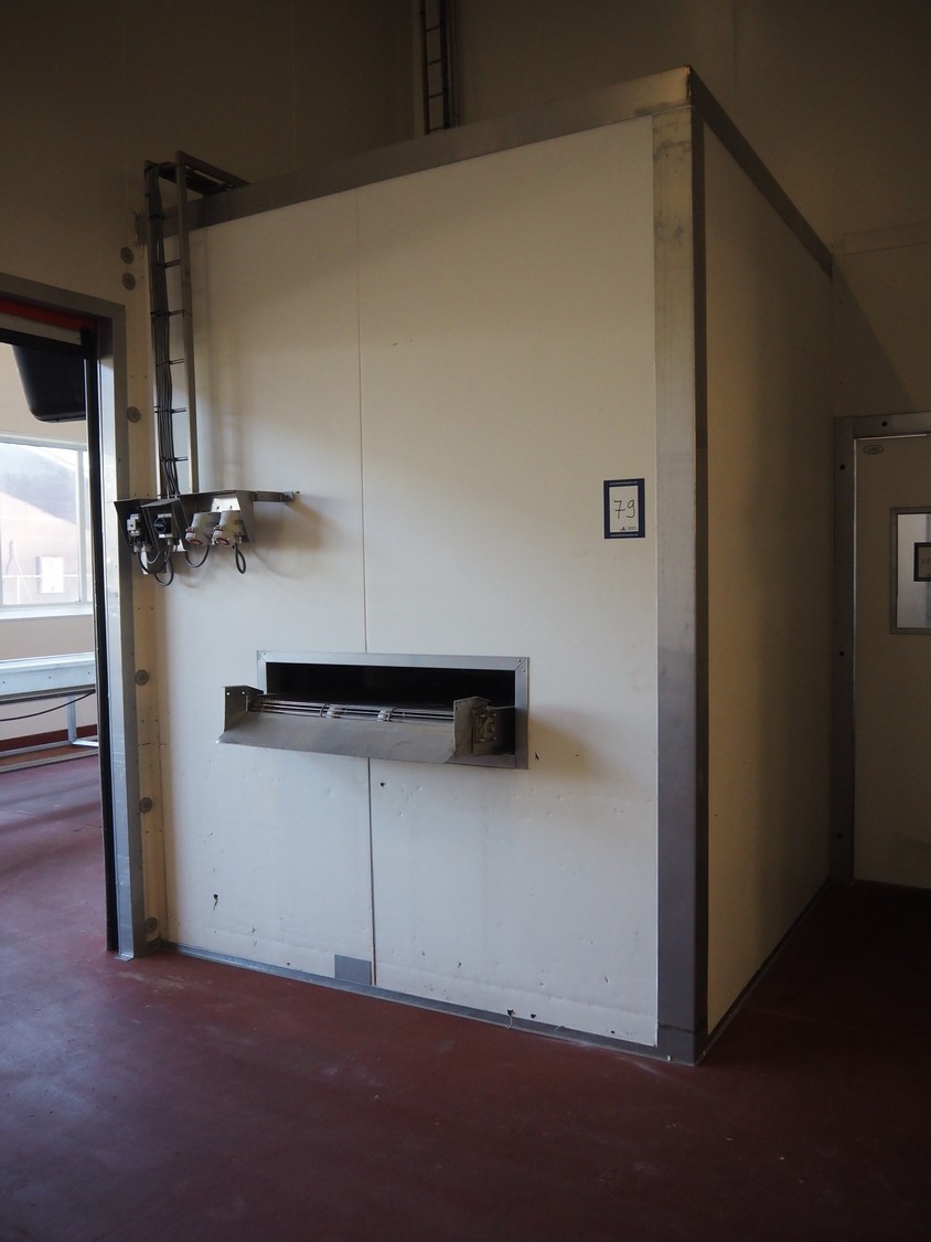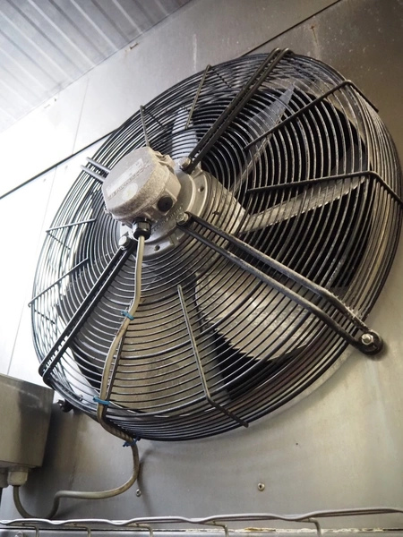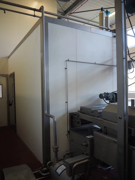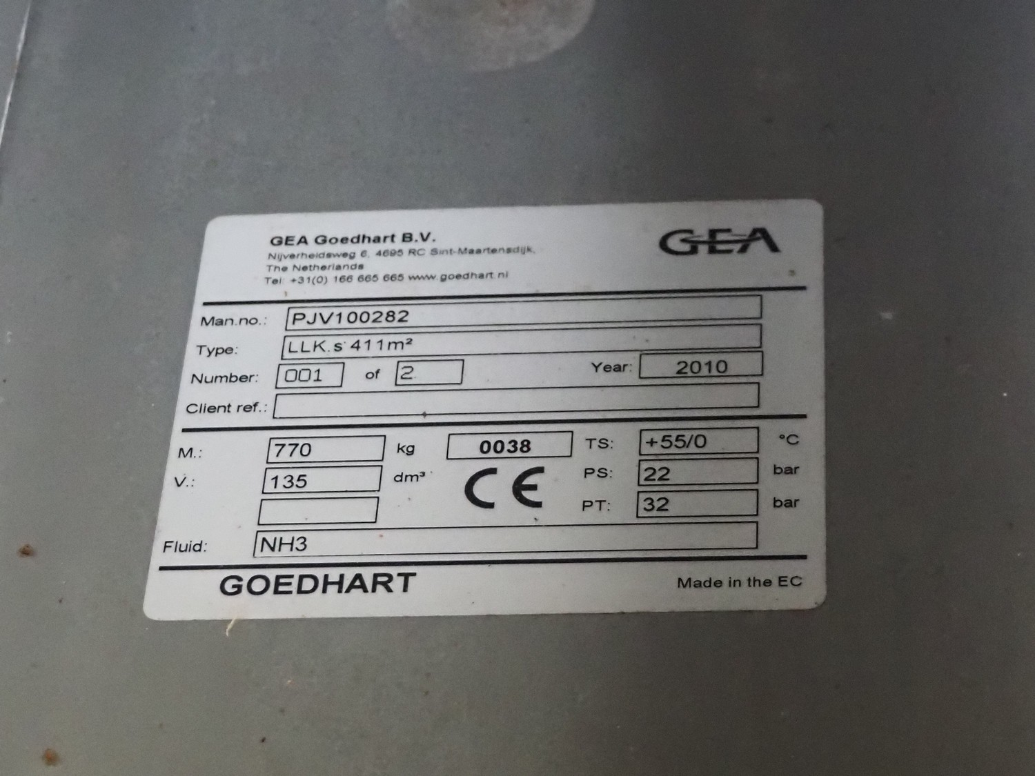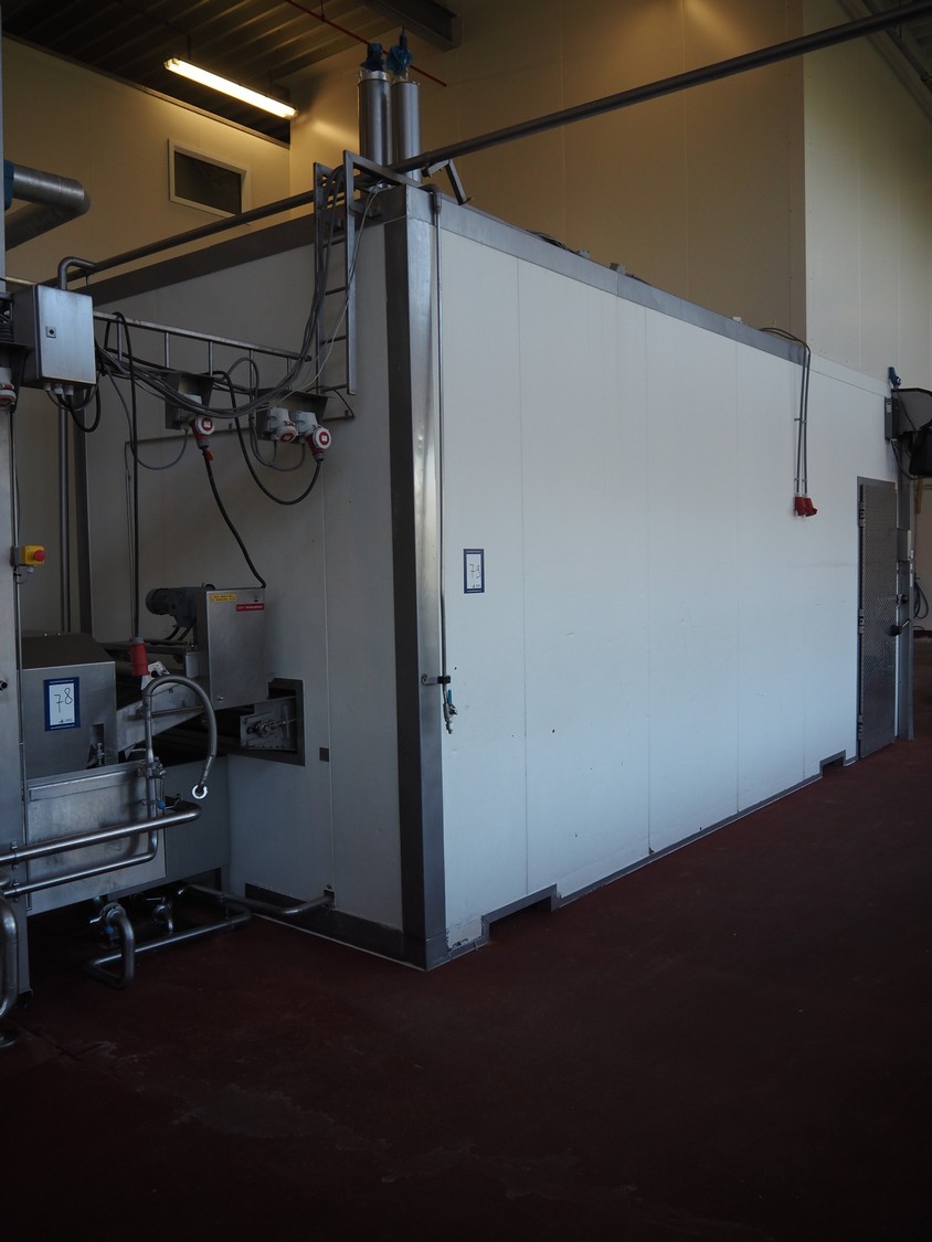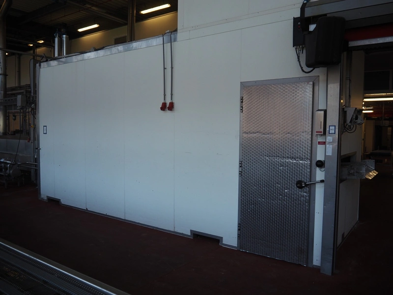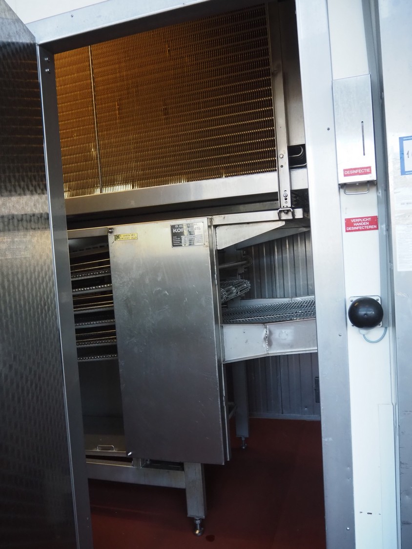 Koppens / GEA Goedhart B.V. cooling tunnel, type: KT3S 6000 / 1000, machine number: KT3S 6000 / 1000 - 138, 380 V, 3 Ph, 50 Hz, 1.12 A, 0.37 kW, 3 floors, s/s mesh belt, belt width: 1000 mm, GEA Goedhart B.V. evaporator, type: LLK.s 411 m², manufacturing number: PJV100282, year of construction: 2010, volume: 135 dm³, refrigerant: NH3, weight: 770 kg, working pressure: 22 bar, test pressure: 32 bar, total dimensions including cooling panels and s/s door: 7500 mm x 2700 mm x 3300 mm.