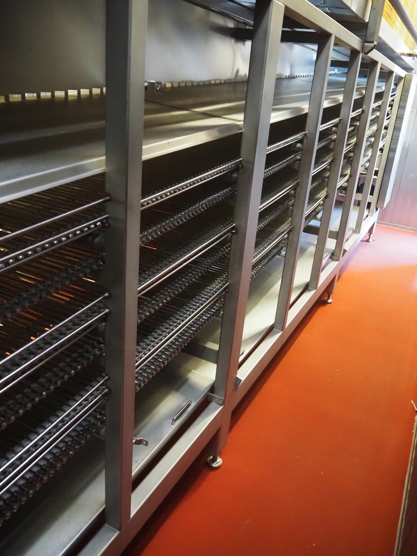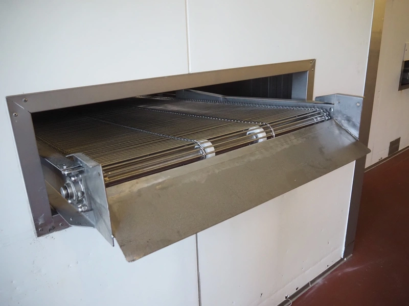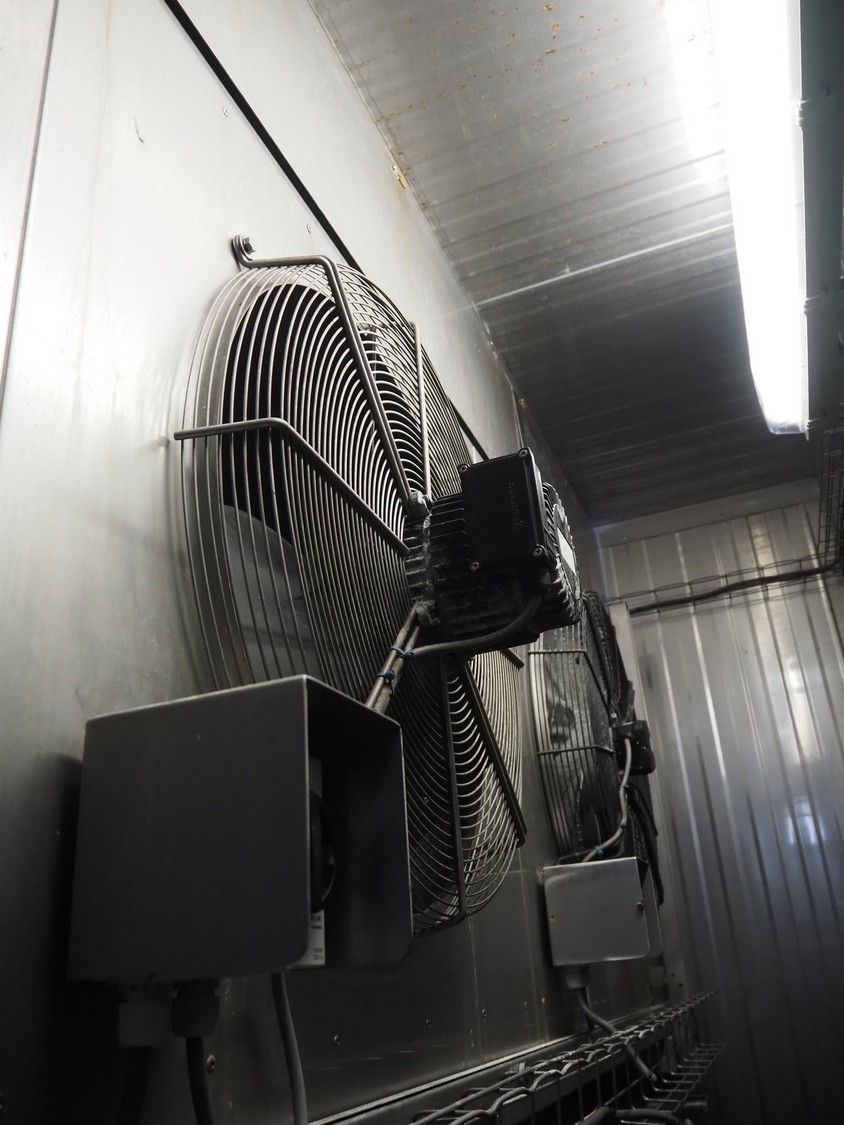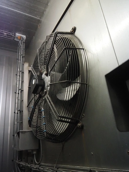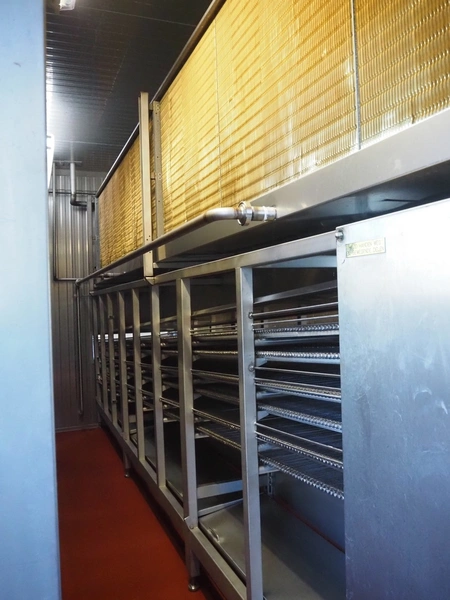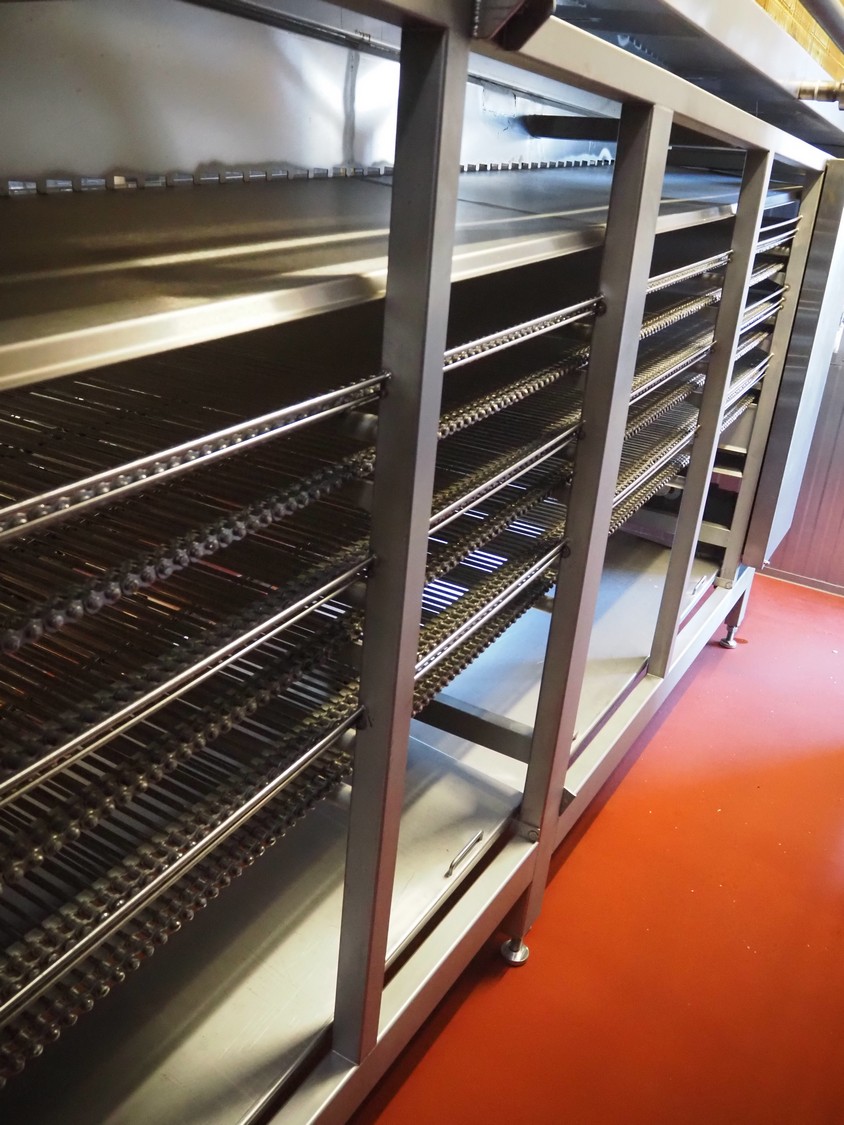 Koppens / GEA Goedhart B.V. cooling tunnel, type: KT3S 6000 / 1000, machine number: KT3S 6000 / 1000 - 138, 380 V, 3 Ph, 50 Hz, 1.12 A, 0.37 kW, 3 floors, s/s mesh belt, belt width: 1000 mm, GEA Goedhart B.V. evaporator, type: LLK.s 411 m², manufacturing number: PJV100282, year of construction: 2010, volume: 135 dm³, refrigerant: NH3, weight: 770 kg, working pressure: 22 bar, test pressure: 32 bar, total dimensions including cooling panels and s/s door: 7500 mm x 2700 mm x 3300 mm.