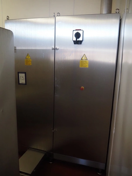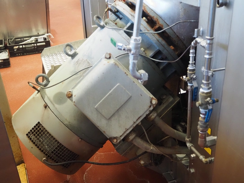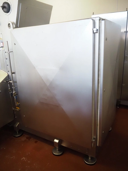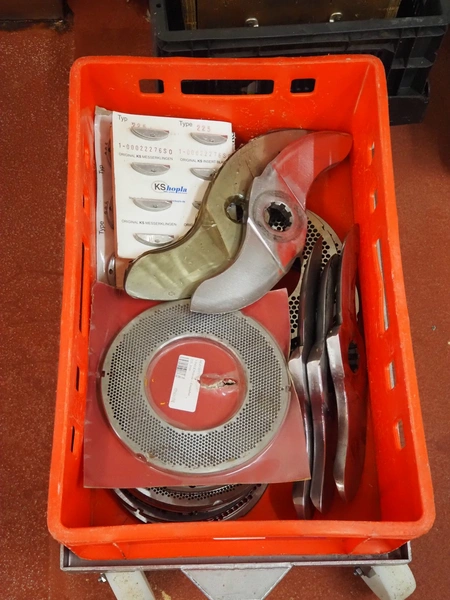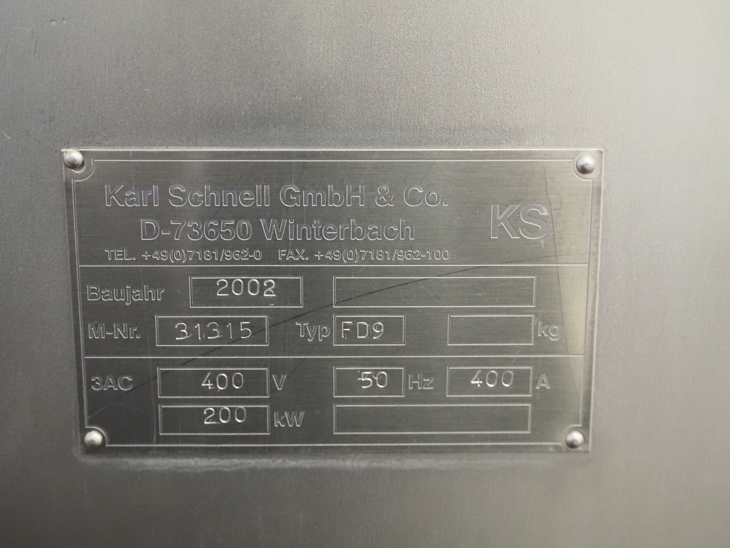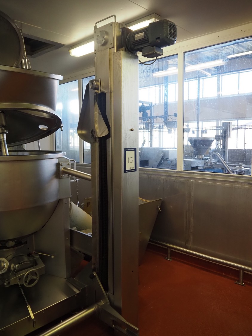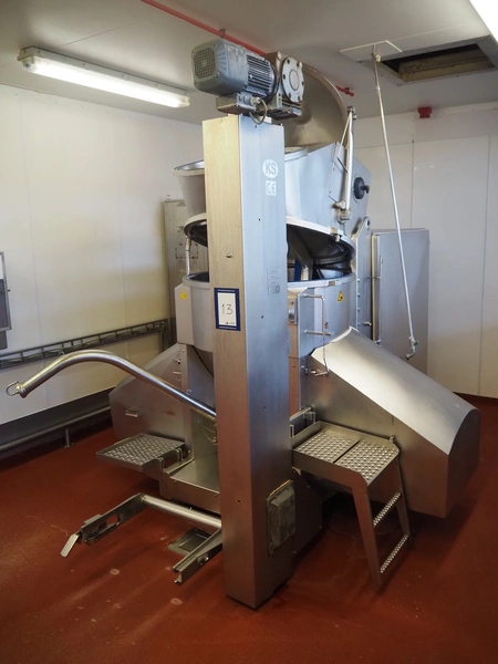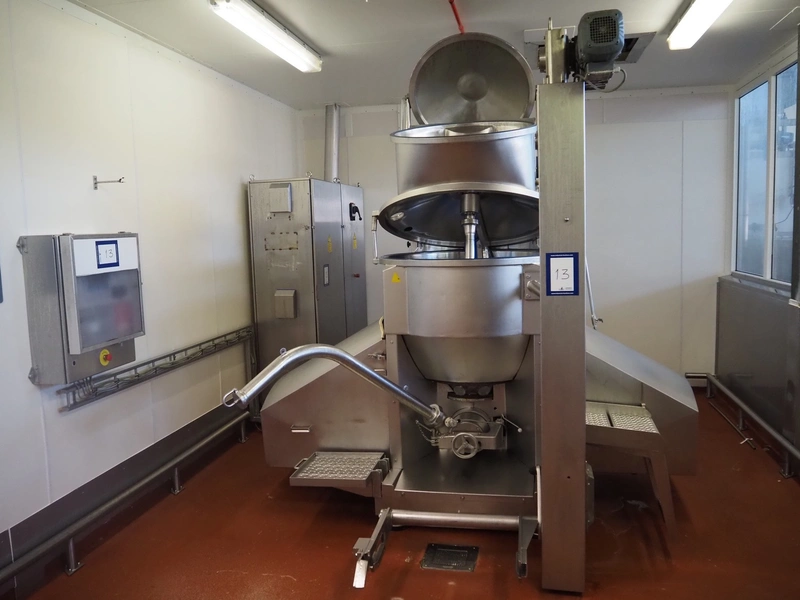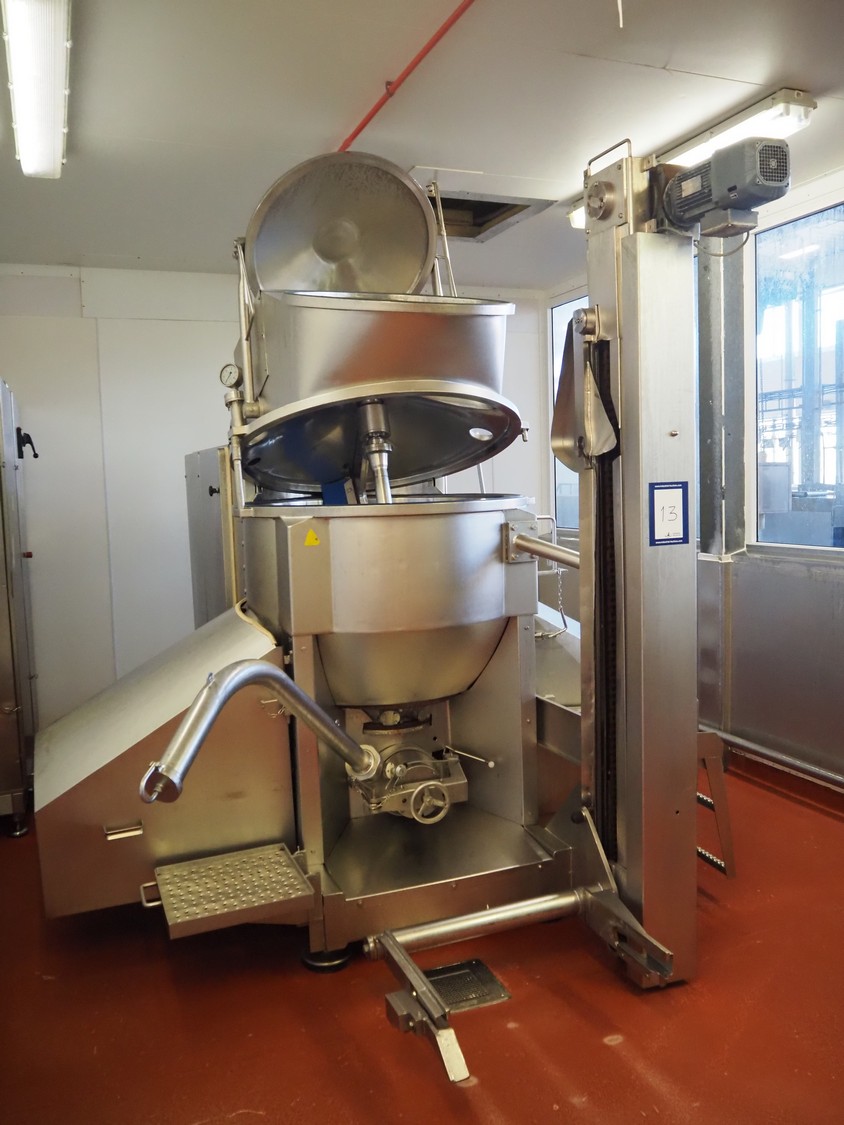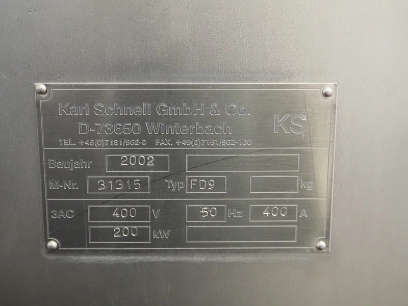 Karl Schnell emulsifier with lifter for 200 liter meat bins, type: FD9, machine number: 31315, year of construction: 2002, 400 V, 50 Hz, 400 A, 200 kW, dimensions emulsifier: 4100 mm x 2800 mm x 2700 mm, switch cabinet, dimensions: 1700 mm x 600 mm x 2300 mm, control panel, dimensions: 600 mm x 300 mm x 700 mm, including 2 rollies and trolley with large amount of plates and knifes, dimensions trolley: 1100 mm x 600 mm x 1000 mm, including pallet with various parts.