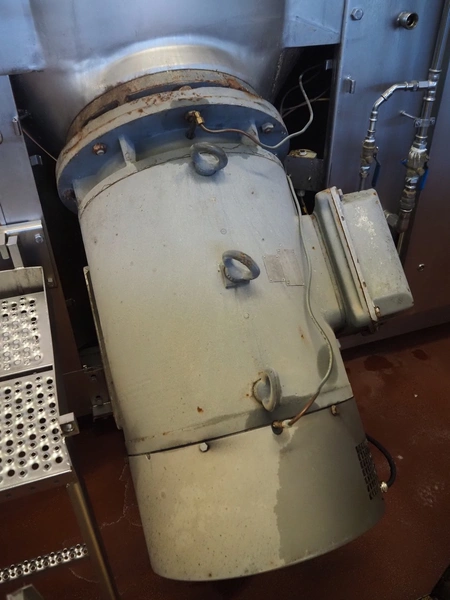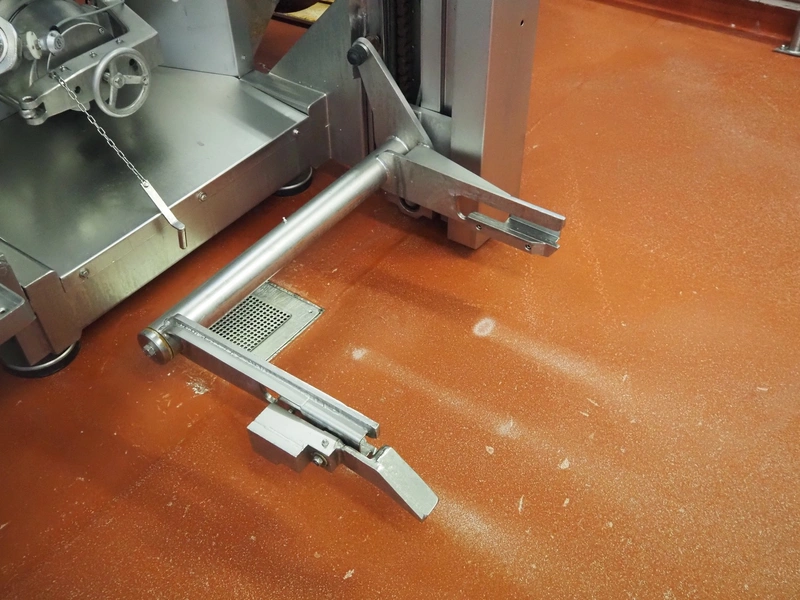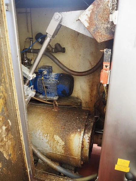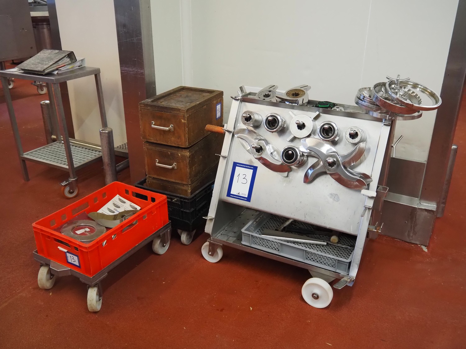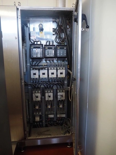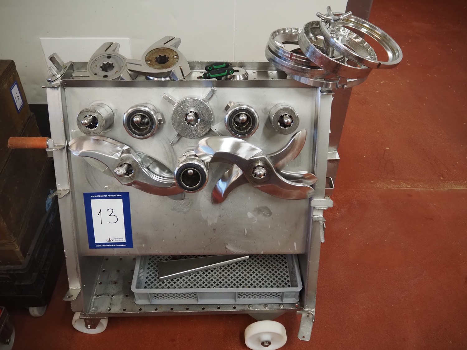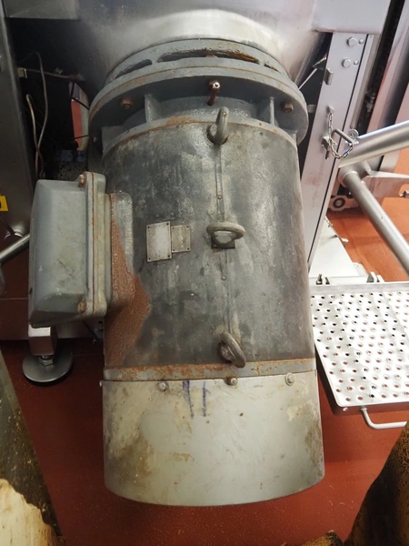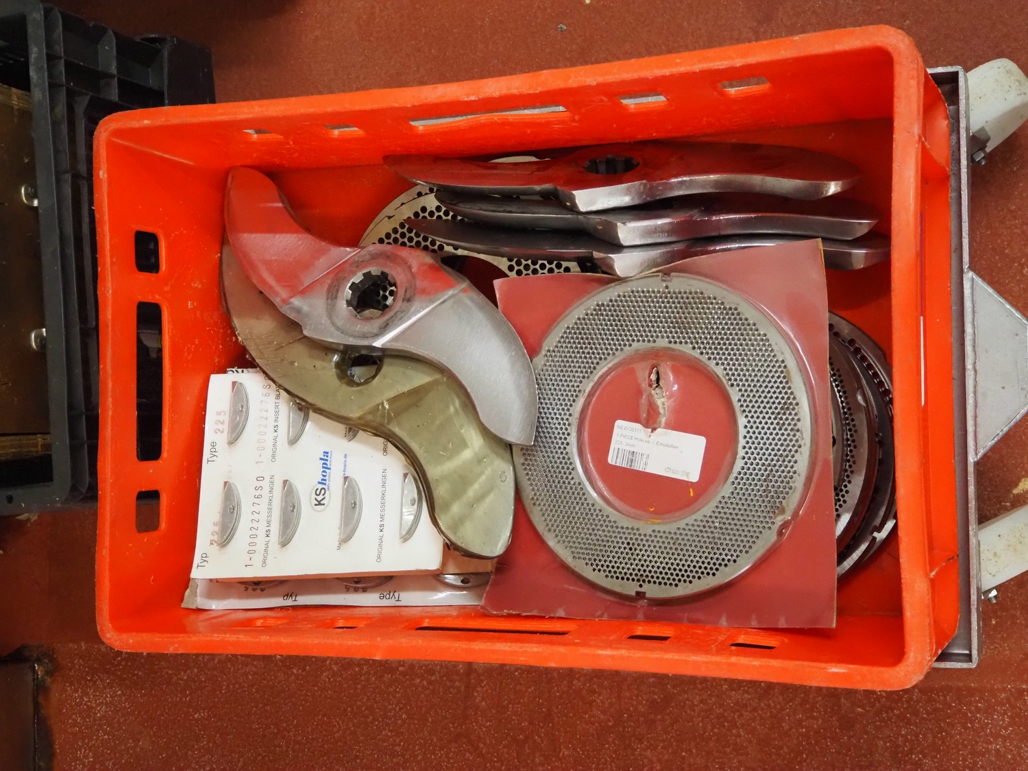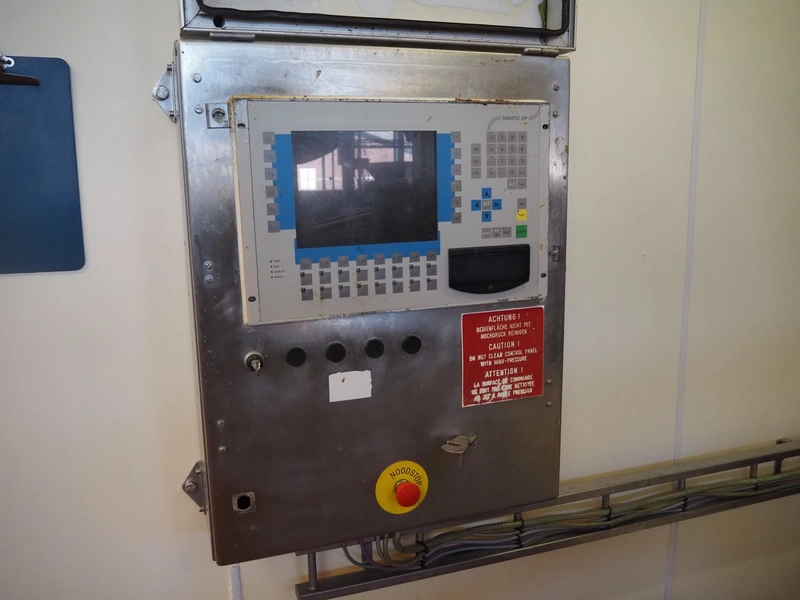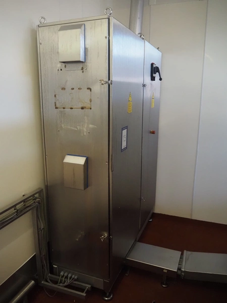 Karl Schnell emulsifier with lifter for 200 liter meat bins, type: FD9, machine number: 31315, year of construction: 2002, 400 V, 50 Hz, 400 A, 200 kW, dimensions emulsifier: 4100 mm x 2800 mm x 2700 mm, switch cabinet, dimensions: 1700 mm x 600 mm x 2300 mm, control panel, dimensions: 600 mm x 300 mm x 700 mm, including 2 rollies and trolley with large amount of plates and knifes, dimensions trolley: 1100 mm x 600 mm x 1000 mm, including pallet with various parts.