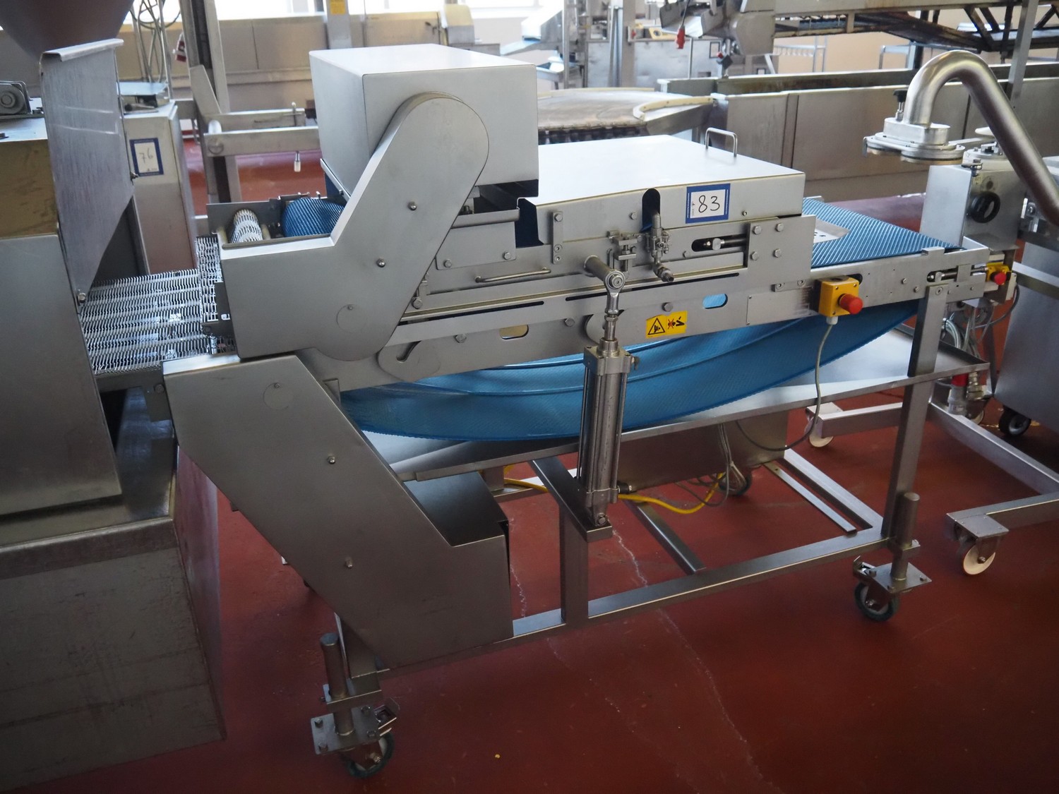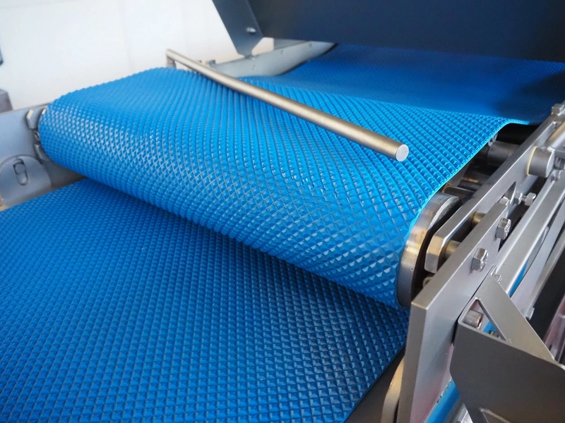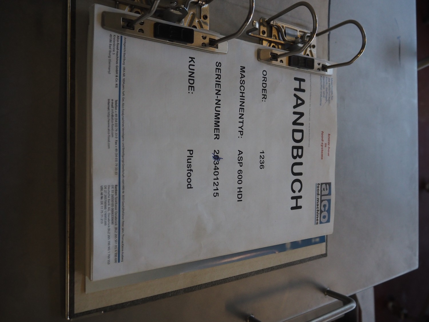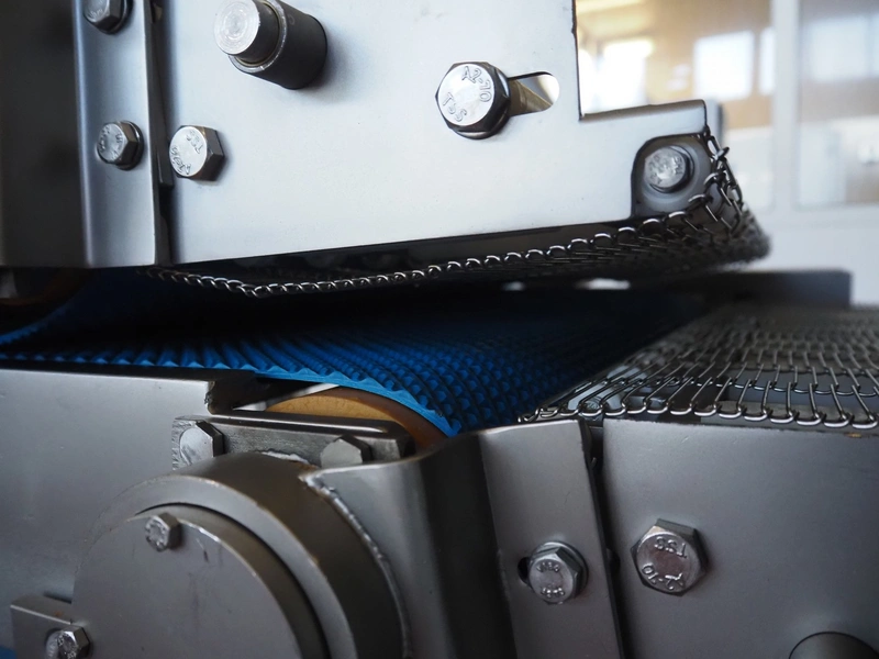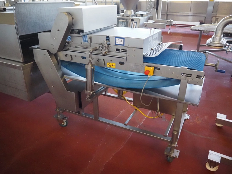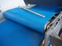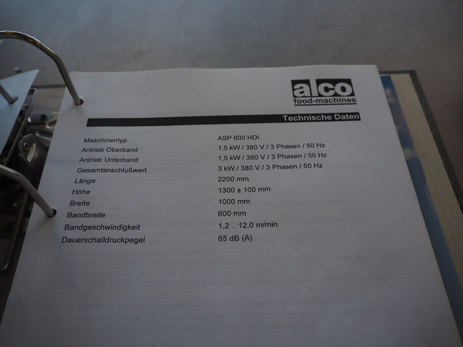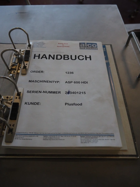 Alco Food-Machines mobile flattener, machine type: ASP 600 HDI, serial number: 23401215, 380 V, 3 Ph, 50 Hz, 3 kW, plastic belt, belt width: 600 mm, total dimensions: 2200 mm x 950 mm x 1500 mm.