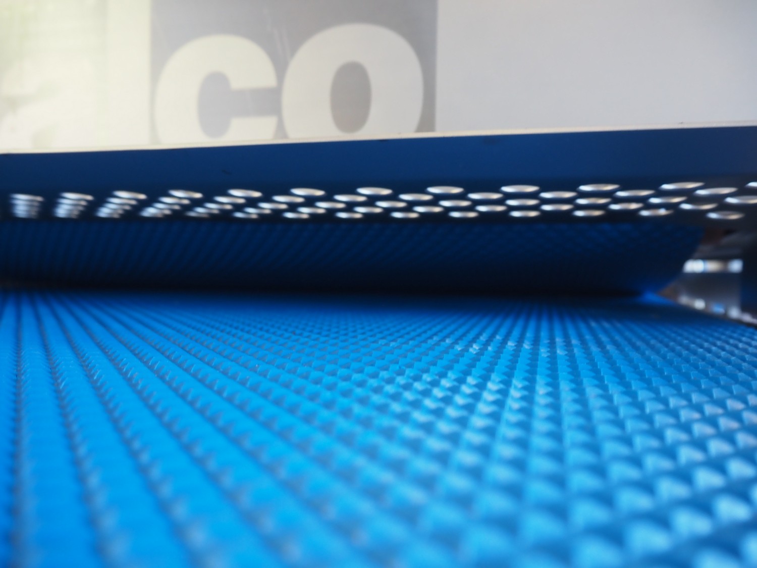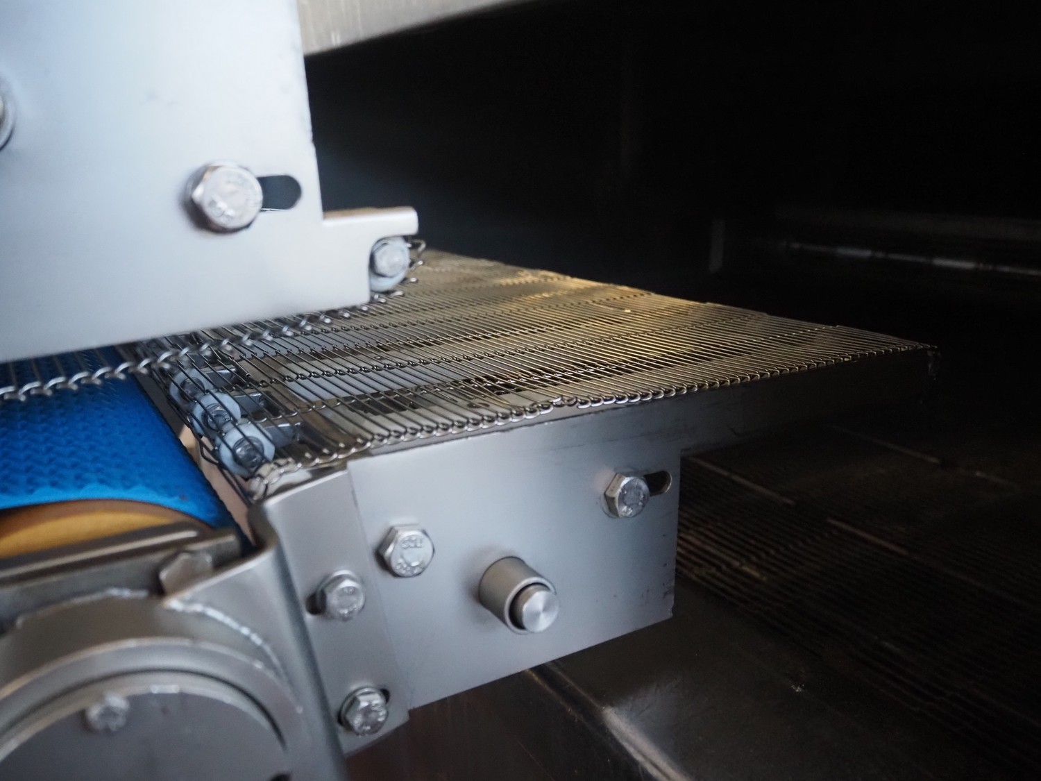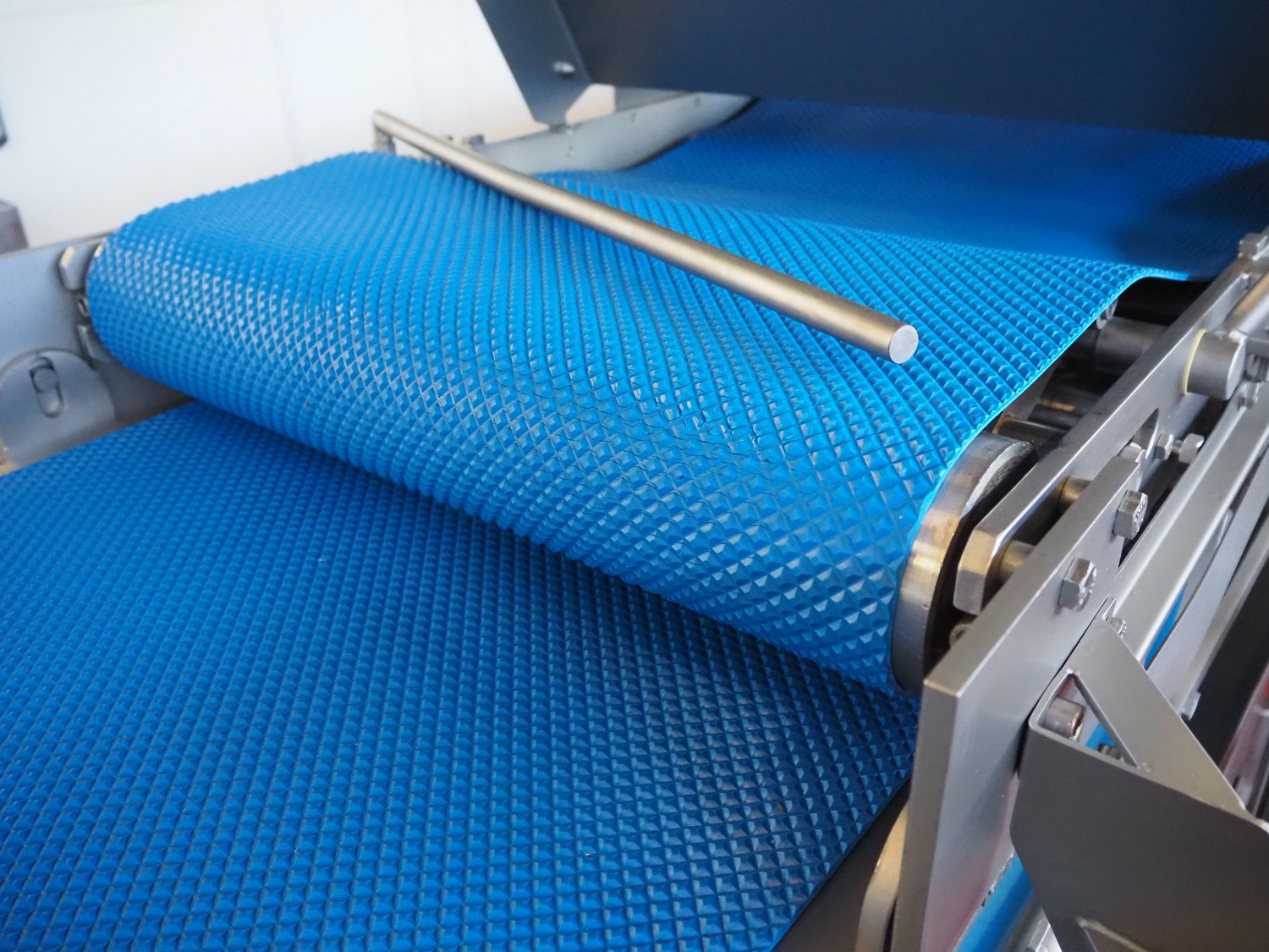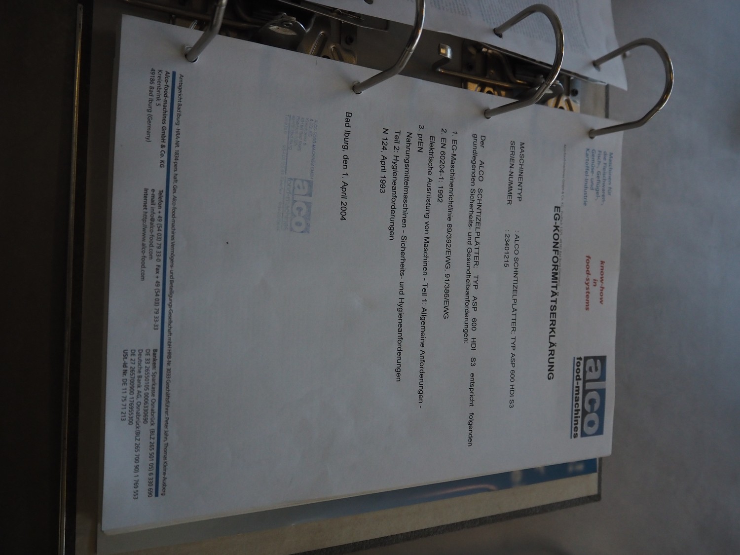 Alco Food-Machines mobile flattener, machine type: ASP 600 HDI, serial number: 23401215, 380 V, 3 Ph, 50 Hz, 3 kW, plastic belt, belt width: 600 mm, total dimensions: 2200 mm x 950 mm x 1500 mm.