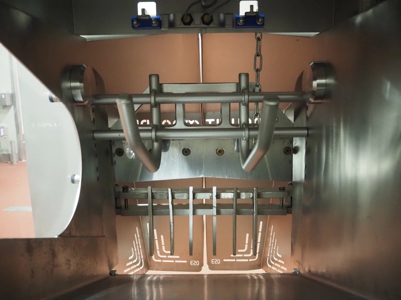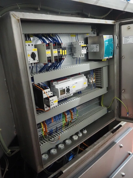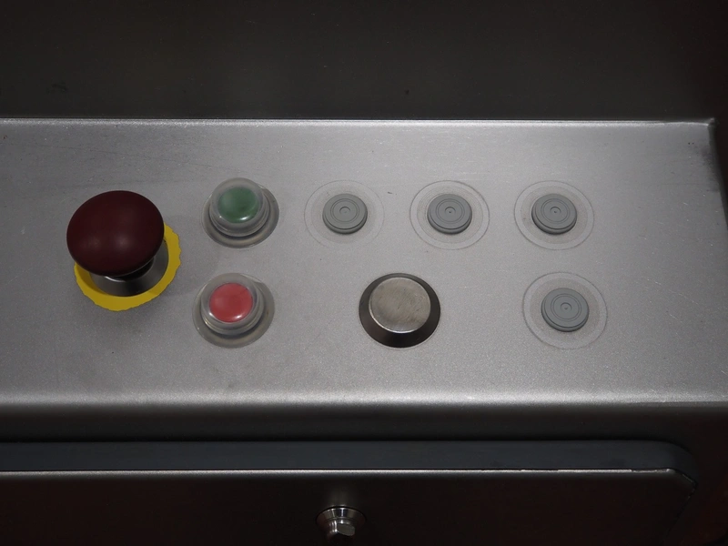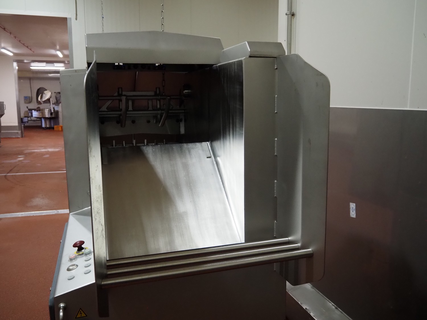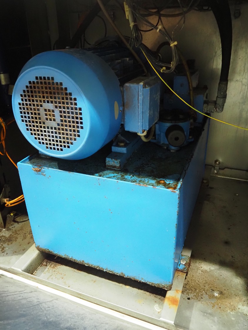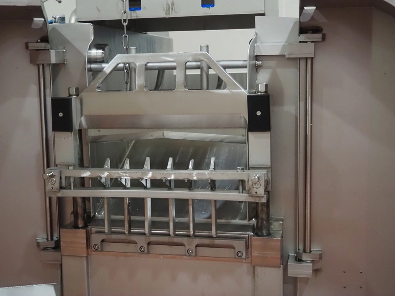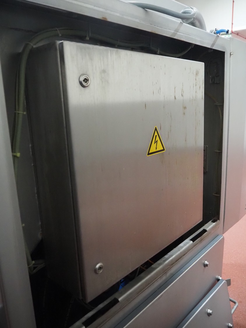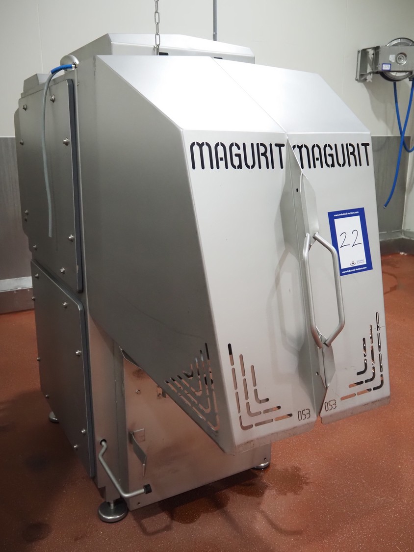 Magurit frozen block cutter, type: 053, machine number: 6159, year of construction: 2011, 400 V, 50 Hz, 13 A, 5.5 kW, weight: 660 kg, air pressure: 6 bar, working width: 500 mm, distance between knives: 50 mm, total dimensions: 2200 mm x 950 mm x 900 mm.