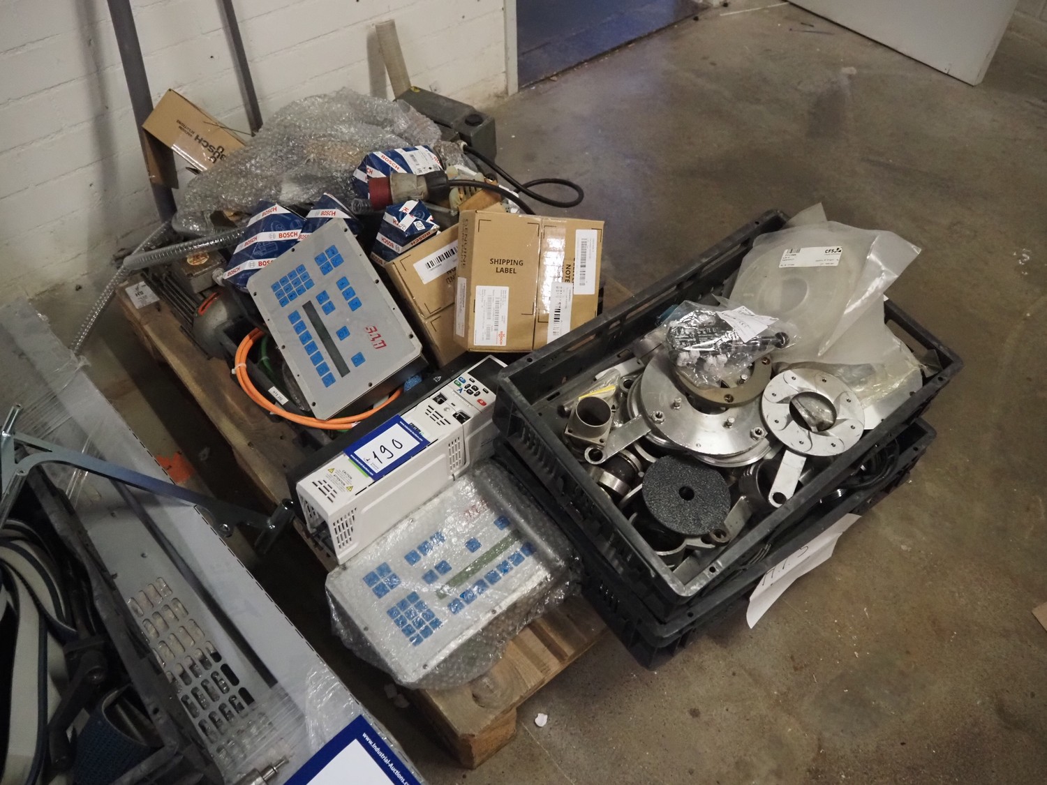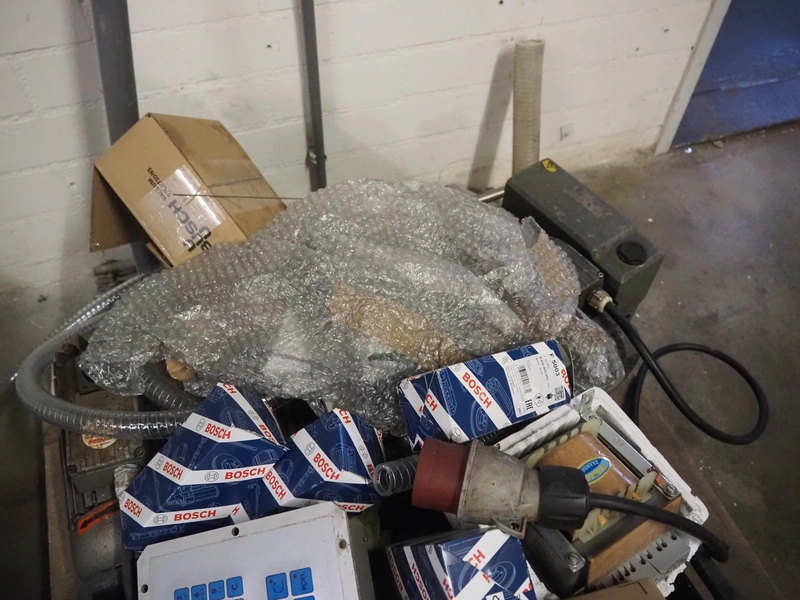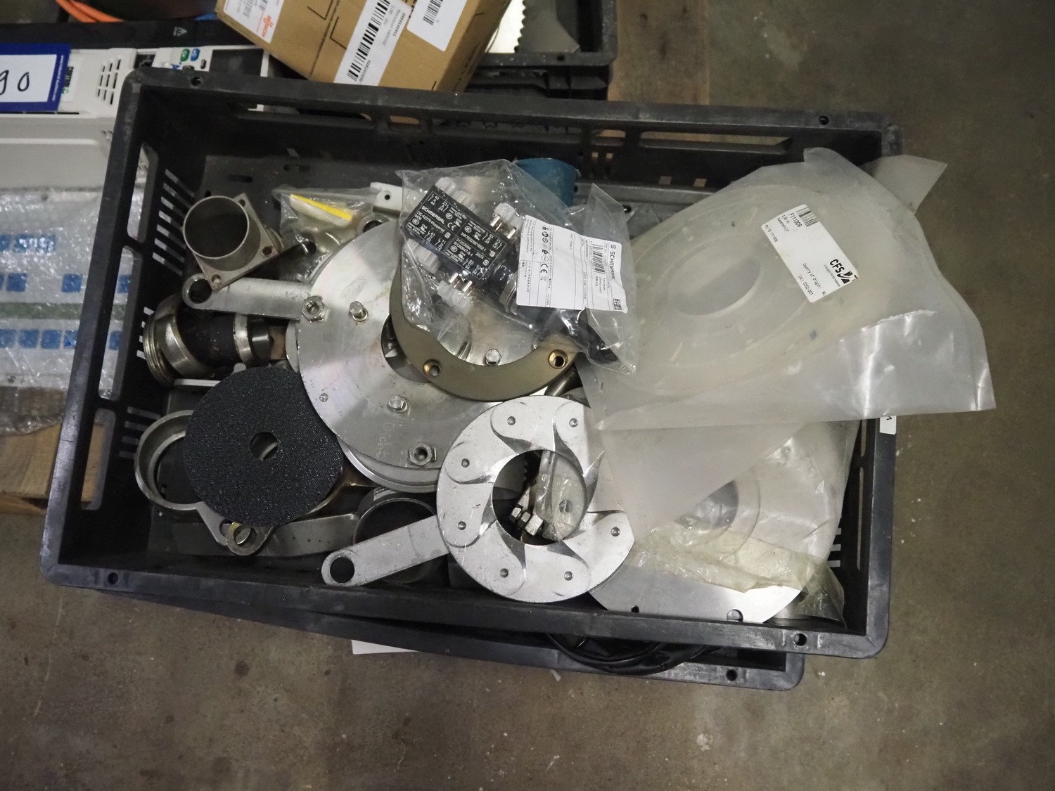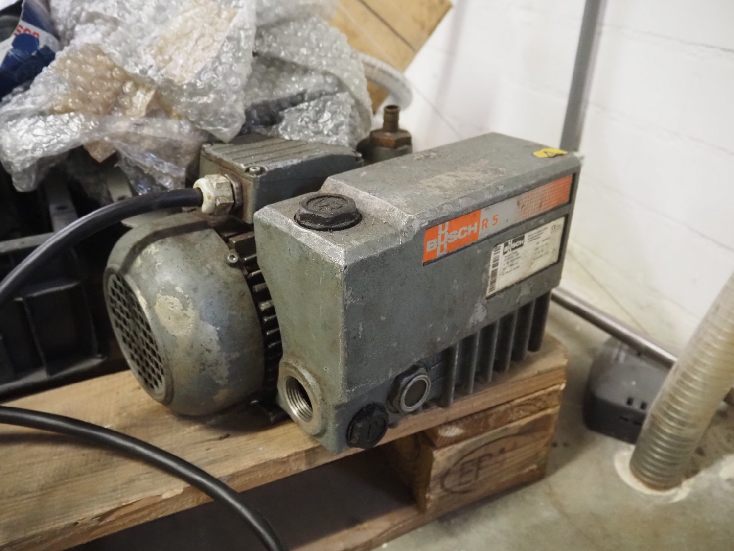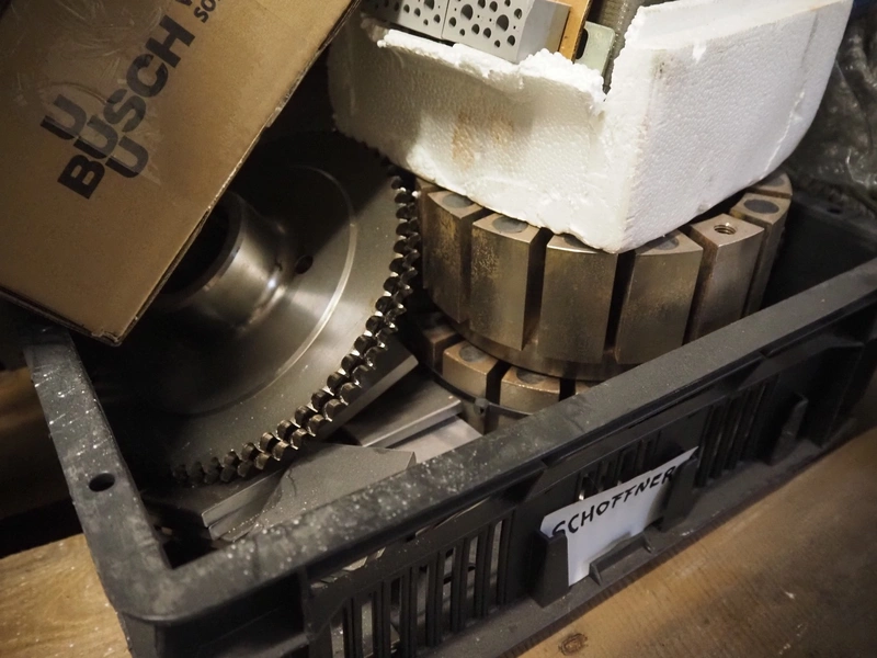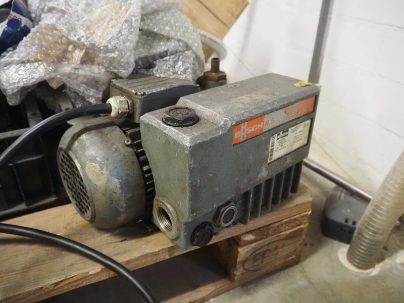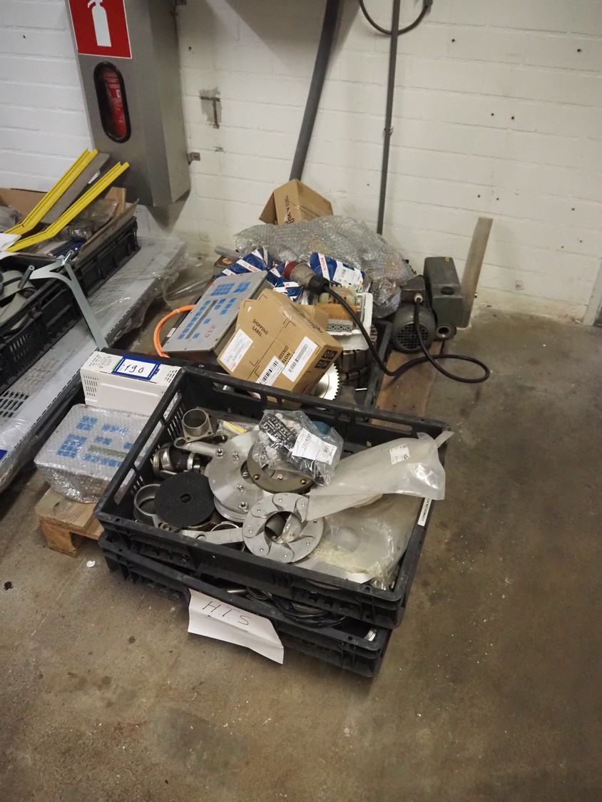 Pallet with parts for Schrofner / HTS vacuum filling machines, amongst other: rotors, parts for diaphragm, Busch vacuum pump, type: KC 0016 E 3ZO, capacity: 19 m³ per hour, dimensions pallet: 1200 mm x 800 mm x 400 mm.