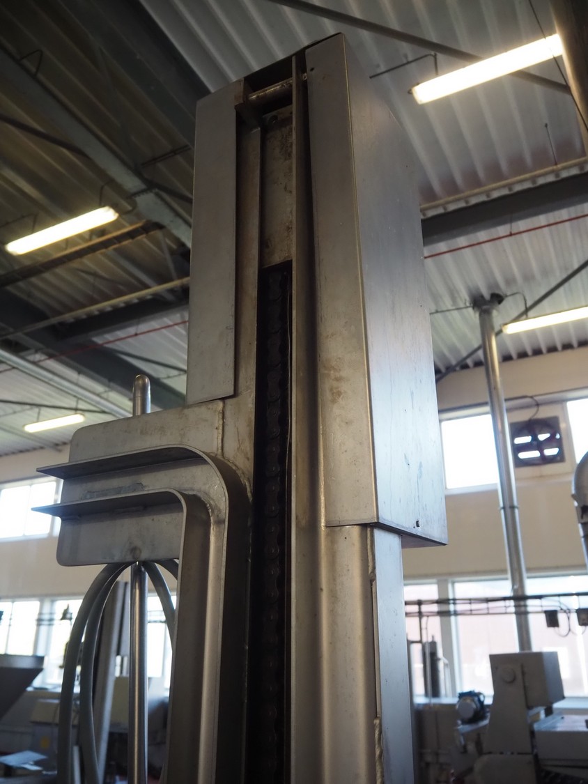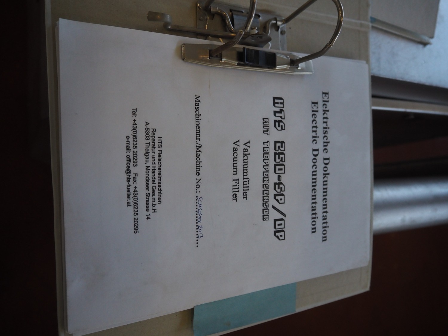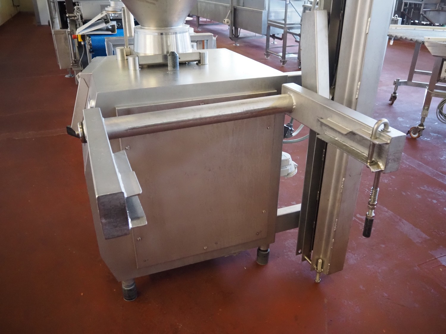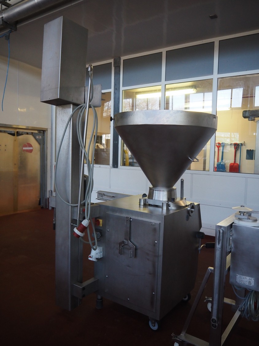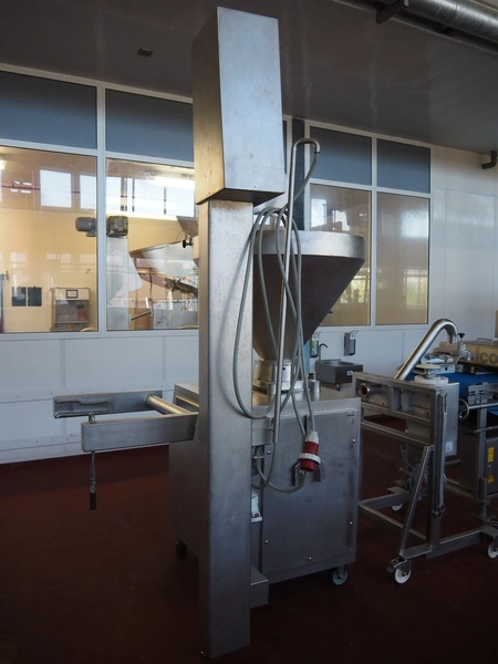 Schrofner / HTS vacuum filling machine with lifter for 200 liter meat bins, type: HTS 250-SP/OP, machine number: Schrofner 2013, built-in Busch vacuum pump, type: KC 0016 E 3ZO, year of construction: 2021, capacity: 19 m³ per hour, total dimensions: 1700 mm x 1200 mm x 1950 mm.
