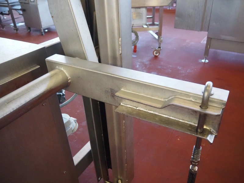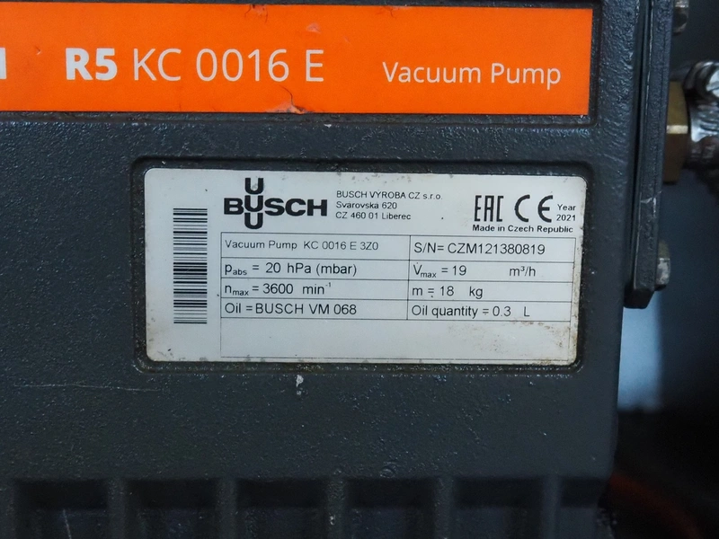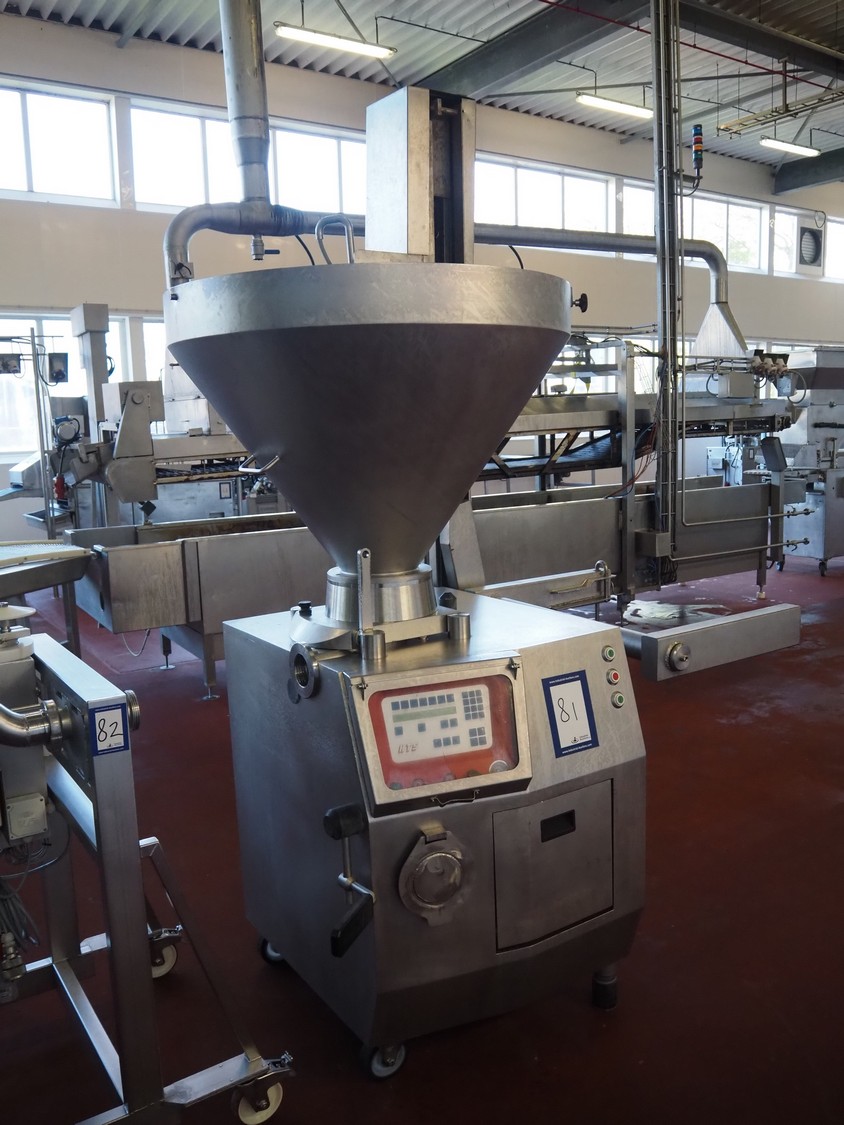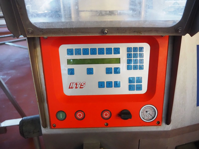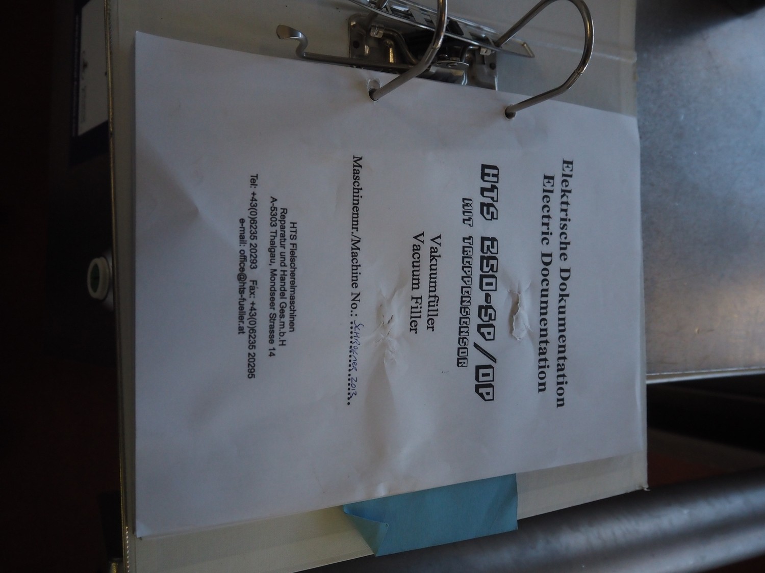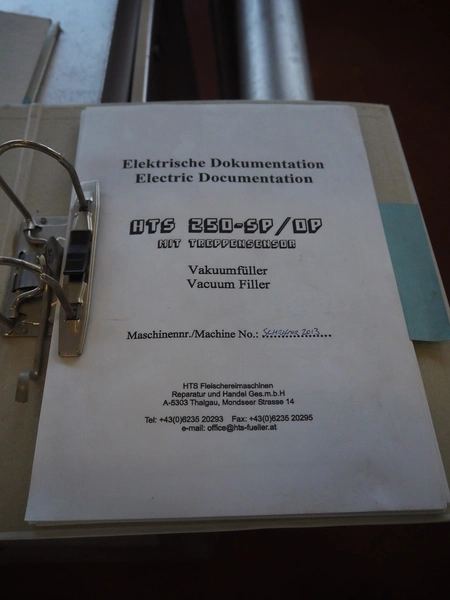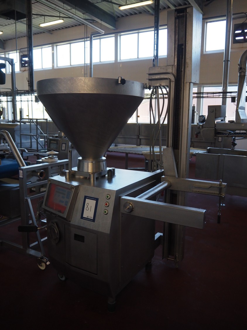Schrofner / HTS vacuum filling machine with lifter for 200 liter meat bins, type: HTS 250-SP/OP, machine number: Schrofner 2013, built-in Busch vacuum pump, type: KC 0016 E 3ZO, year of construction: 2021, capacity: 19 m³ per hour, total dimensions: 1700 mm x 1200 mm x 1950 mm.