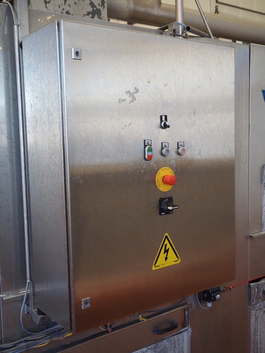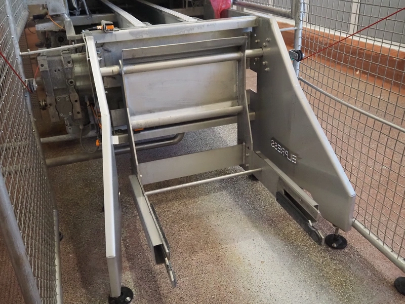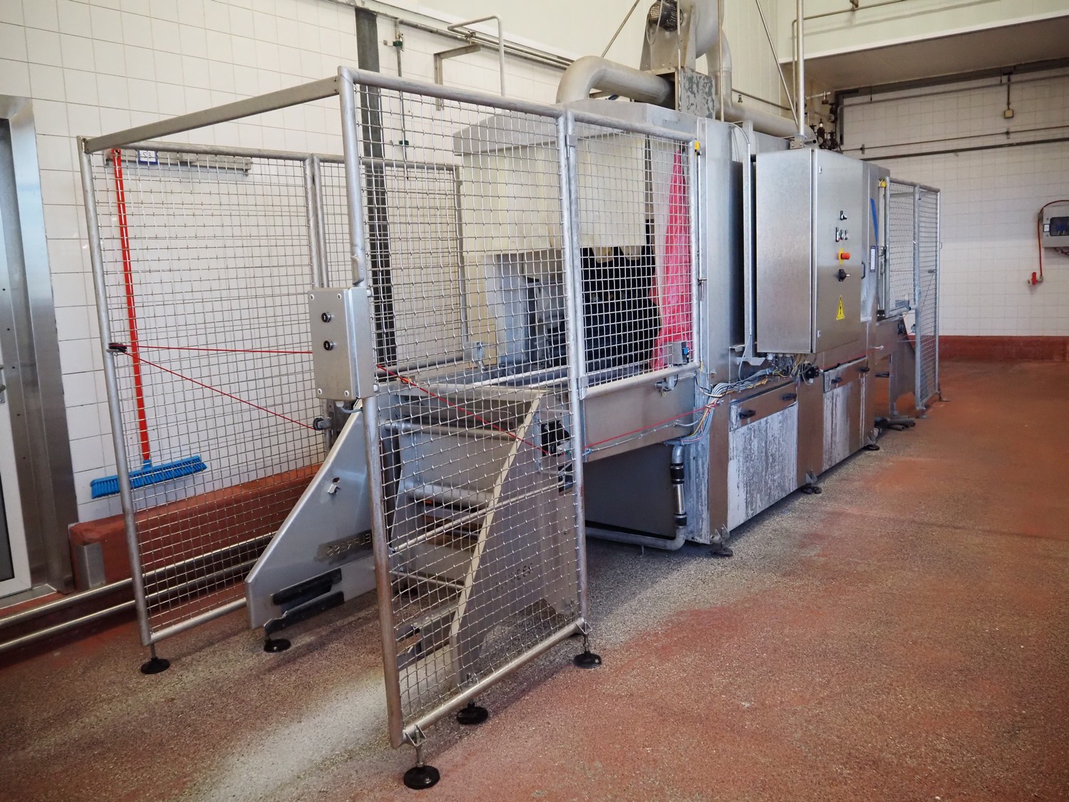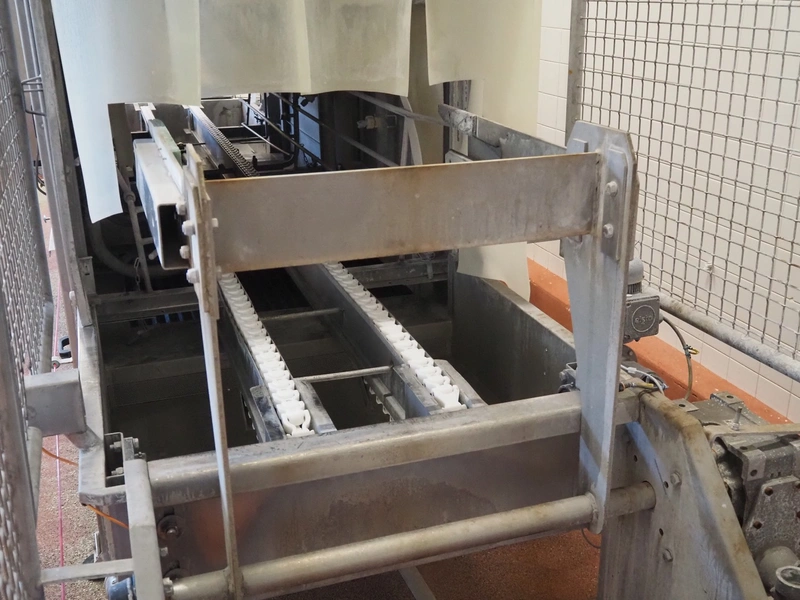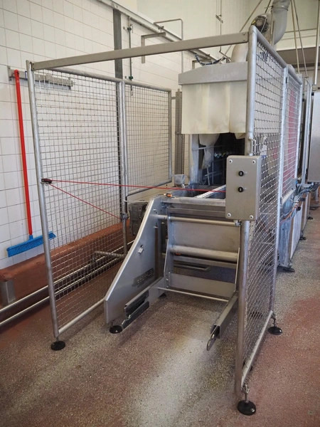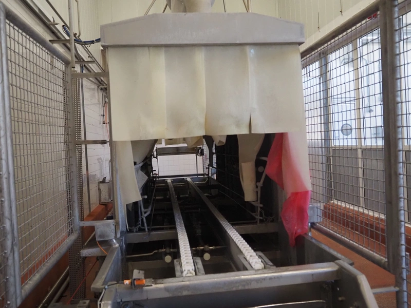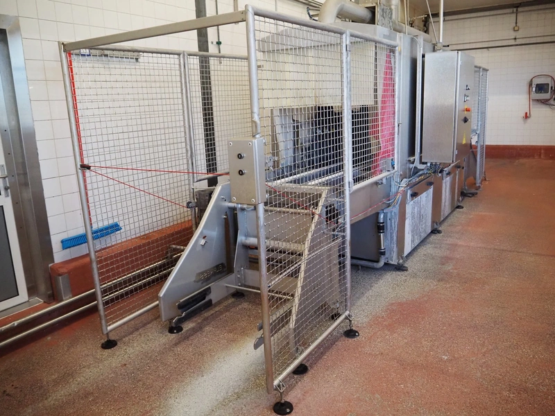 Elpress washing machine for meat bins, model: EKW 600, clearance: 800 mm x 800 mm, total dimensions: 8100 mm x 2050 mm x 3200 mm.