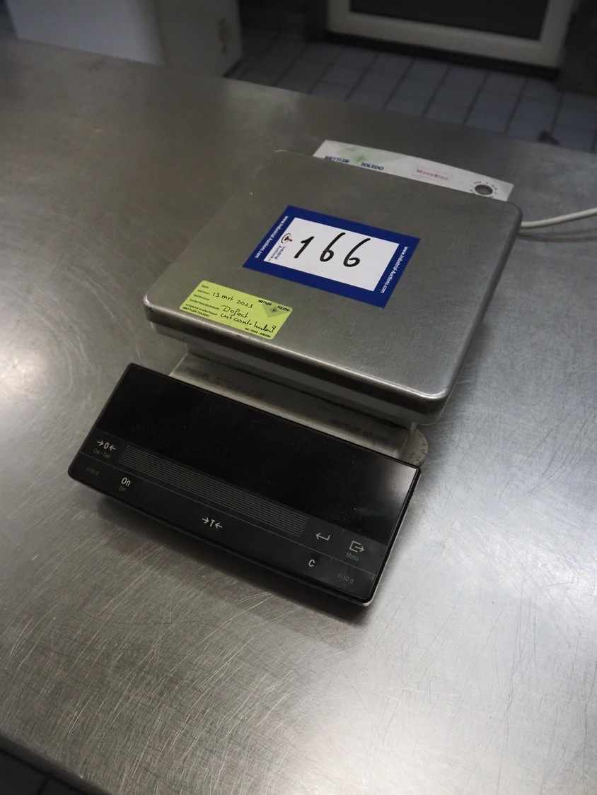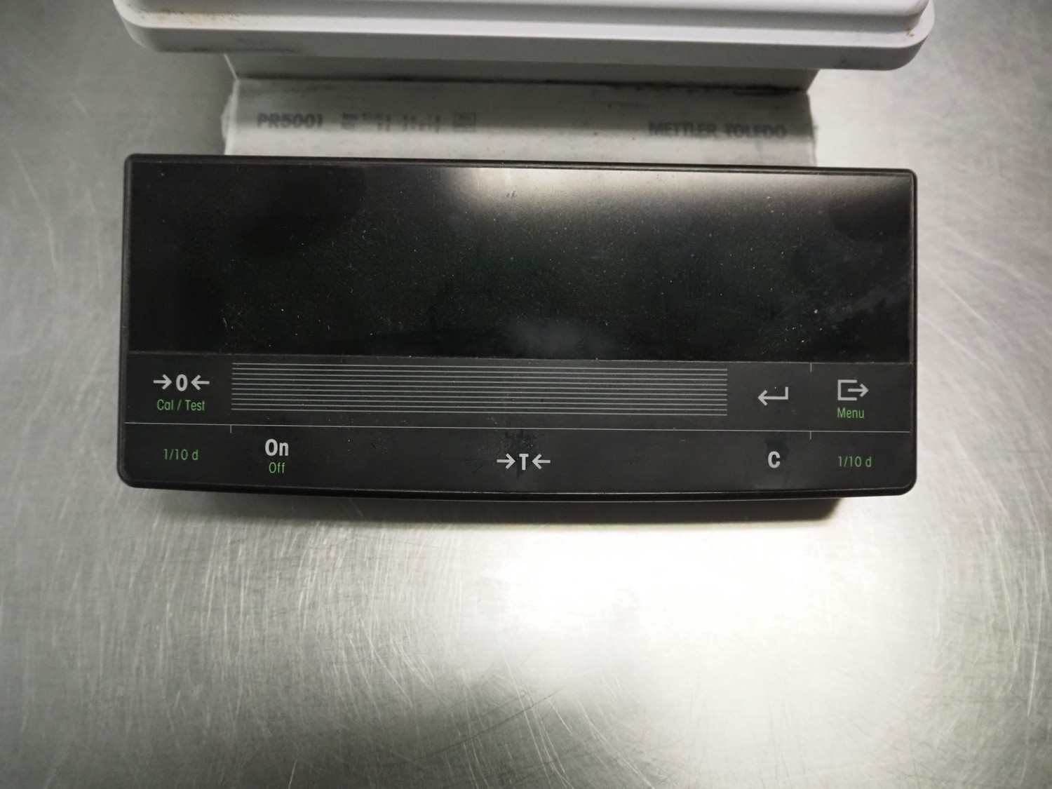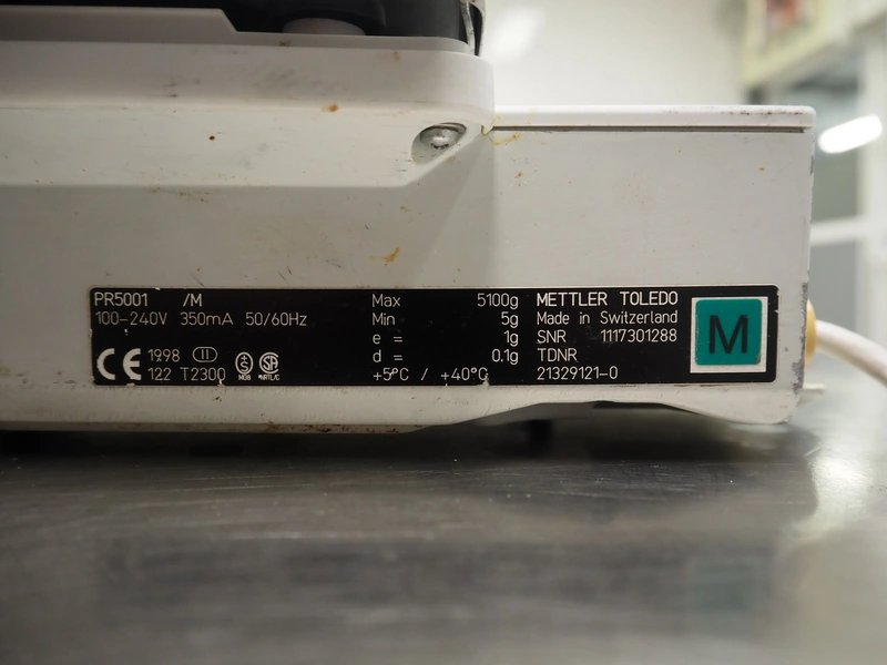Mettler Toledo weighing scale, model: PR5001 / M, 100-240 V, 50/60 Hz, maximum: 5100 gram, minimum: 5 gram, e: 1 gram, dimensions scale: 200 mm x 200 mm, total dimensions: 370 mm x 200 mm x 100 mm. Defect.
