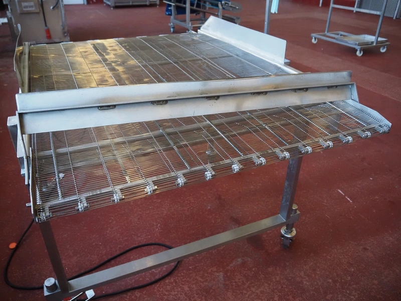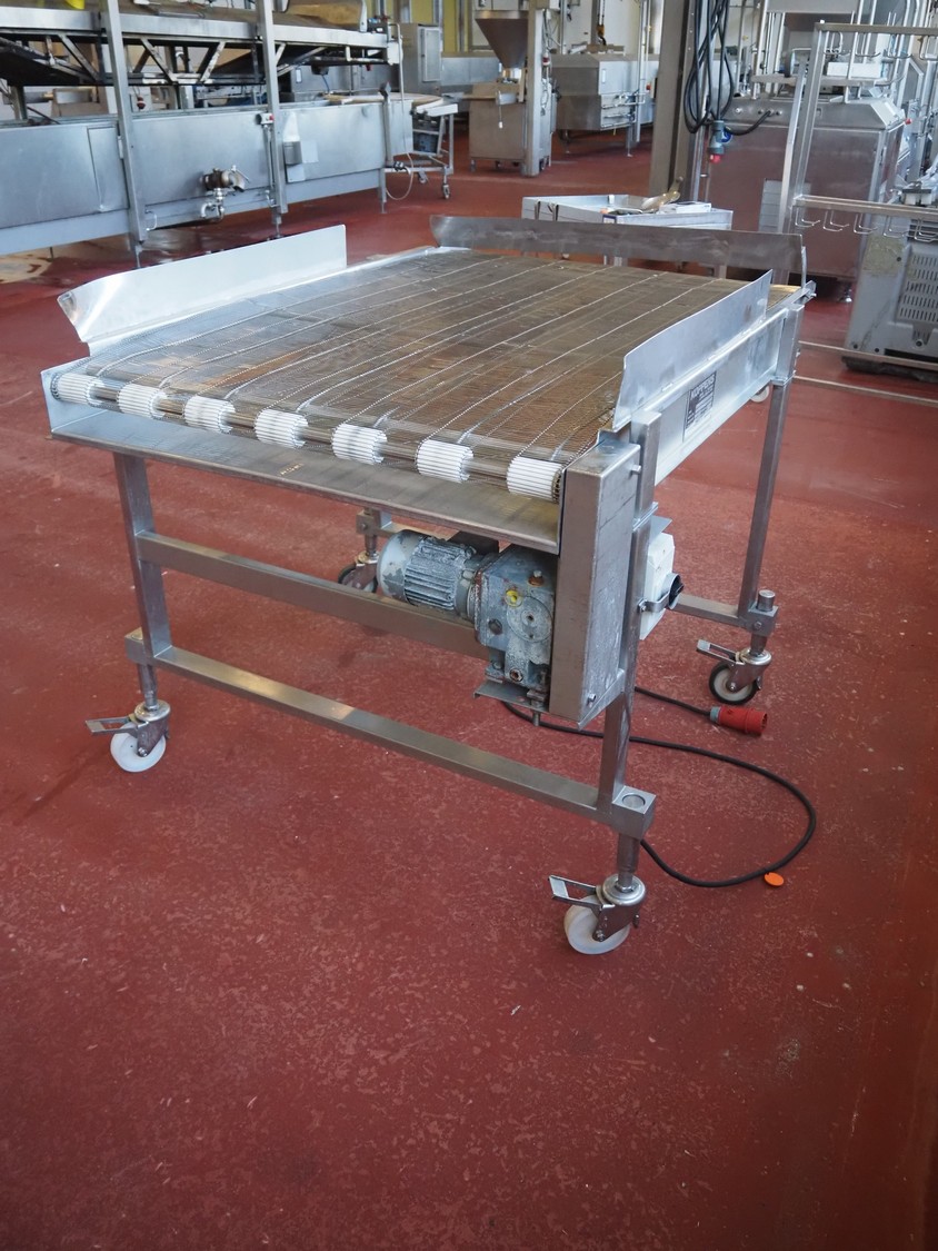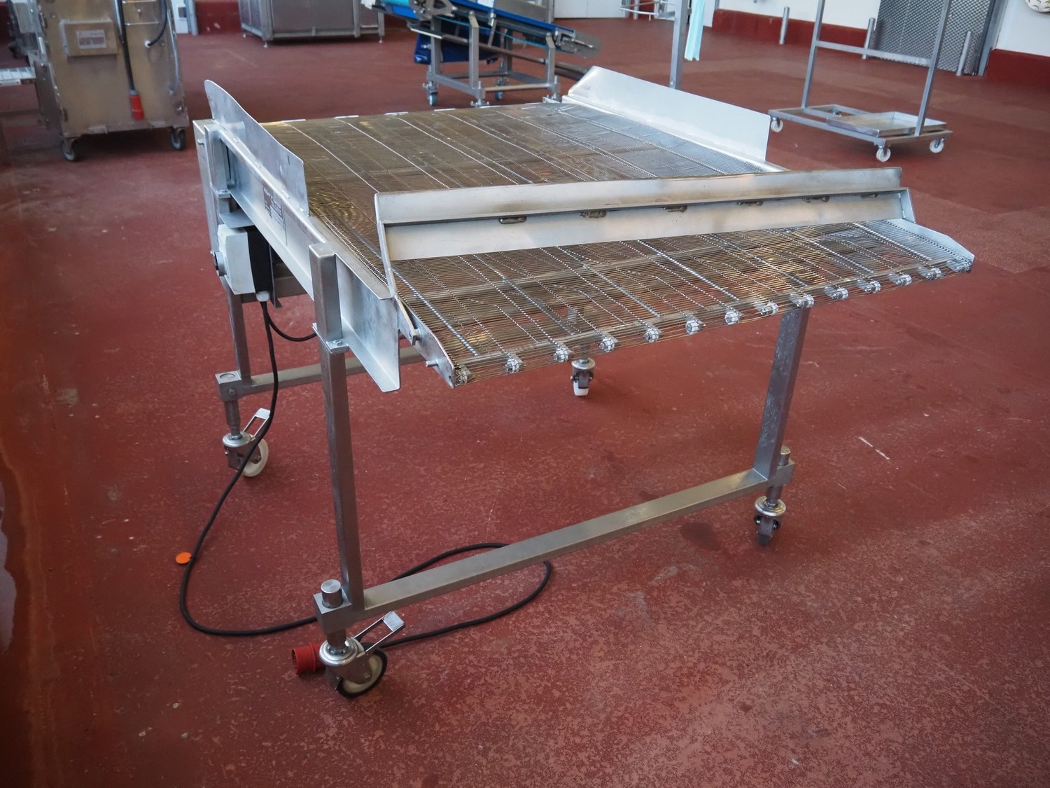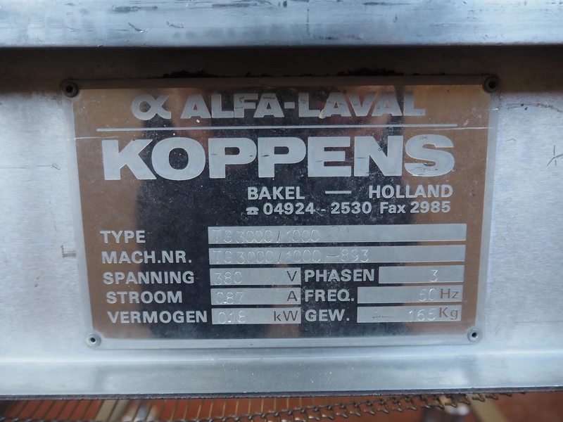 Koppens mobile mesh belt, type: TG 3000 / 1000, machine number: TG 3000 / 1000 - 893, 380 V, 3 Ph, 50 Hz, 0.87 A, 0.18 kW, weight: 165, s/s mesh belt, belt width: 1000 mm, total dimensions: 1600 mm x 1200 mm x 1150 mm.