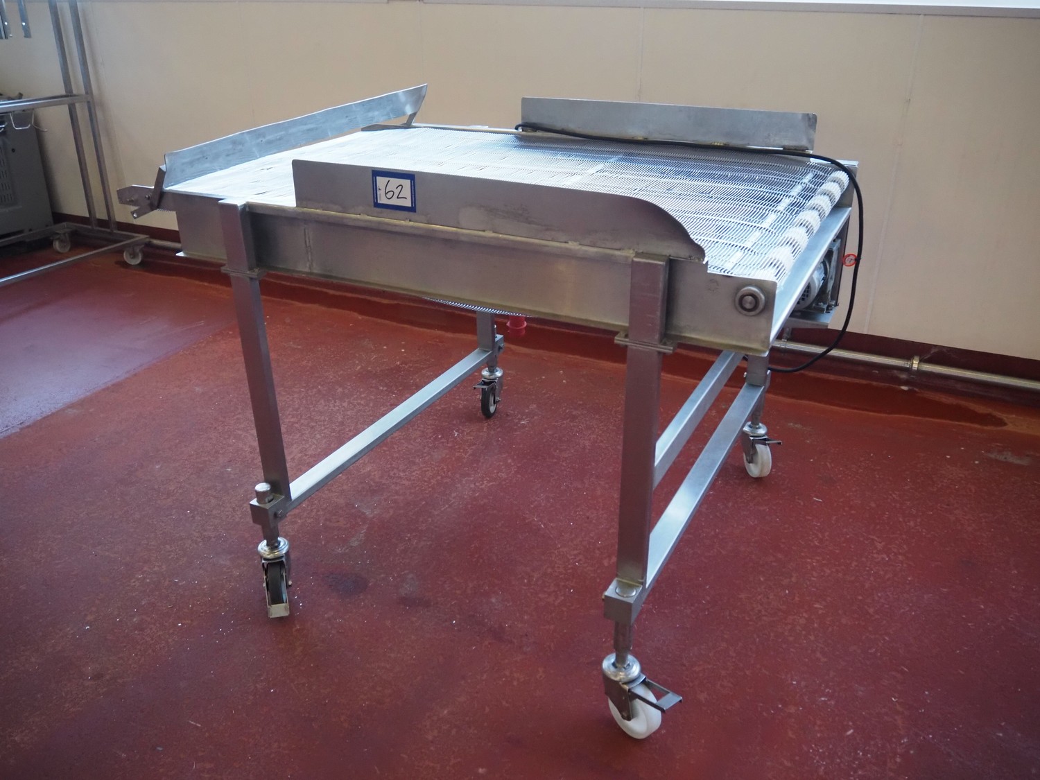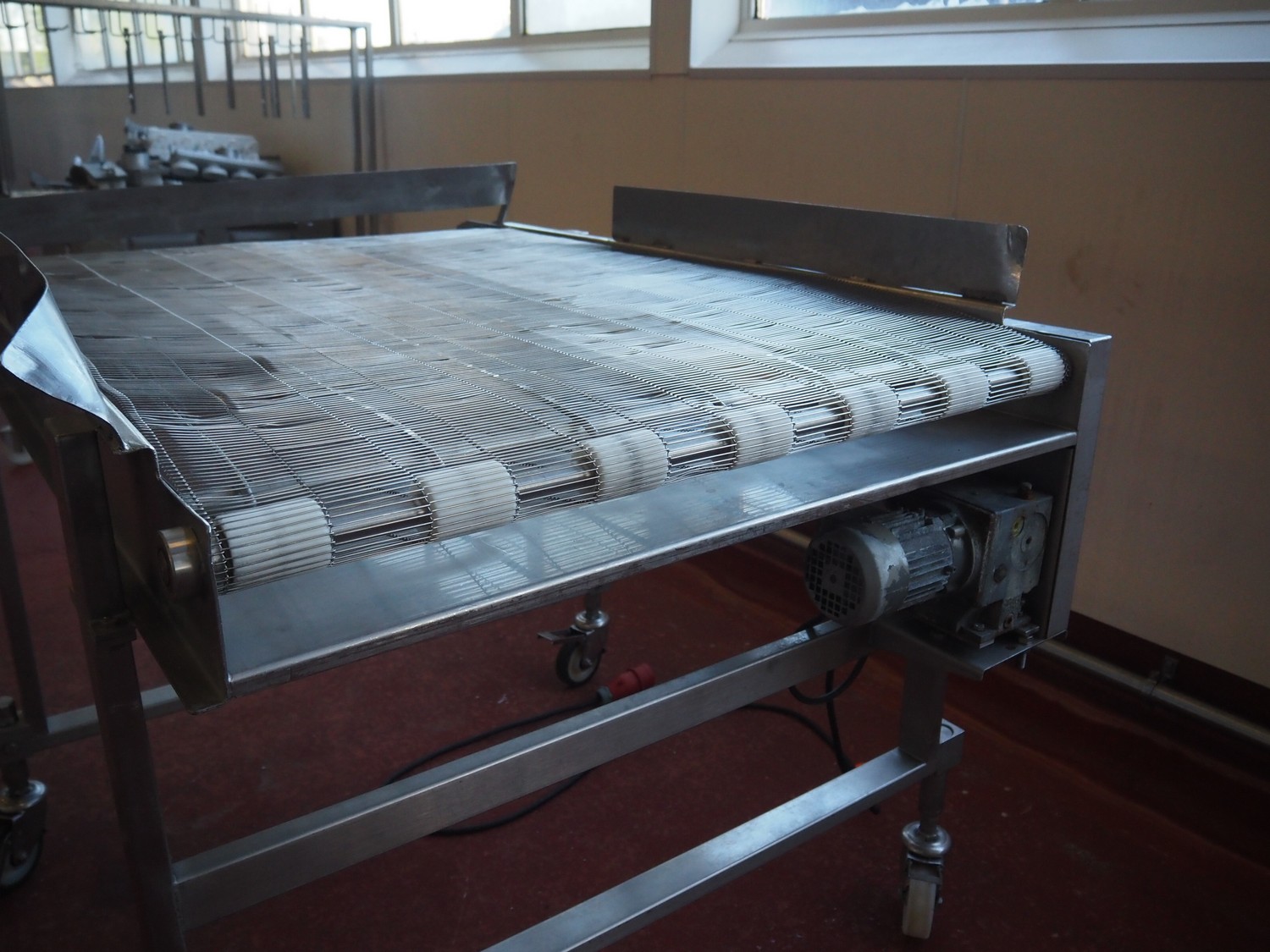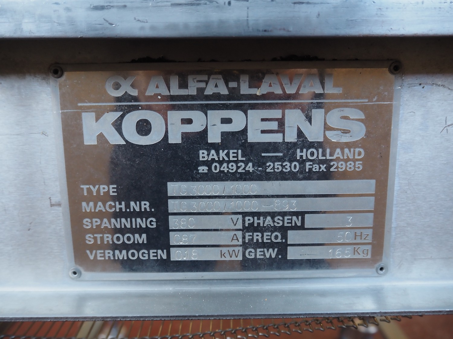 Koppens mobile mesh belt, type: TG 3000 / 1000, machine number: TG 3000 / 1000 - 893, 380 V, 3 Ph, 50 Hz, 0.87 A, 0.18 kW, weight: 165, s/s mesh belt, belt width: 1000 mm, total dimensions: 1600 mm x 1200 mm x 1150 mm.