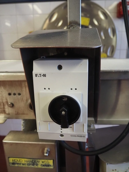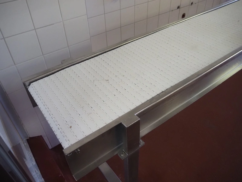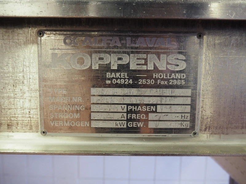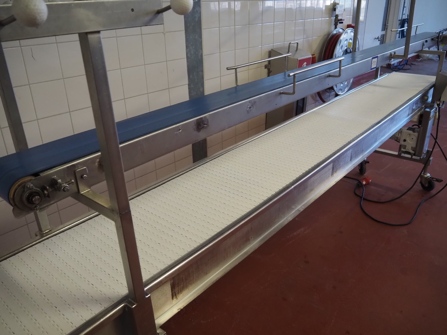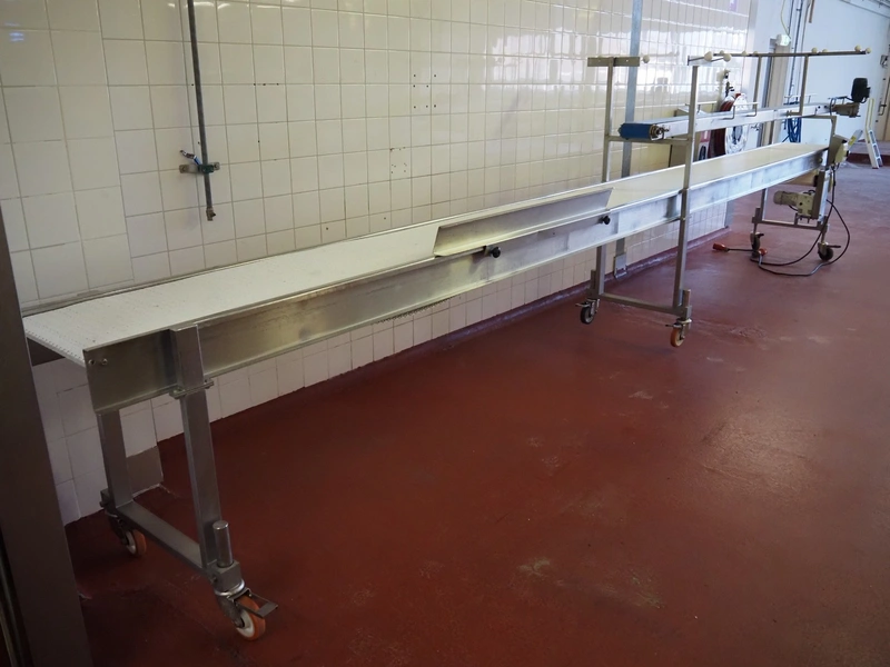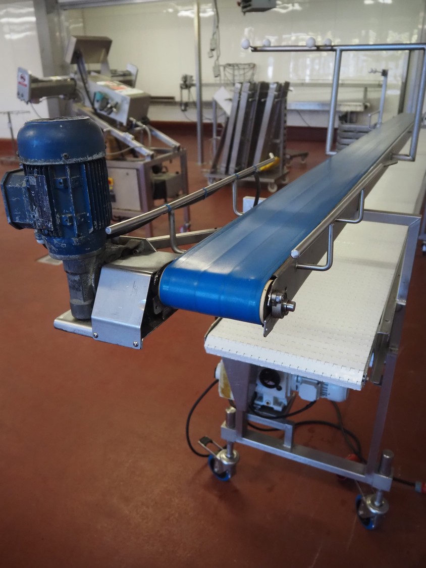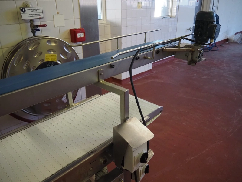 Koppens mobile transport belt, type: TG 6700 / 400, serial number: TG 6700 / 400 - 894, 380 V, 3 Ph, 50 Hz, 0.87 A, 0.18 kW, weight: 185 kg, s/s frame, plastic belt, belt width: 400 mm, including upper belt, belt width: 165 mm, total dimensions: 7200 mm x 1000 mm x 1700 mm.