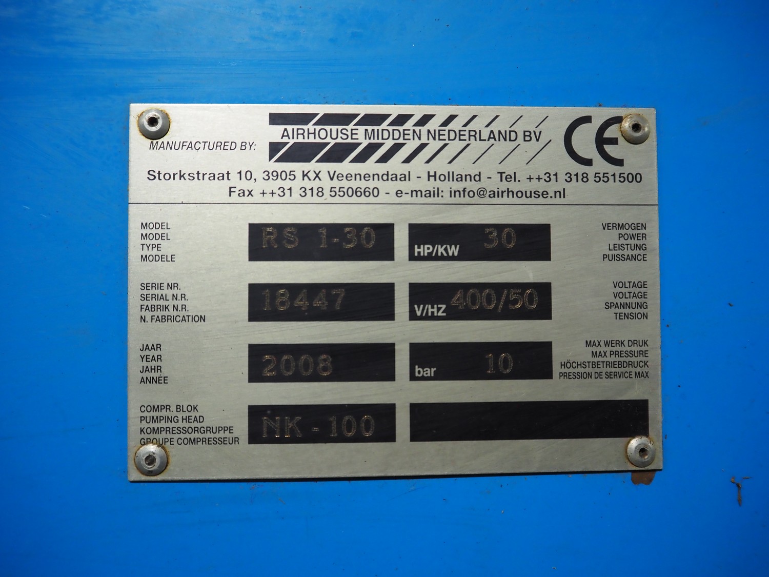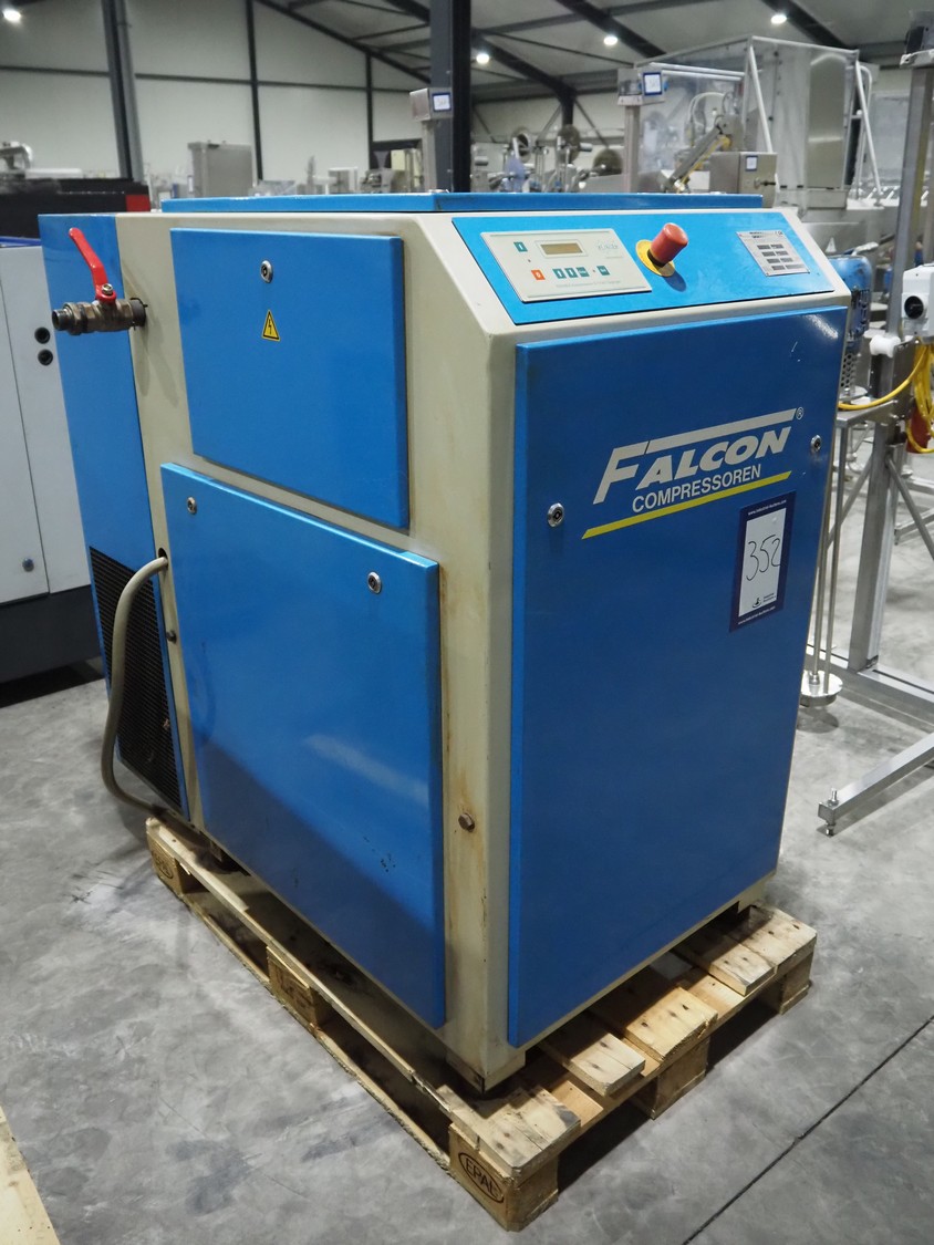 Falcon air compressor, type: RS1-30, serial number: 18447, year of construction: 2008, 400 V, 50 Hz, 30 kW, maximum pressure, dimensions: 1300 mm x 1000 mm x 1300 mm.