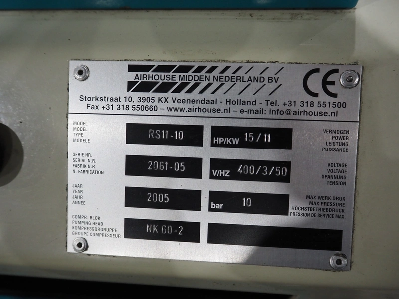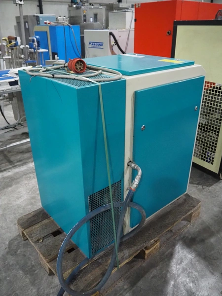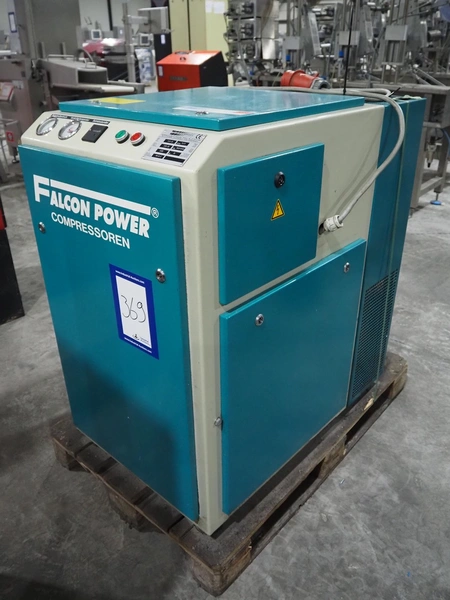 Falcon air compressor, type: RS11-10, serial number: 2061-05, year of construction: 2005, 400 V, 3 Ph, 50 Hz, maximum pressure: 10 bar, dimensions: 1000 mm x 750 mm x 1100 mm.