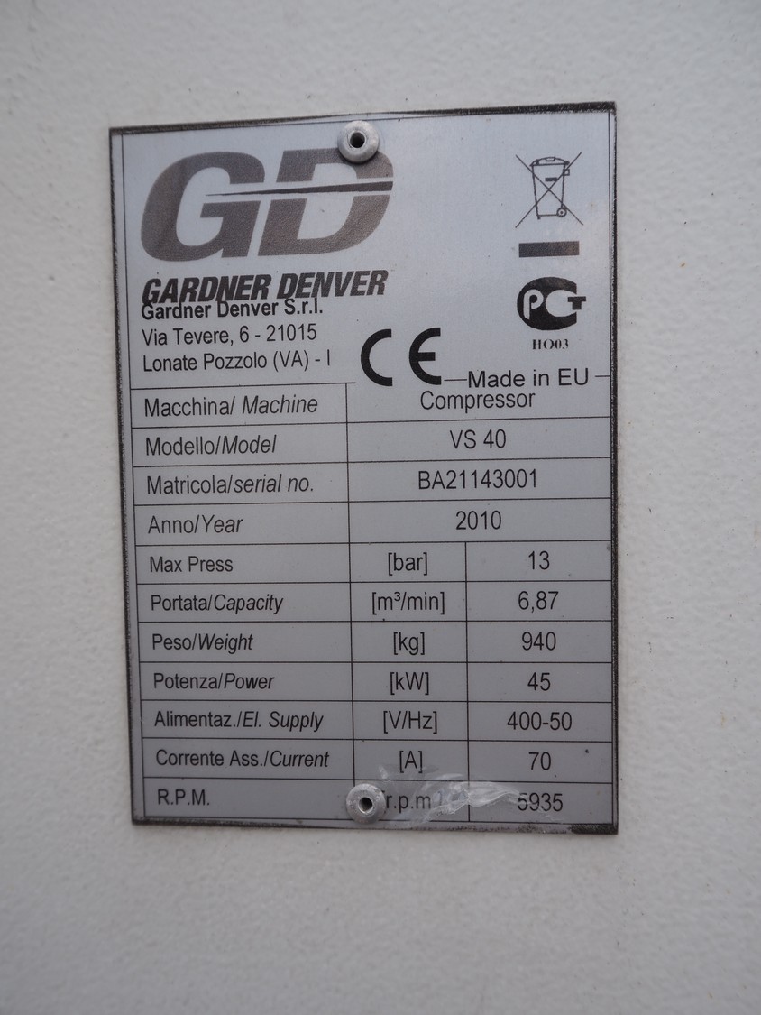 Gardner Denver air compressor, model: VS 40, serial number: BA21143001, year of construction: 2010, 400 V, 50 Hz, 70 A, 45 kW, capacity: 6.87 m³ per hour, 5935 rpm, 13 bar, weight: 940 kg, dimensions: 2000 mm x 900 mm x 2000 mm.