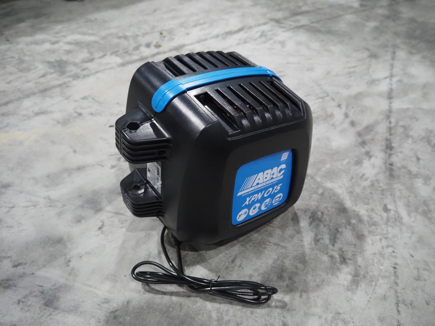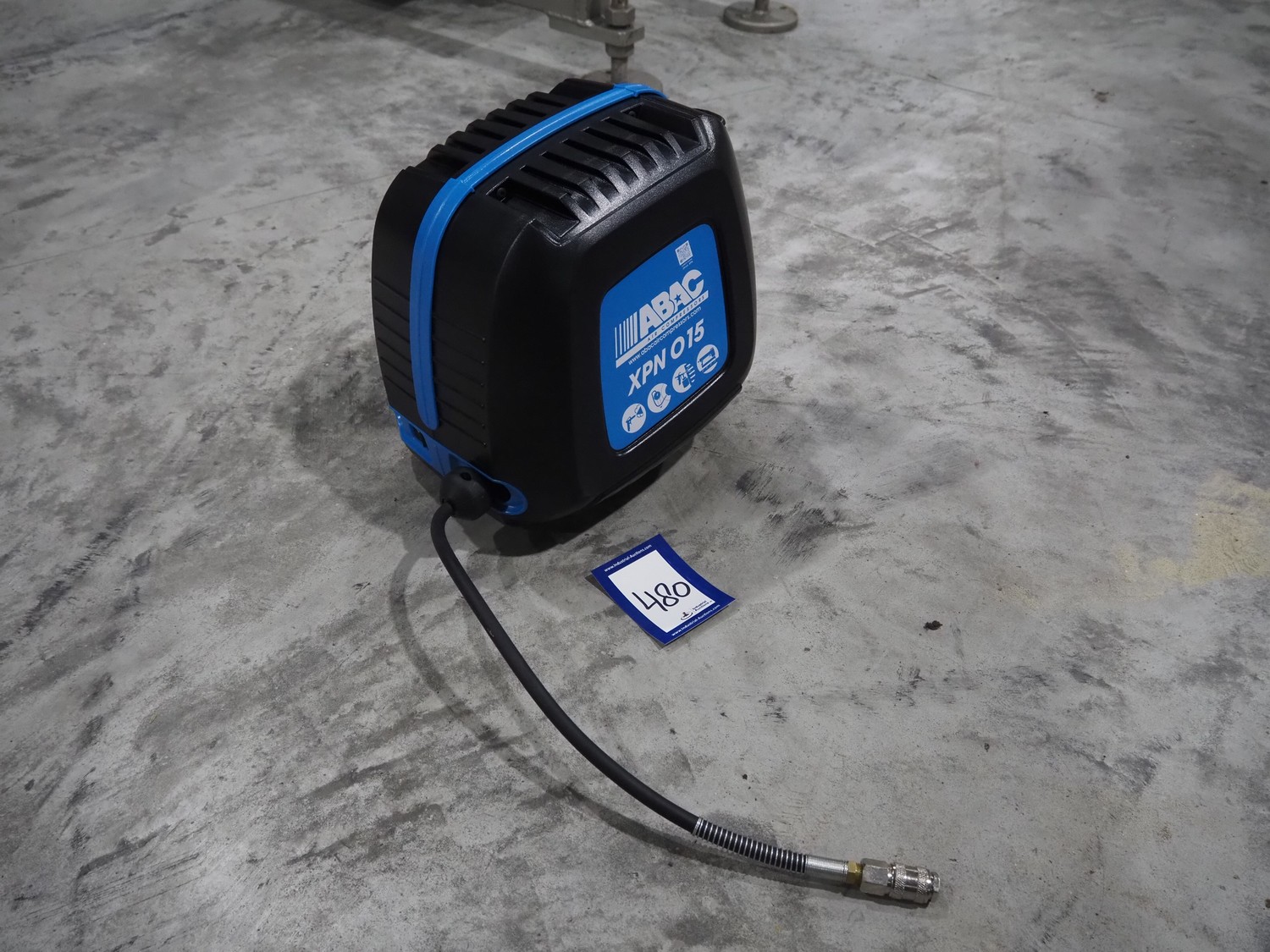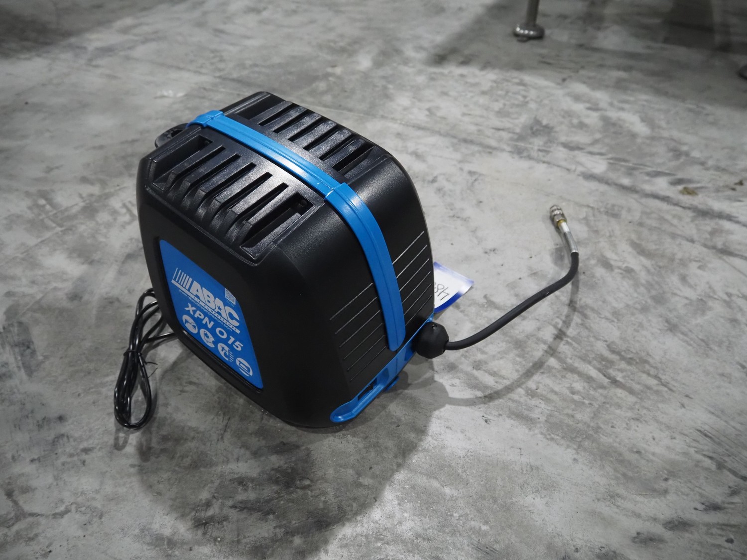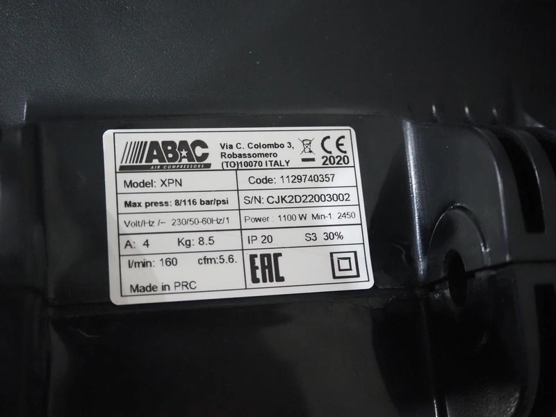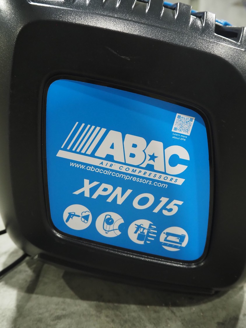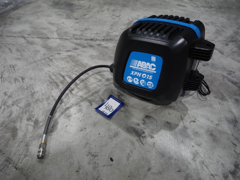 ABAC air compressors with hose reel, model: XPN, 230 V, 1 Ph, 50/60 Hz, 1100 W, weight: 8.5 kg, total dimensions: 400 mm x 250 mm x 300 mm.