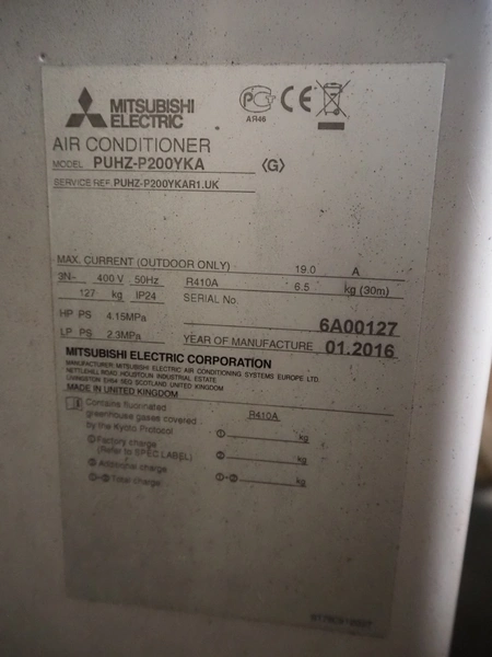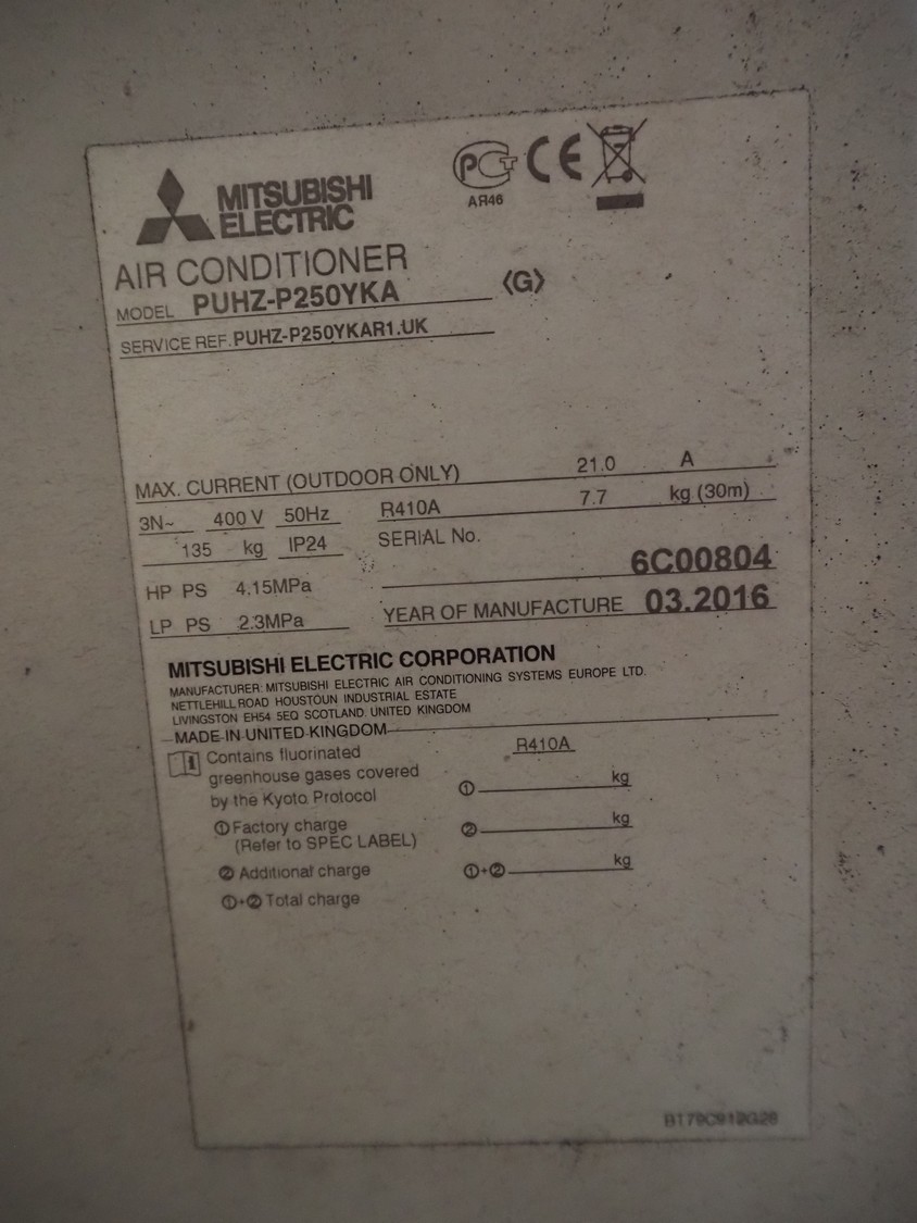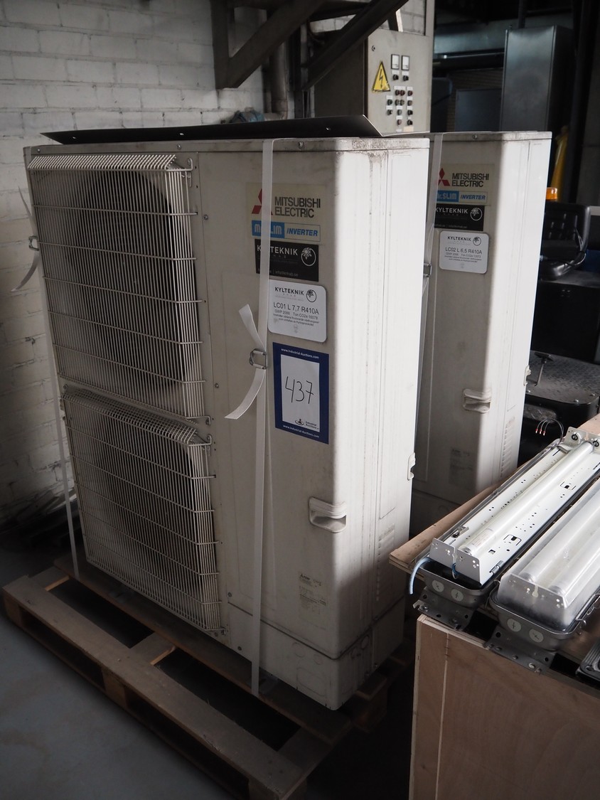 2 Mitsubishi air conditioners, model Mitsubishi air conditioner: (1x) PUHZ-P250YKA, serial number: 6C00804, year of construction: 03-2016, 400 V, 3 Ph, 50 Hz, 21 A, refrigerant: R110a, 7.7 kg, weight: 135 kg, (1x) PUHZ P200127, serial number: 6A00127, year of construction: 01-2016, 400 V, 3 Ph, 50 Hz, 19 A, refrigerant: R410a, 6.5 kg, weight: 127 kg, dimensions ventilator: 3850 mm x 1750 mm x 1780 mm, dimensions air conditioners: (2x) 1050 mm x 400 mm x 1350 mm.