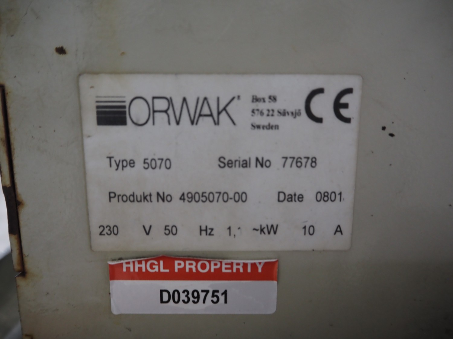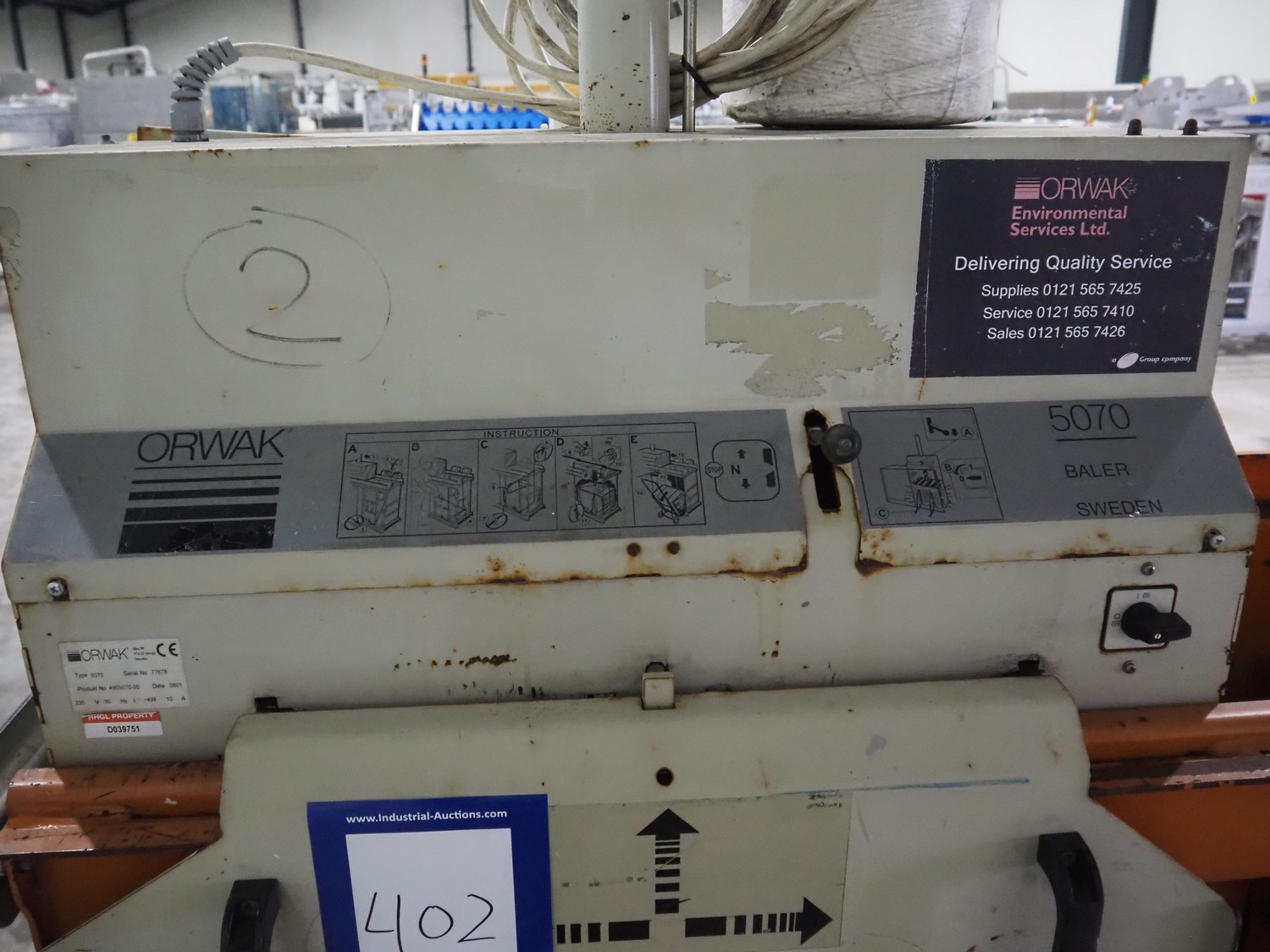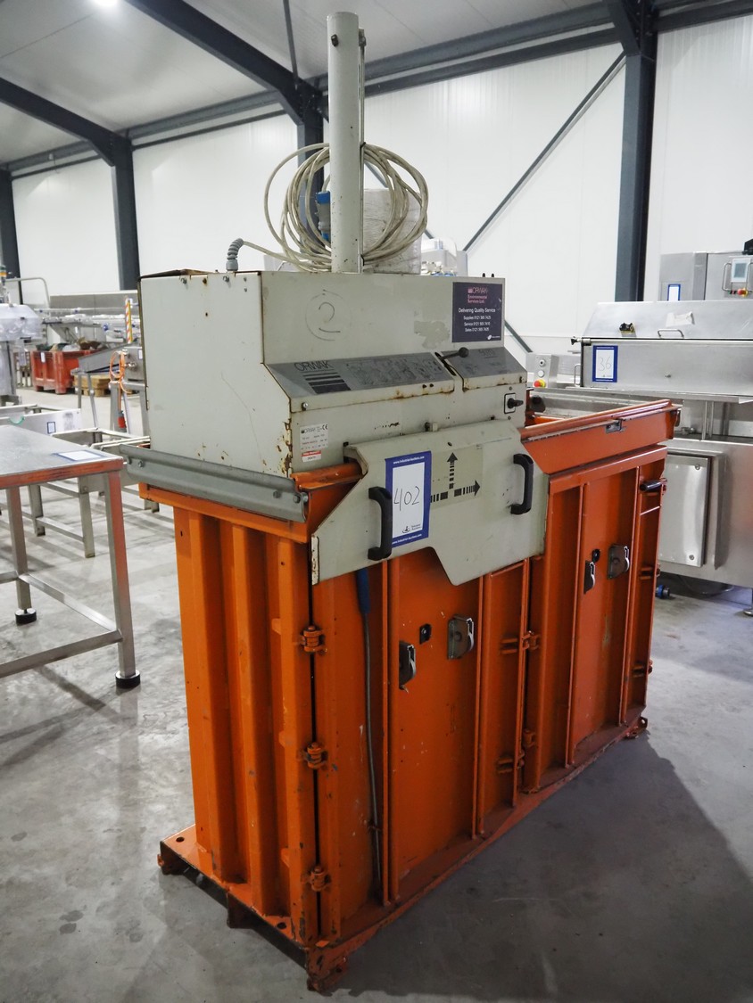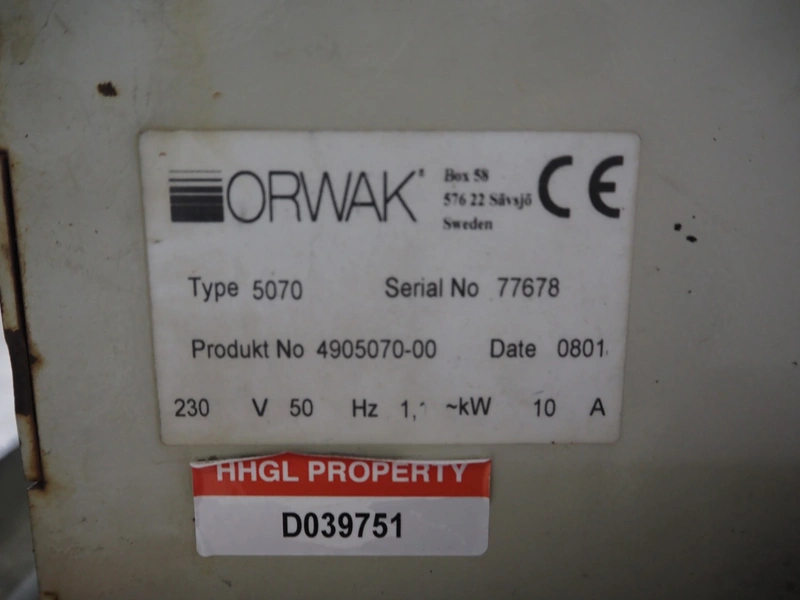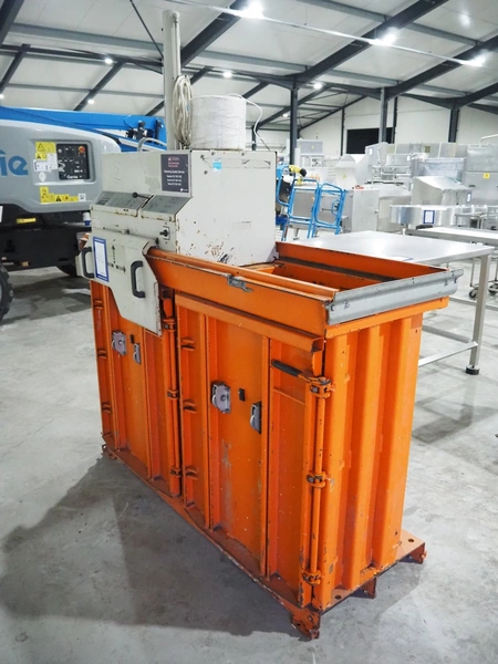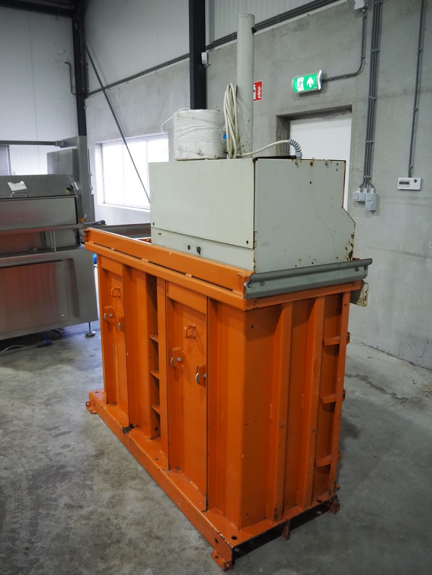 Orwak baler, type: 5070, serial number: 77678, 230 V, 1 Ph, 50 Hz, 10 A, 1.1 kW, inside dimensions: 700 mm x 500 mm x 1000 mm, total dimensions: 1800 mm x 750 mm x 2150 mm.