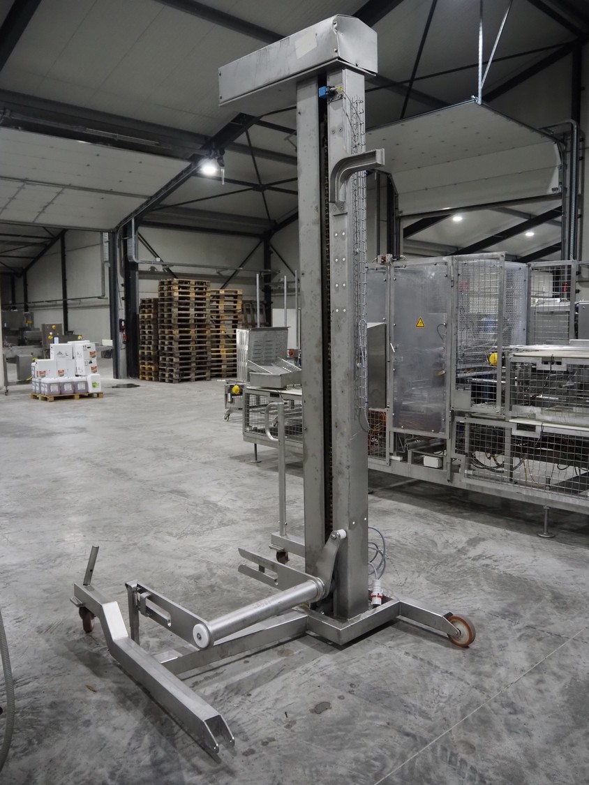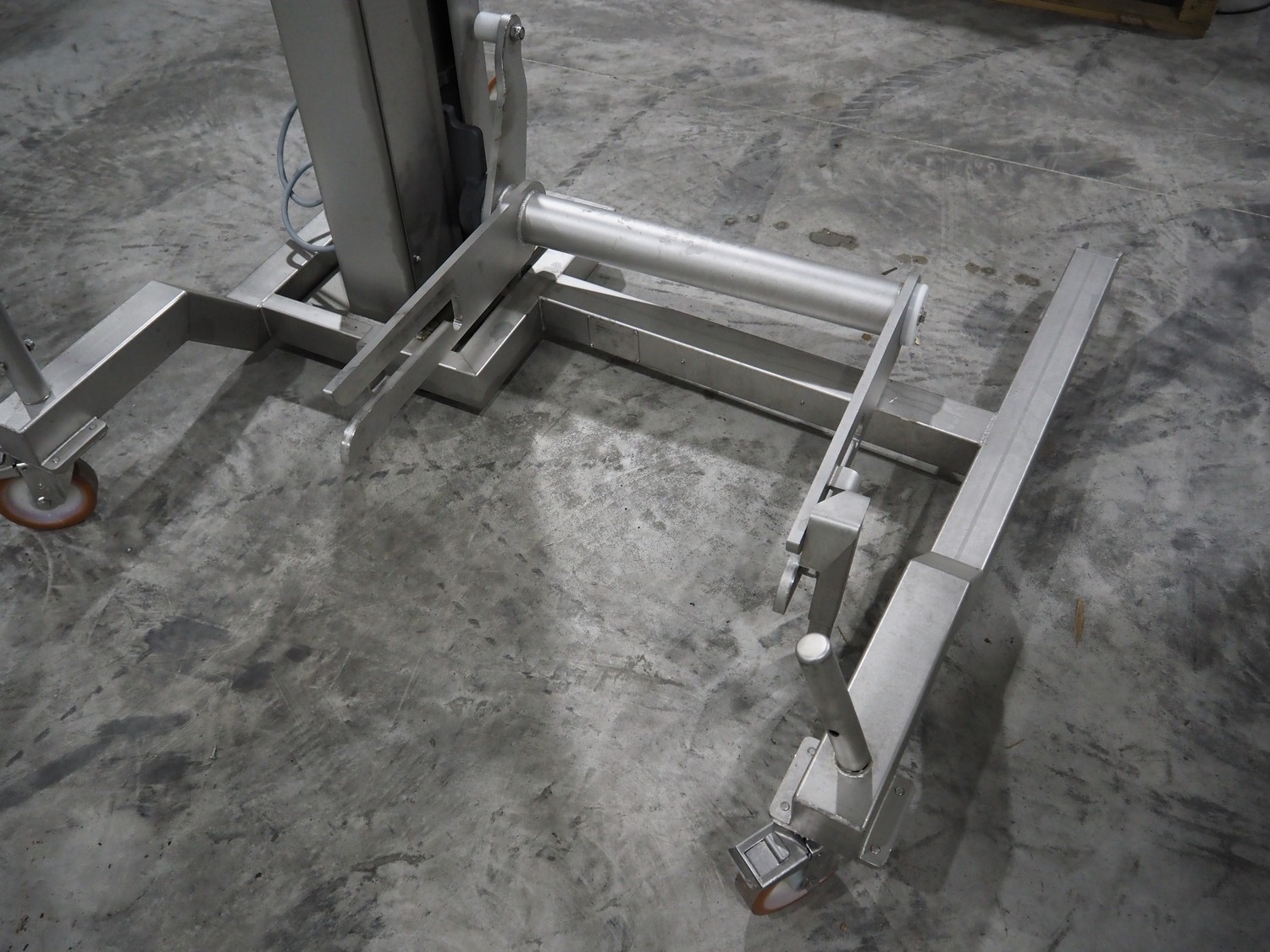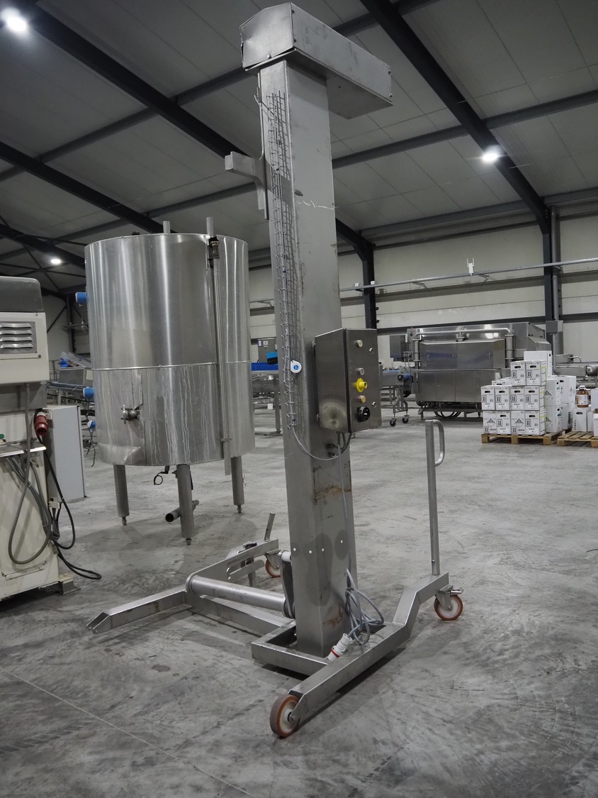 Marel mobile lifter for 200 liter meat bins, model: L25, type: PM1114, 400 V, 3 Ph, 50 Hz, 1.9 A, lifting height: 2300 mm, total dimensions: 1450 mm x 1500 mm x 2980 mm.