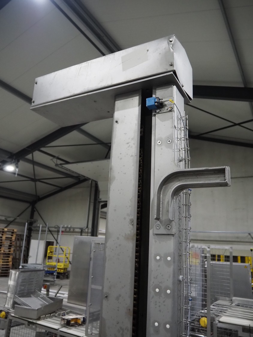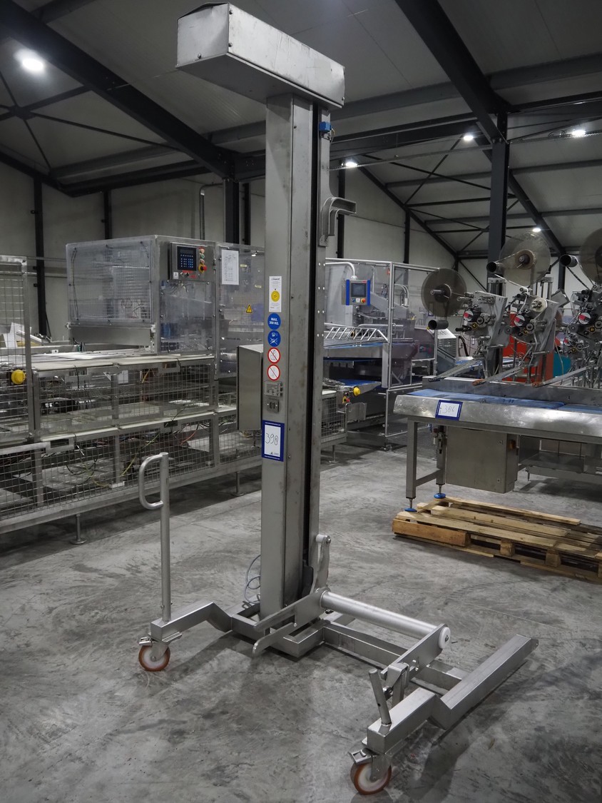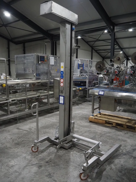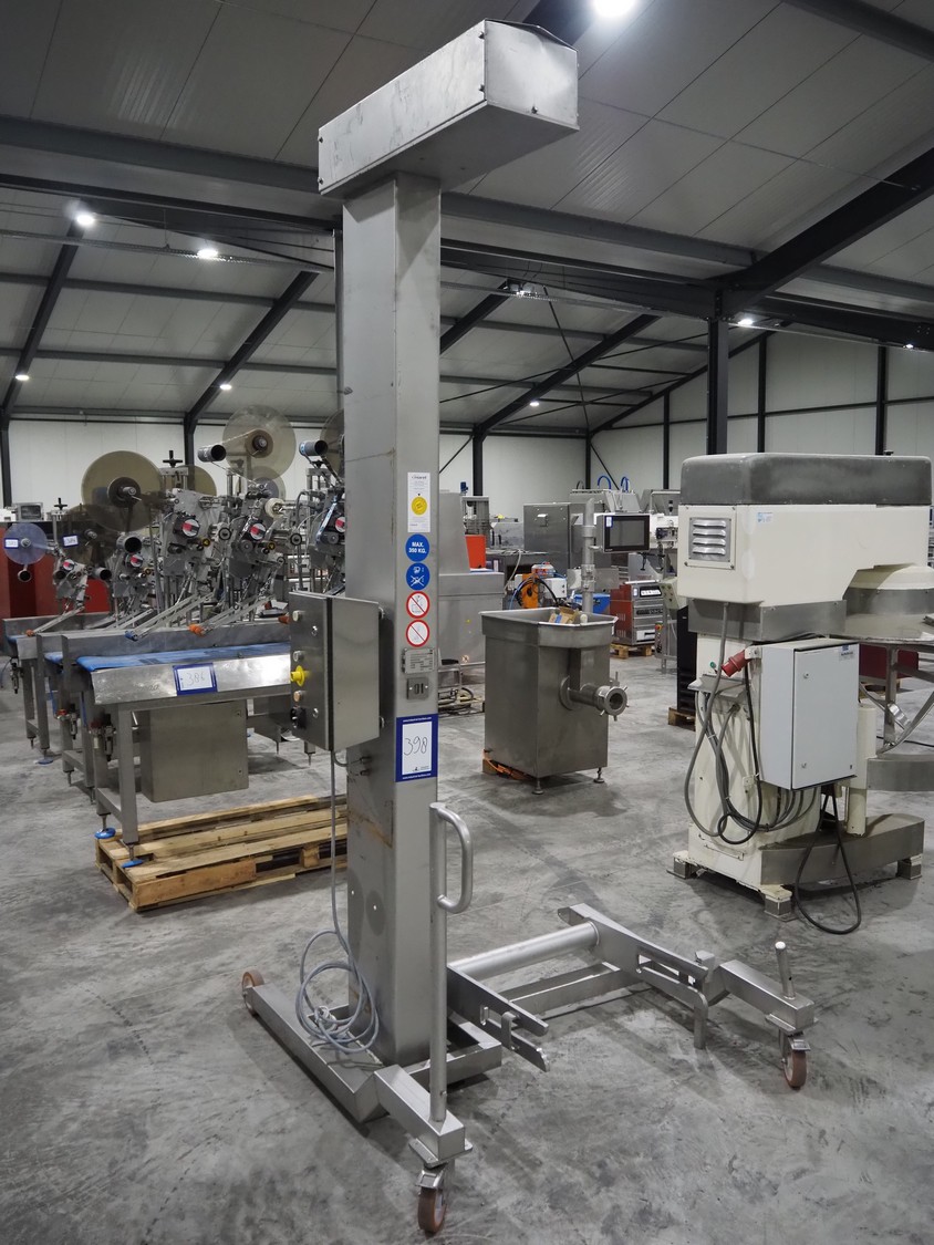 Marel mobile lifter for 200 liter meat bins, model: L25, type: PM1114, 400 V, 3 Ph, 50 Hz, 1.9 A, lifting height: 2300 mm, total dimensions: 1450 mm x 1500 mm x 2980 mm.