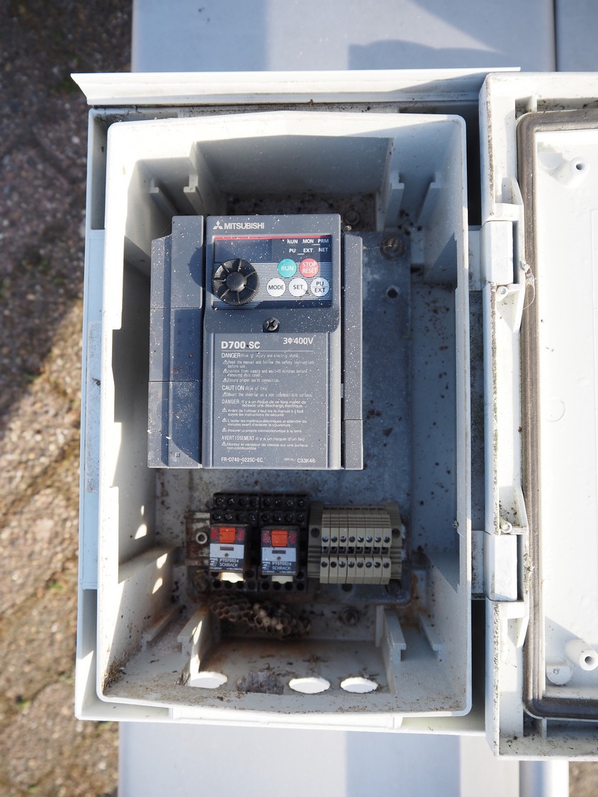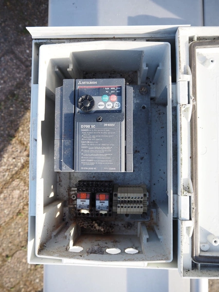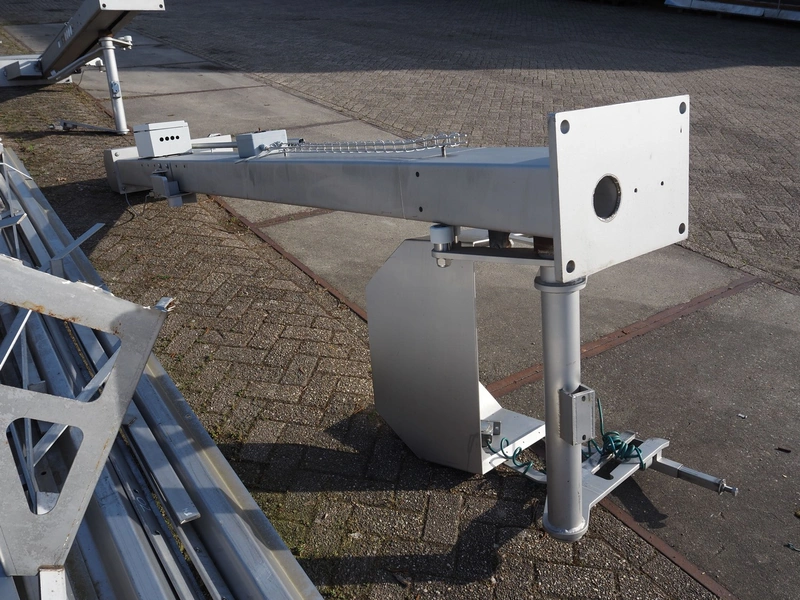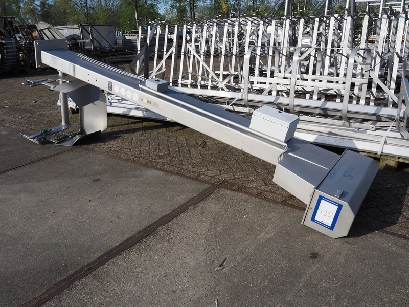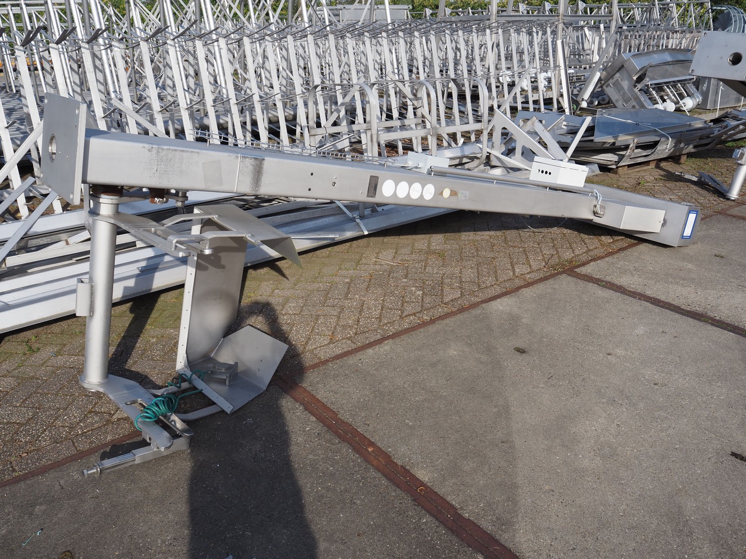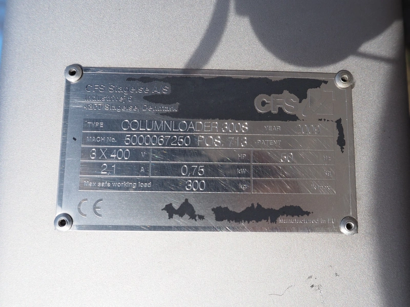 CFS s/s lifter for 200 liter meat bins, type: Columnloader 300S, serial number: 5000067250 POS. 711, year of construction: 2009, 400 V, 3 Ph, 50 Hz, 2.0 A, 0.75 kW, capacity: 300 kg, lifting height: 2400 mm, total dimensions: 1130 mm x 660 mm x 3700 mm.