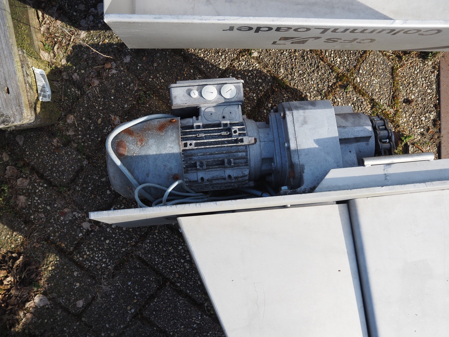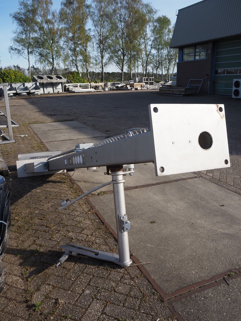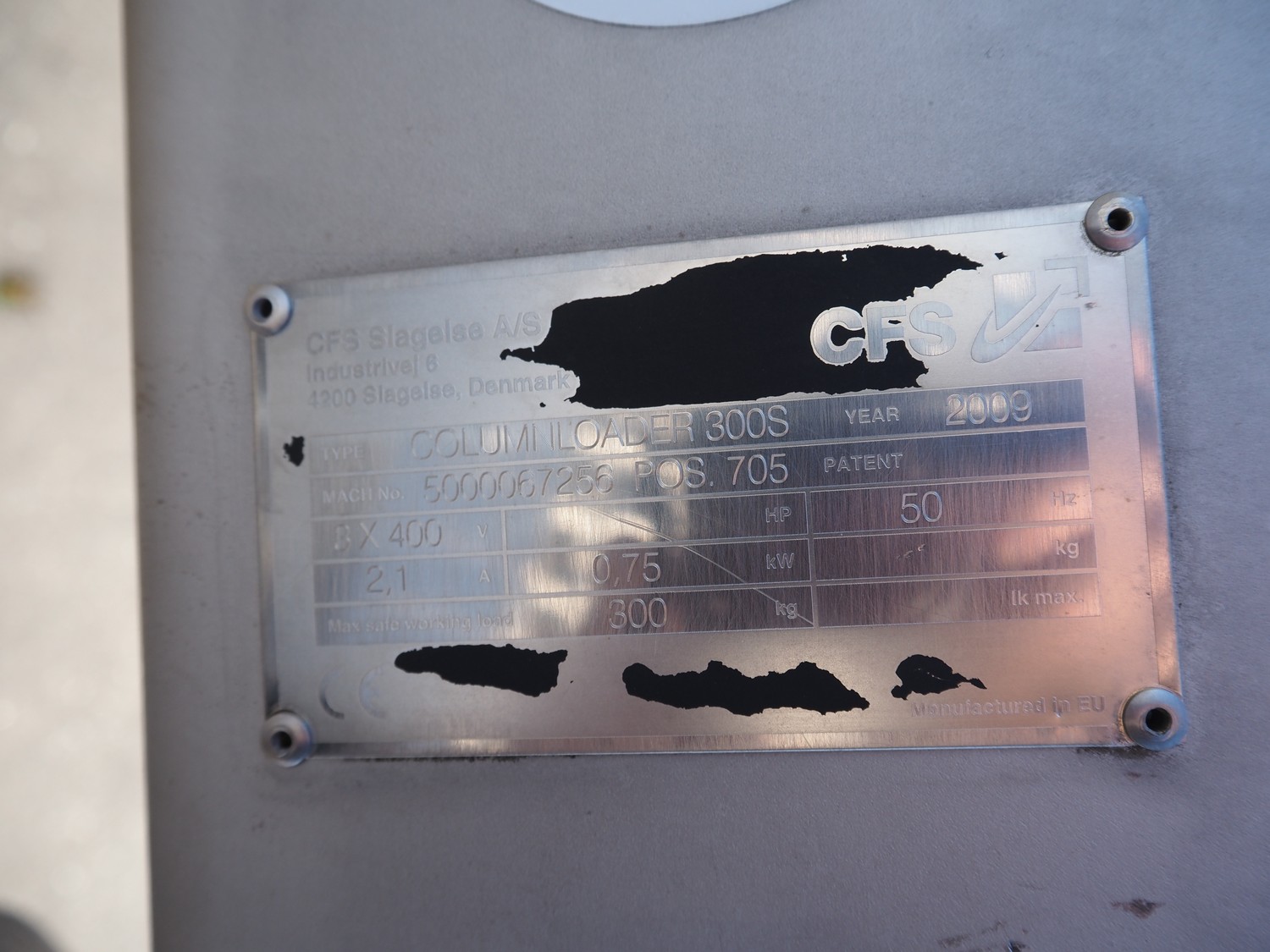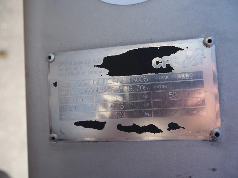 CFS s/s lifter for 200 liter meat bins, type: Columnloader 300S, serial number: 5000067256 POS. 705, year of construction: 2009, 400 V, 3 Ph, 50 Hz, 2.1 A, 0.75 kW, capacity: 300 kg, lifting height: 2400 mm, total dimensions: 1130 mm x 660 mm x 3700 mm. Damaged.