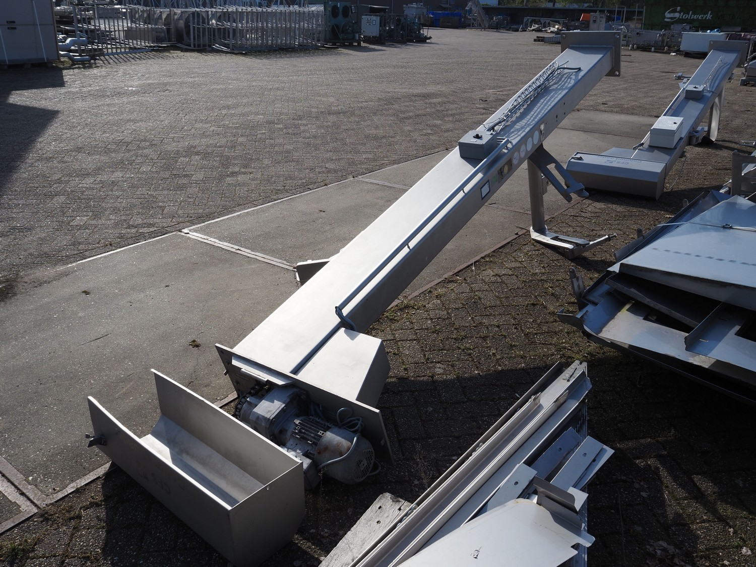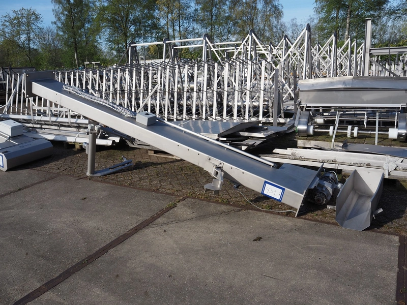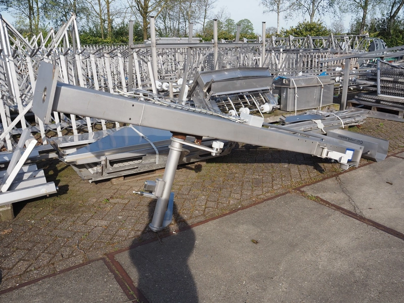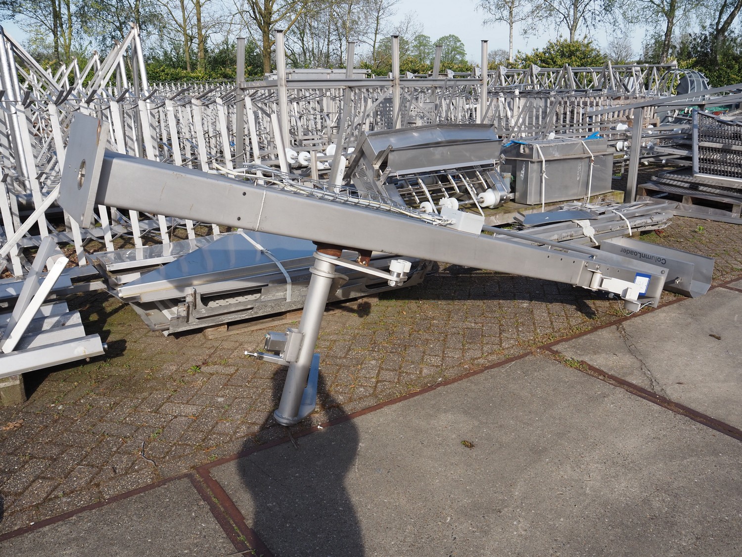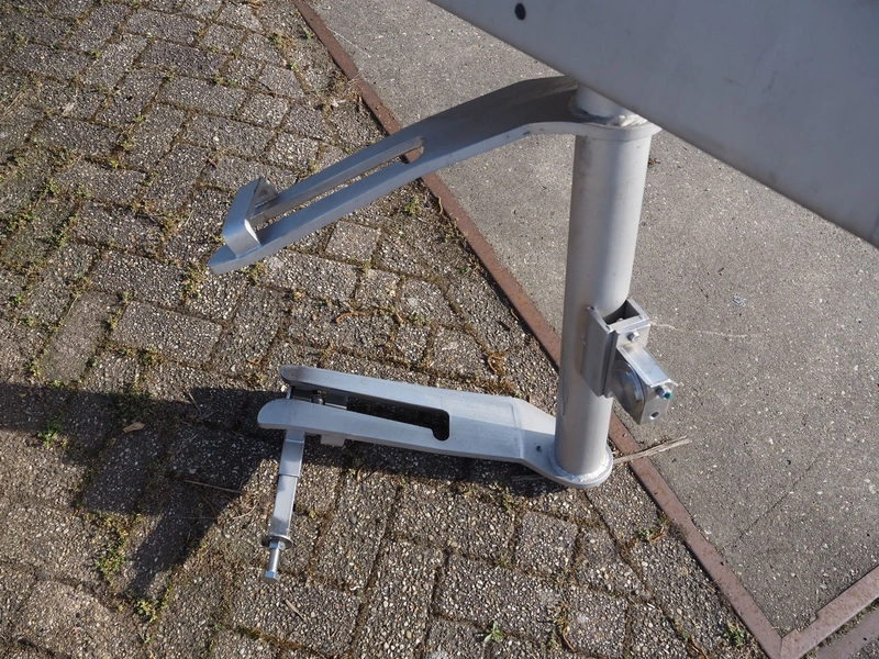 CFS s/s lifter for 200 liter meat bins, type: Columnloader 300S, serial number: 5000067256 POS. 705, year of construction: 2009, 400 V, 3 Ph, 50 Hz, 2.1 A, 0.75 kW, capacity: 300 kg, lifting height: 2400 mm, total dimensions: 1130 mm x 660 mm x 3700 mm. Damaged.