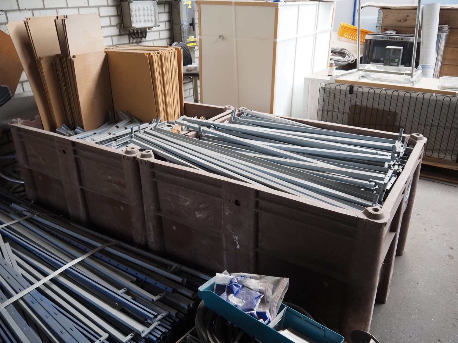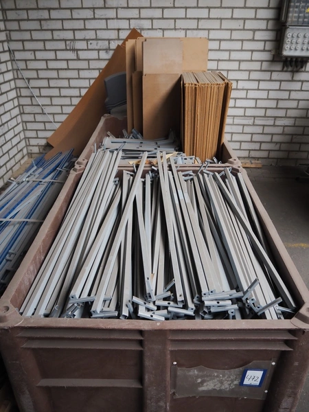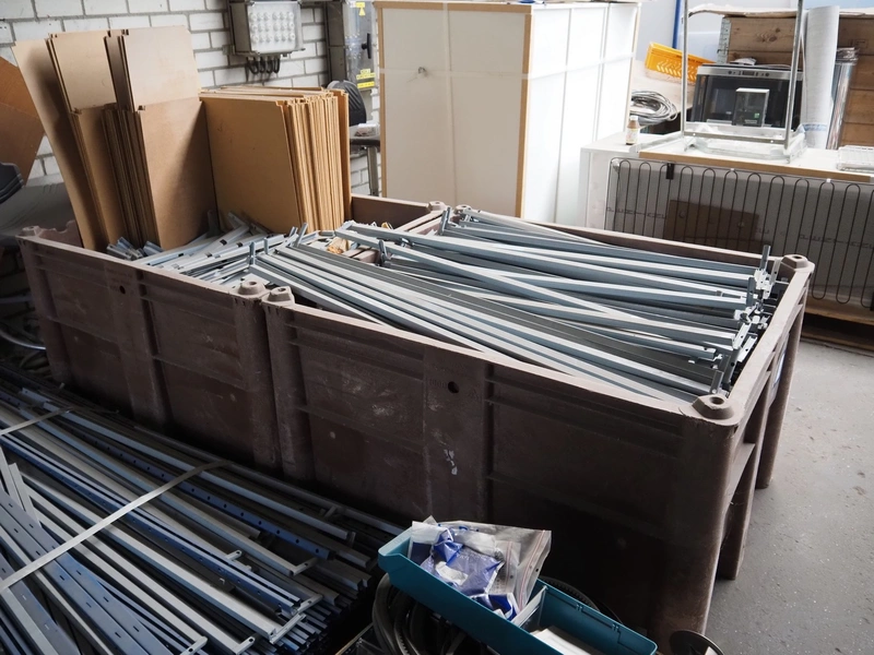2 pallet boxes and pallet with storage rack, dimensions uprights: 2000 mm x 580 mm, length beams: 1070 mm.