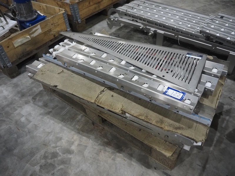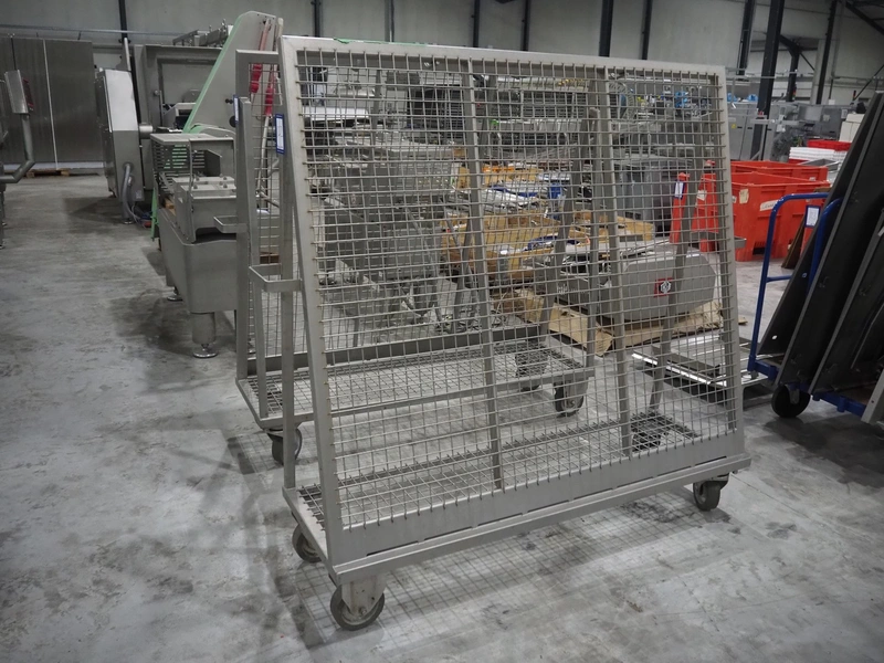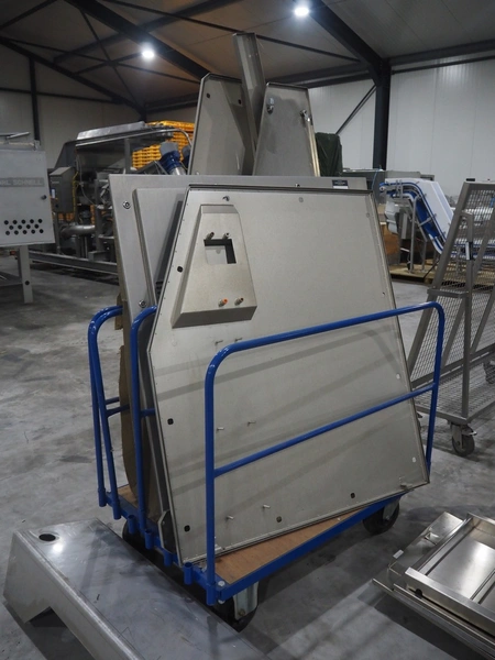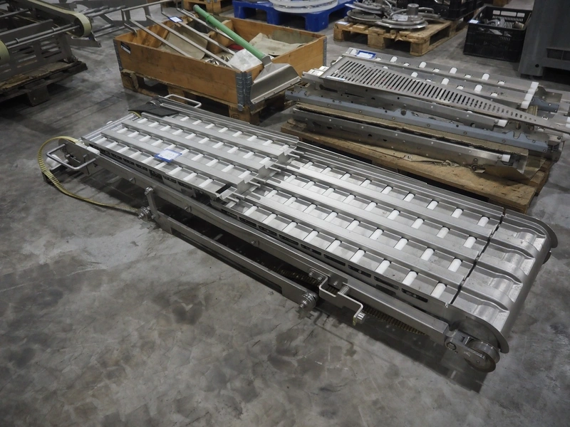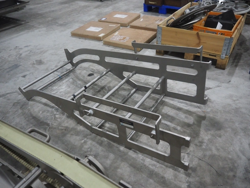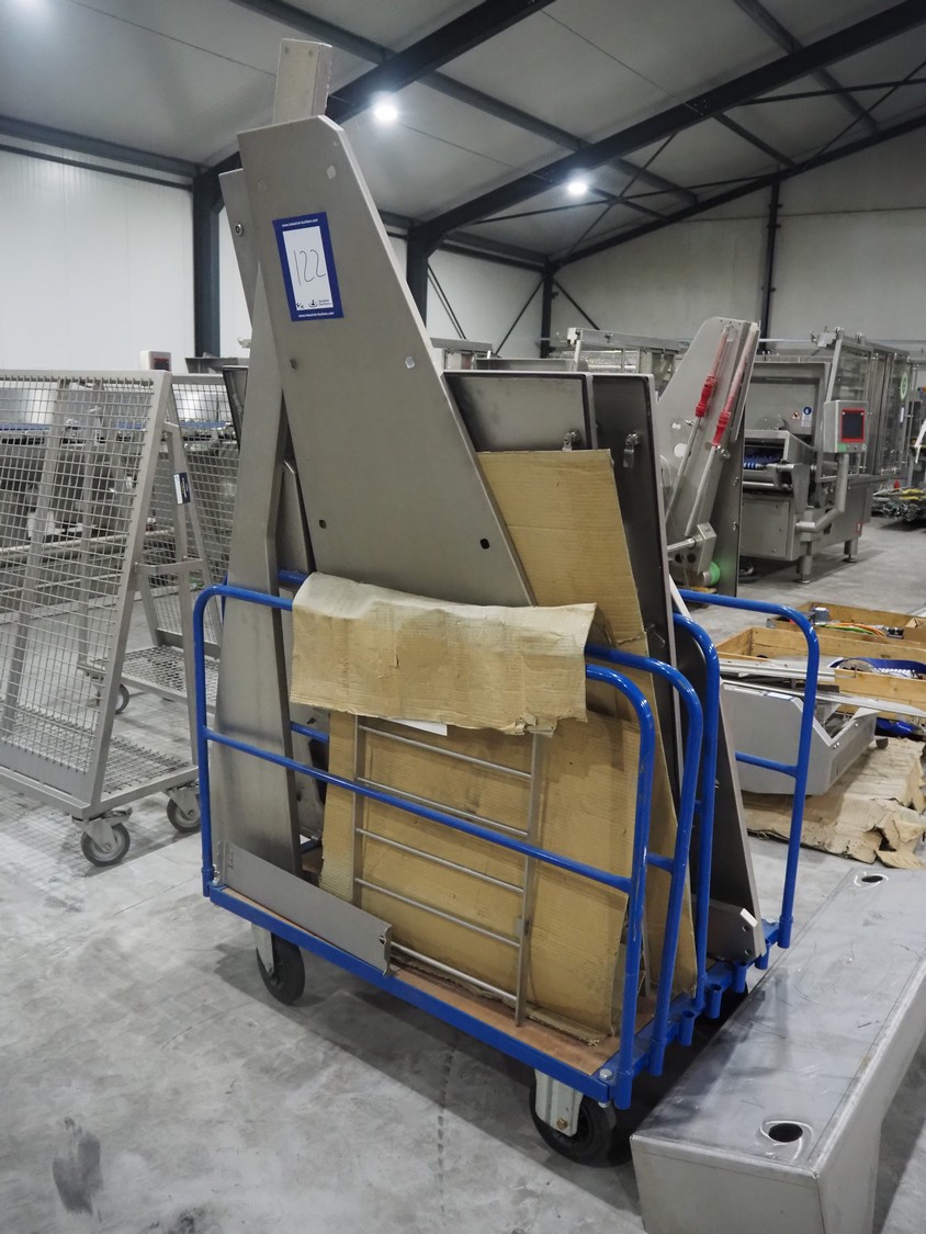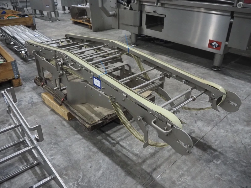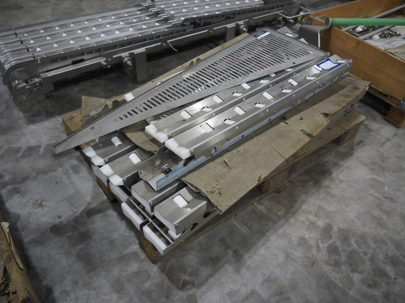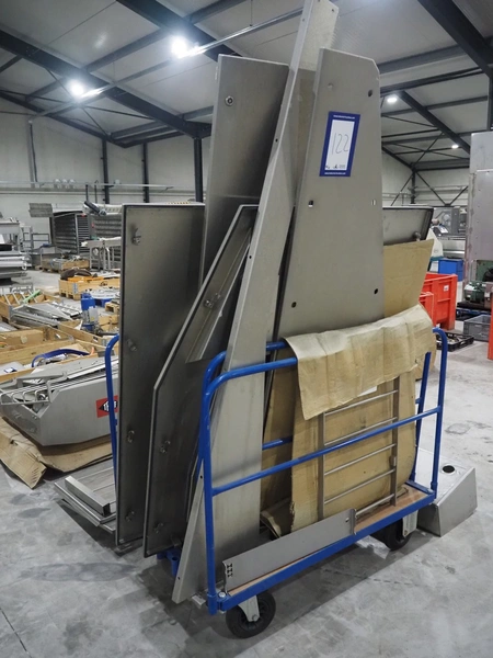Large amount of different parts for Treif Maschinenbau GmbH Divider 880 slicer line, among others: conveyors, lane dividing belts, s/s covers, moulds and trolleys.
