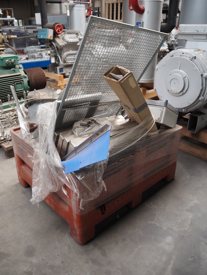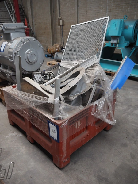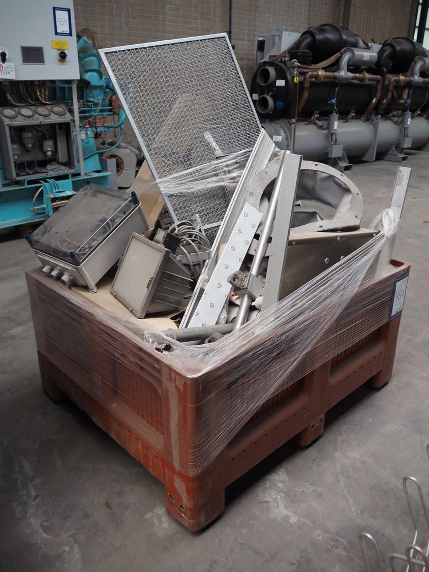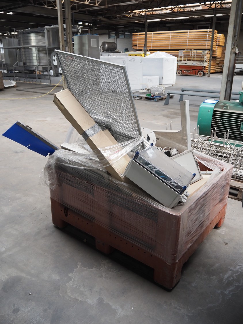 Pallet box with various parts, dimensions: 1200 mm x 1000 mm x 1500 mm.
