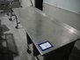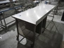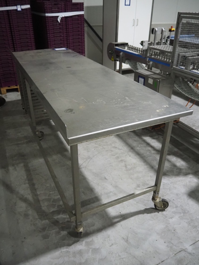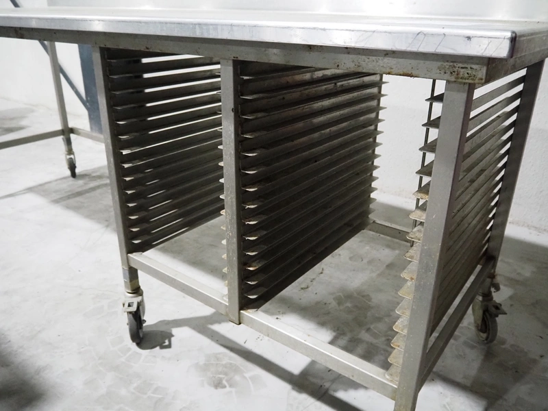 Mobile s/s table, 15 floors, (15x) dimensions: 580 mm x 405 mm, total dimensions: 2600 mm x 850 mm x 1040 mm. 3 wheels missing.