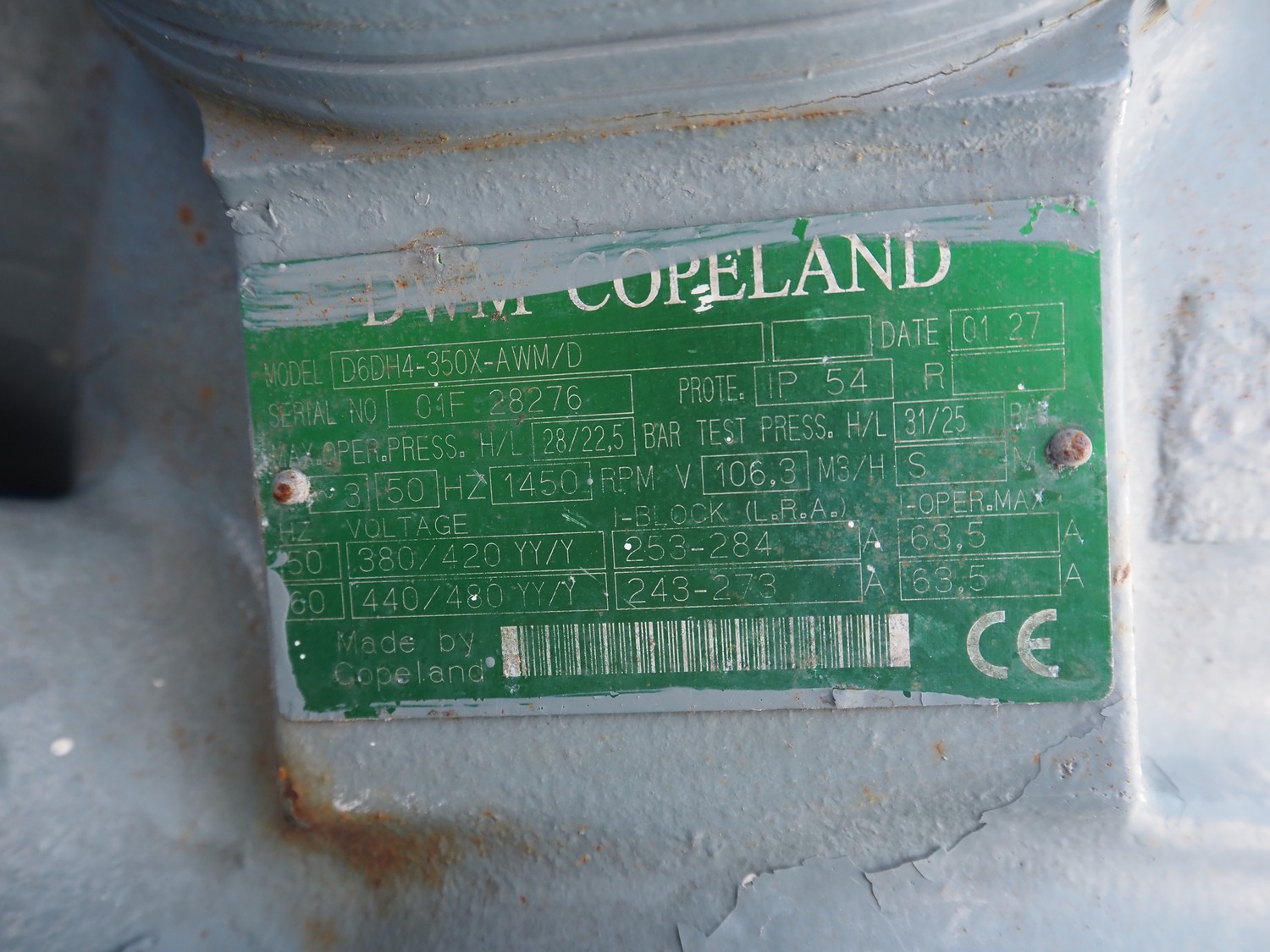 DWM Copeland cooling compressor, model: D6DH4-350-AWM/D, serial number: 01F 28276, 380/420 V, 3 Ph, 50 Hz, 1450 rpm, dimensions: 1450 mm x 500 mm x 900 mm.