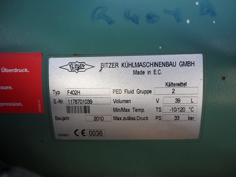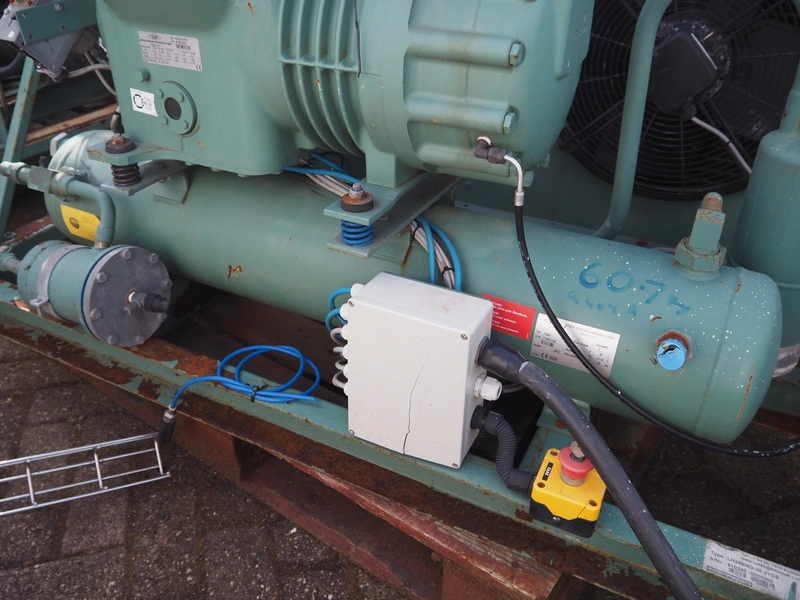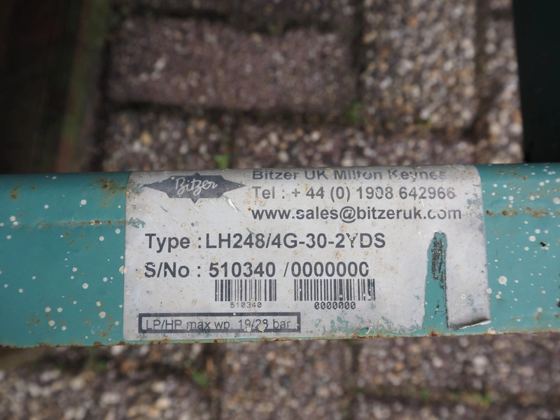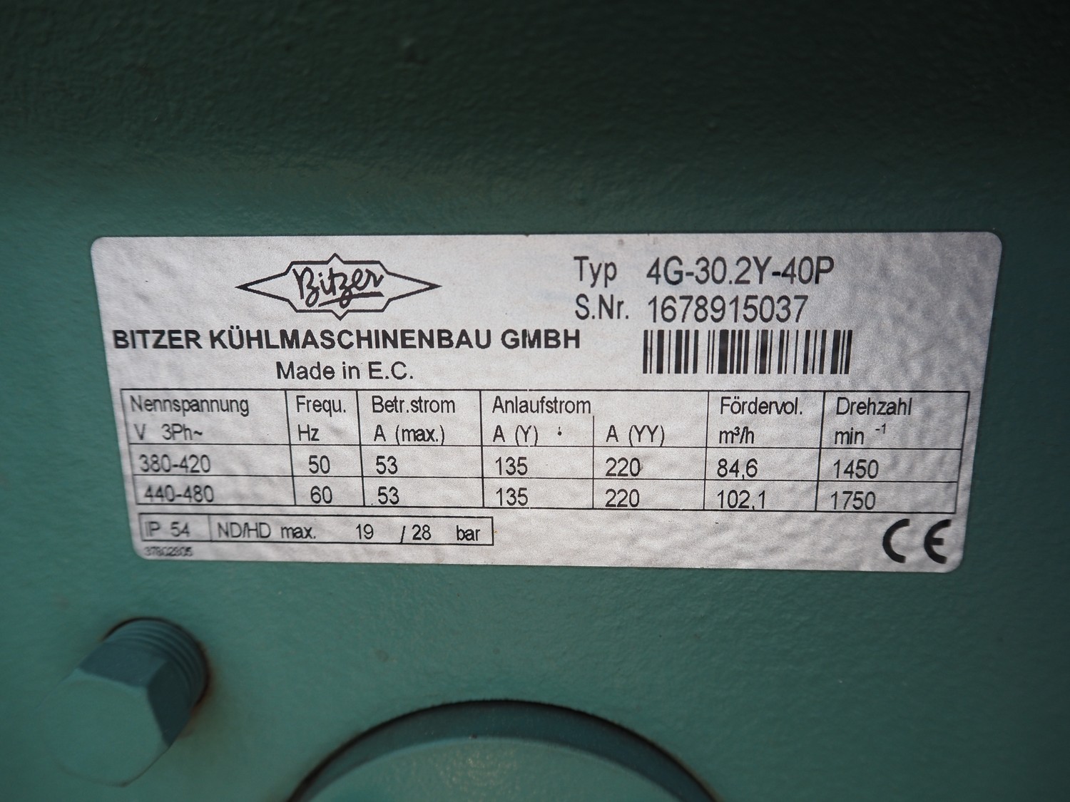 Bitzer Kühlmaschinenbau GmbH cooling/condensing unit, type: 4G-30.2Y-40P, serial number: 1678915037, 440/480 V, 60 Hz, capacity: 84.6/102.1 m³ per hour, dimensions: 1600 mm x 1100 mm x 1500 mm.