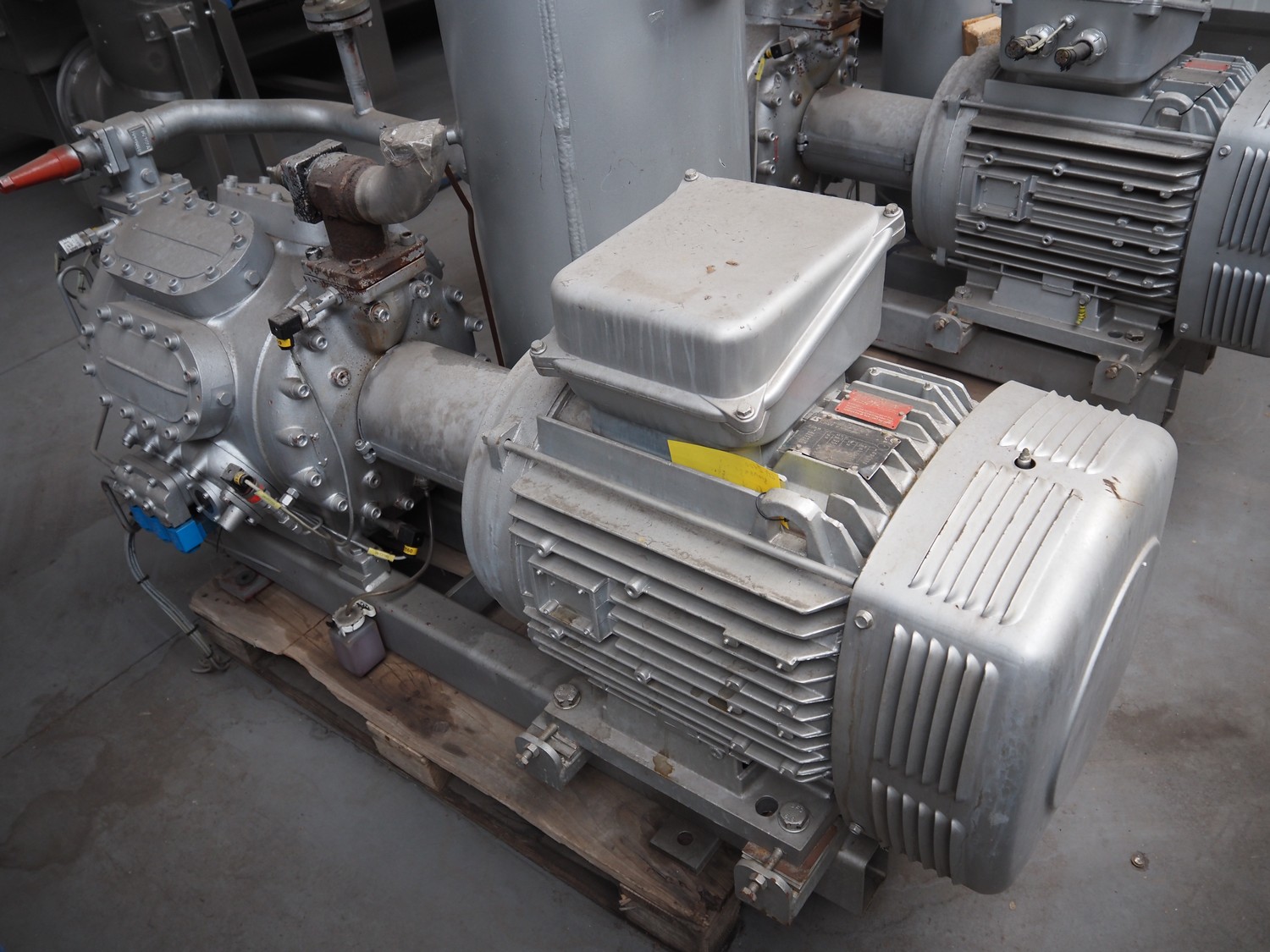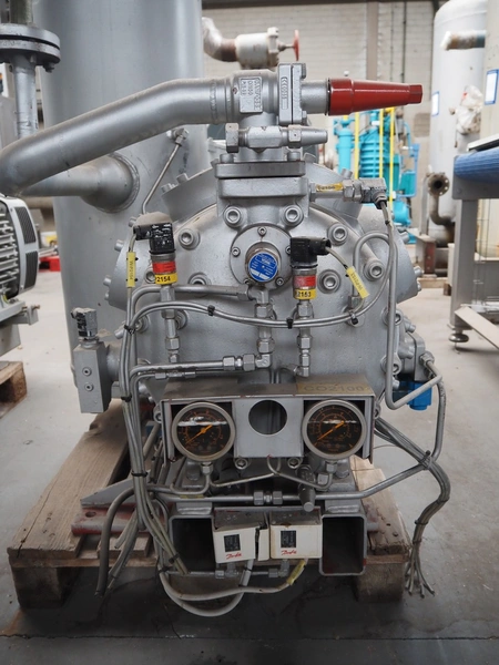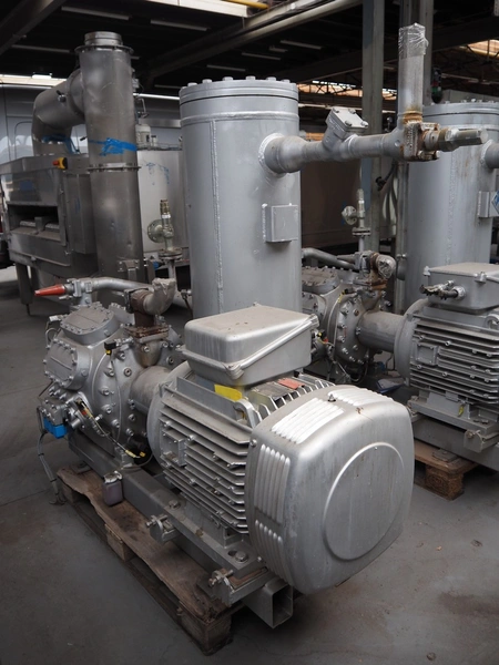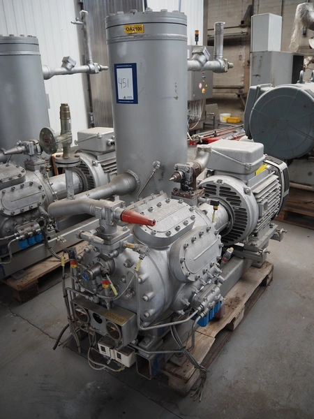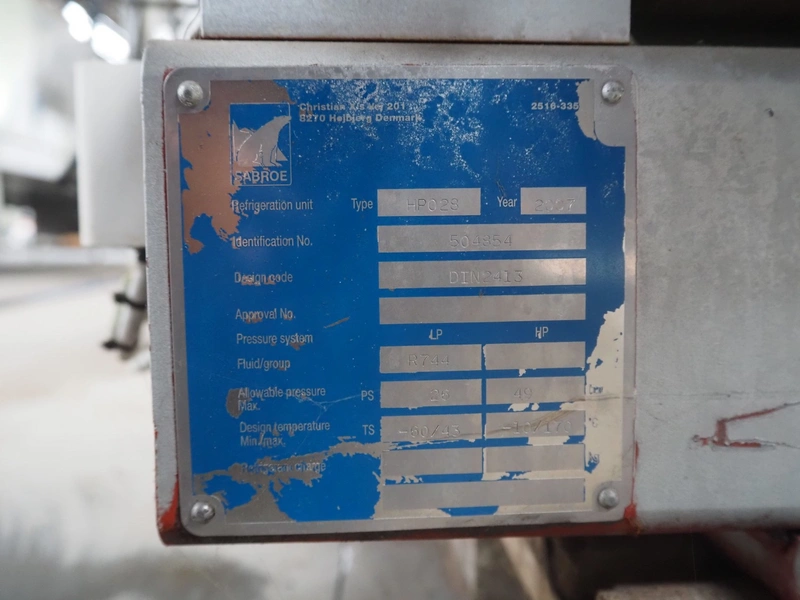 Sabroe high pressure reciprocating compressor, type: HP028, serial number: 138664, year of construction: 2007, volume: 233 m³ per hour, fluid group: R744, maximum pressure: 26/49 bar, maximum temperature: -60/43 and -10/170° Celsius, Leroy Somer motor, type: PLS250MP-T, 90-103 kW, Johnson Controls Systems pressure vessel, type: OVUR 4113 D, year of construction: 2007, dimensions: 2000 mm x 1000 mm x 1600 mm.