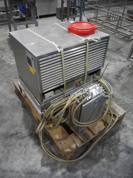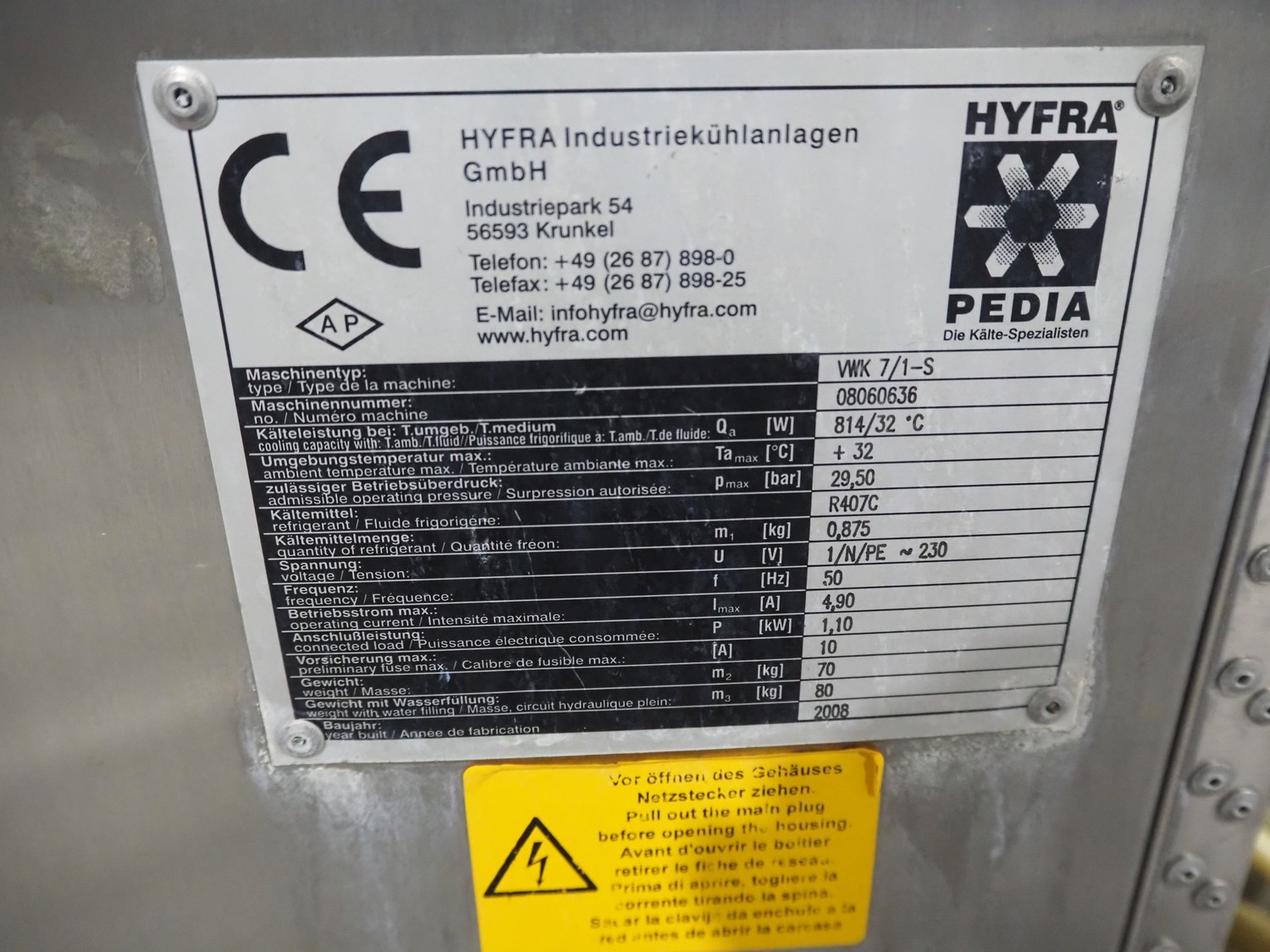 Hyfra cooling unit, type: VWK 7/1-s, machine number: 08060336, year of construction: 2008, 230 V, 1 Ph, 50 Hz, 4.90 A, 1.10 kW, refrigerant: R407C, 0.875 kg, dimensions: 750 m x 550 mm x 750 mm.