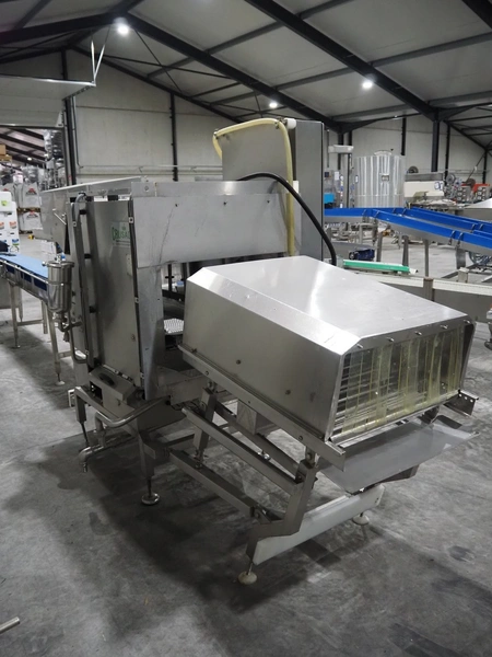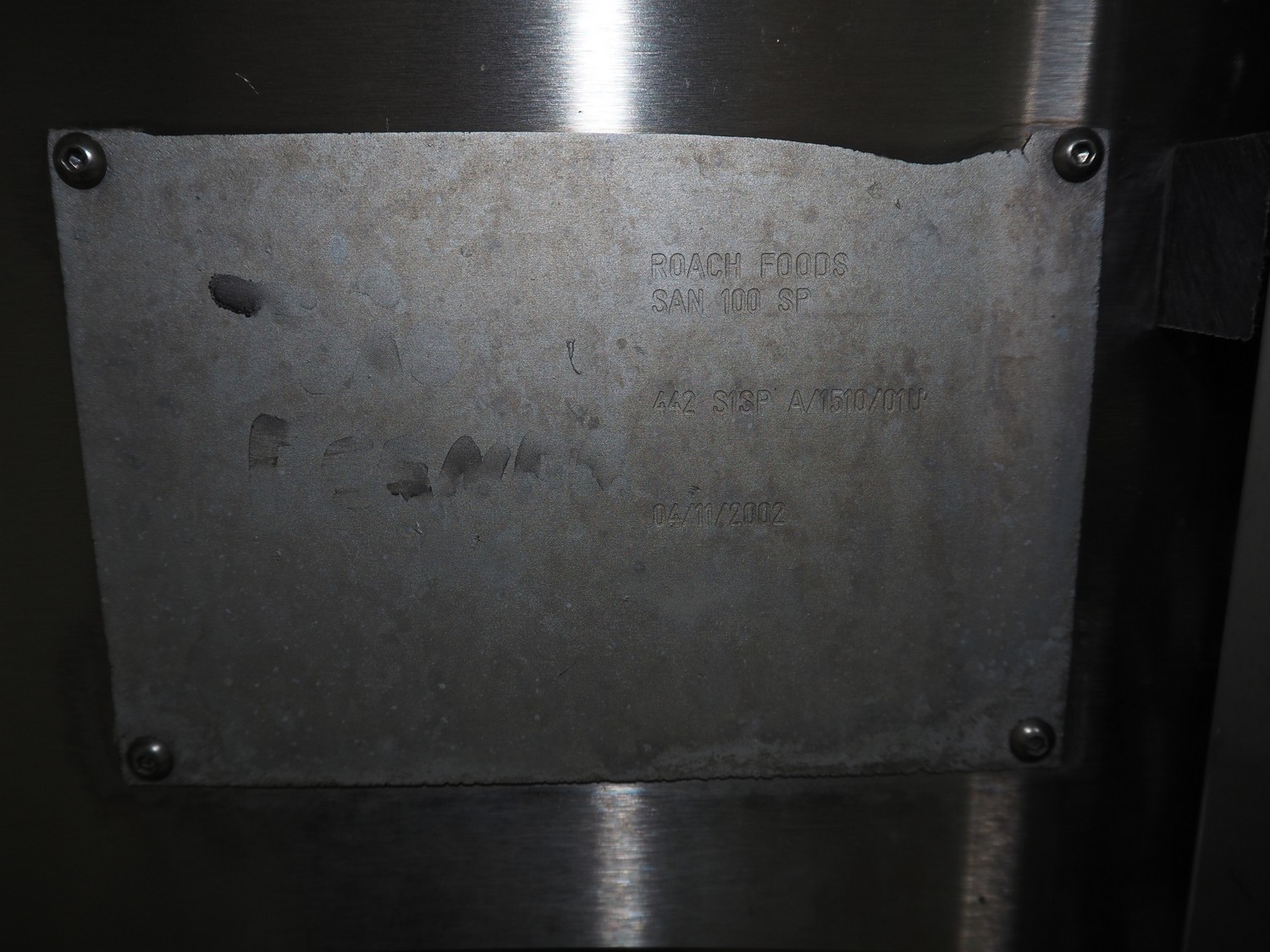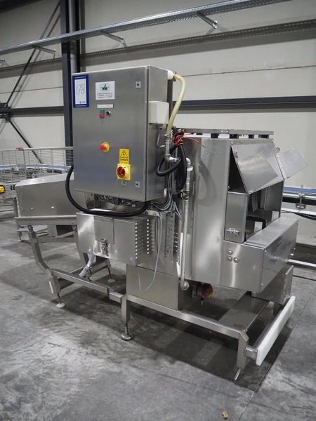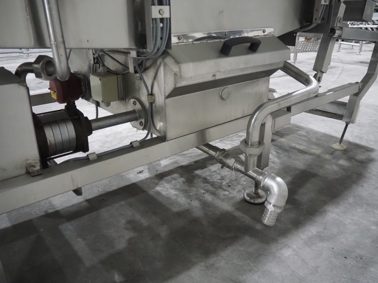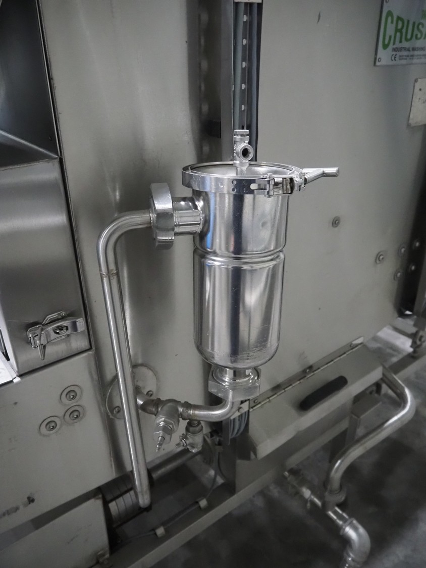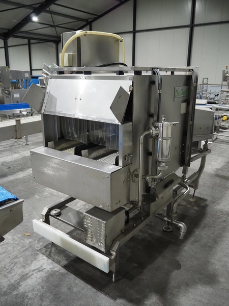 Industrial Washing Machines crate washer, type: SAN 100 SP, number: 442 S1SP A/1510/01U, year of construction: 04/11/2002, plastic mesh belt, belt width: (2x) 150 mm, clearance: (2x) 265 mm x 290 mm, total dimensions: 2500 mm x 1400 mm x 1950 mm.