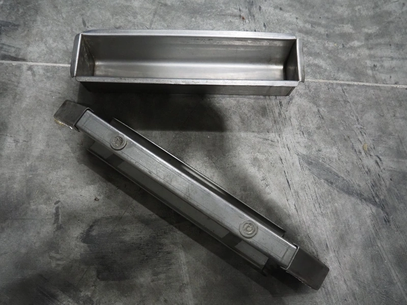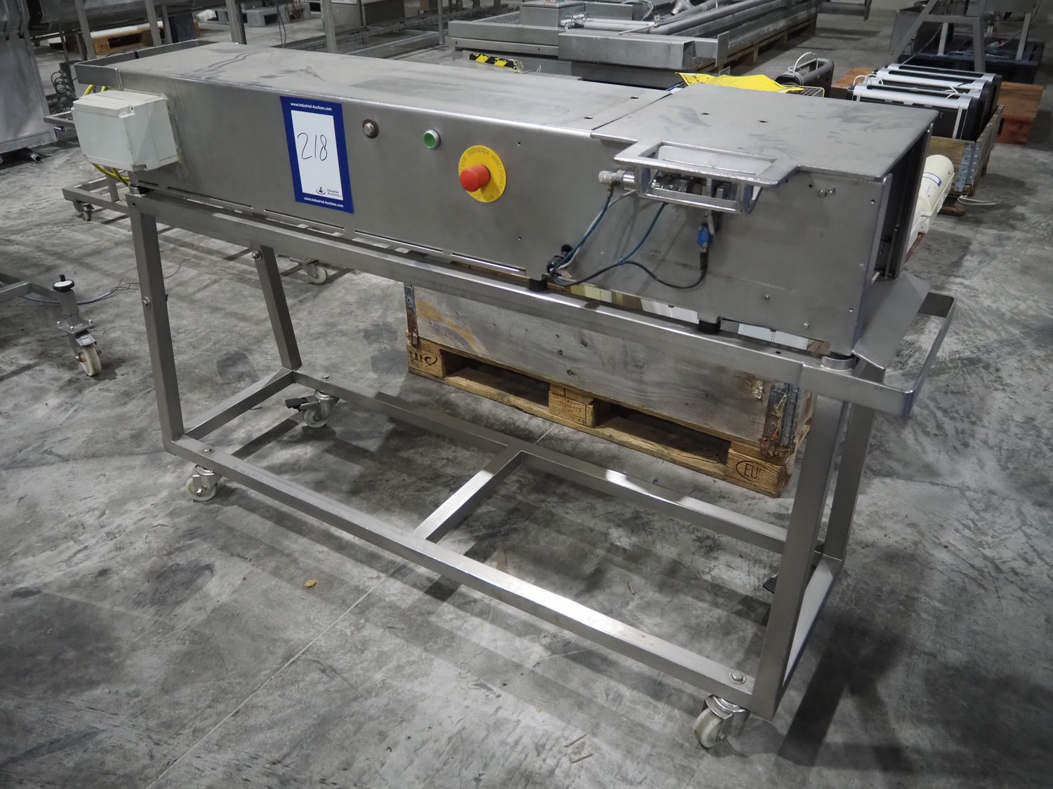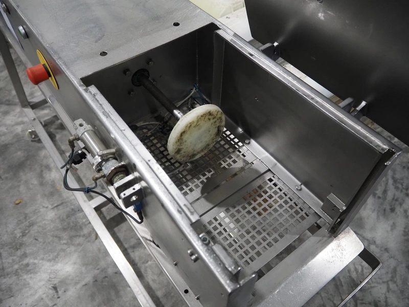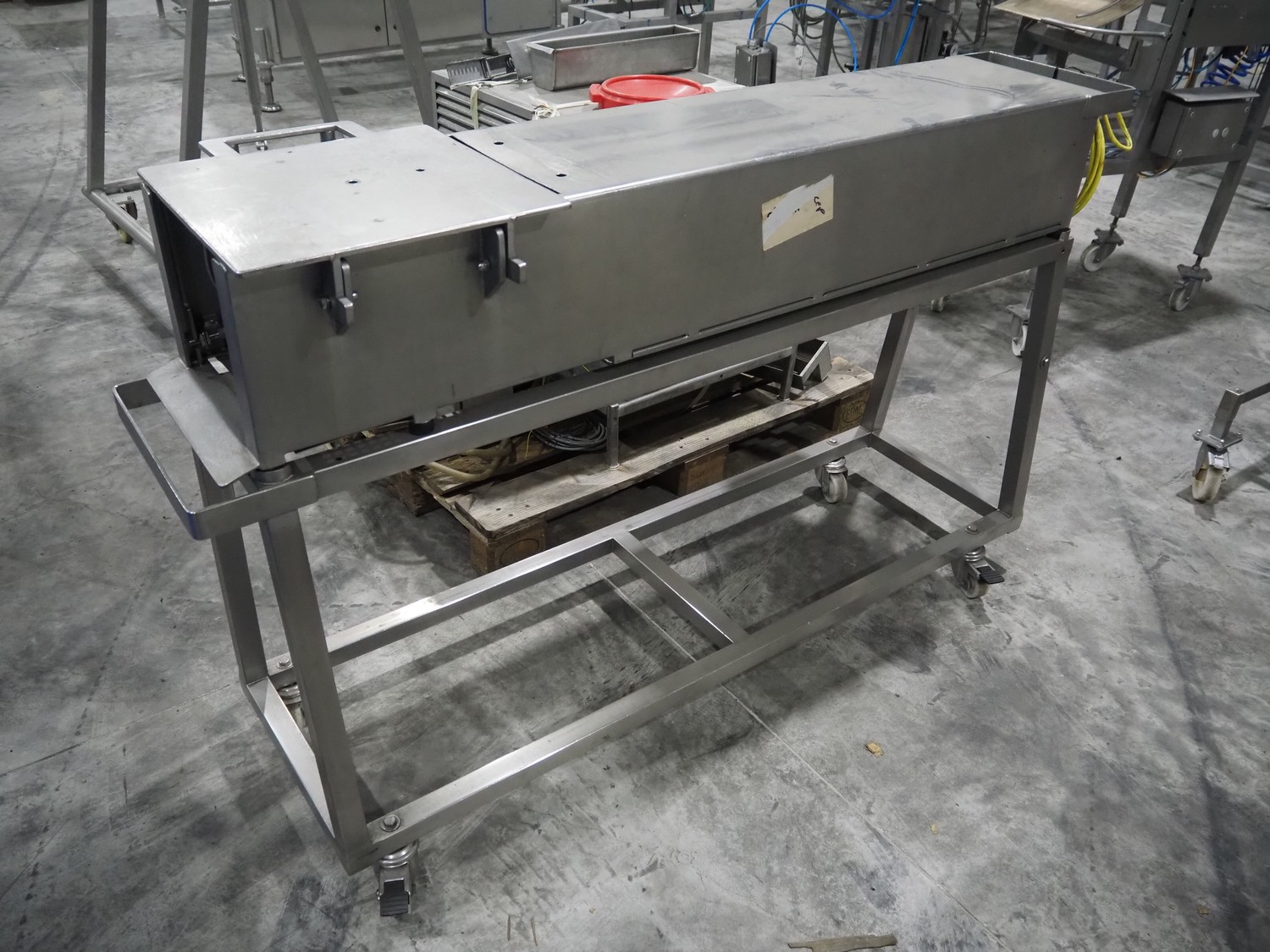 Mobile s/s meat press, dimensions: 1750 mm x 500 mm x 1000 mm. Incomplete.