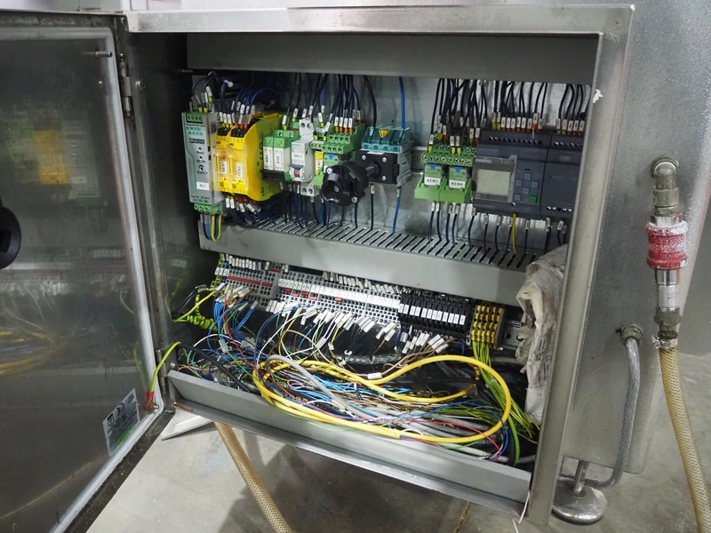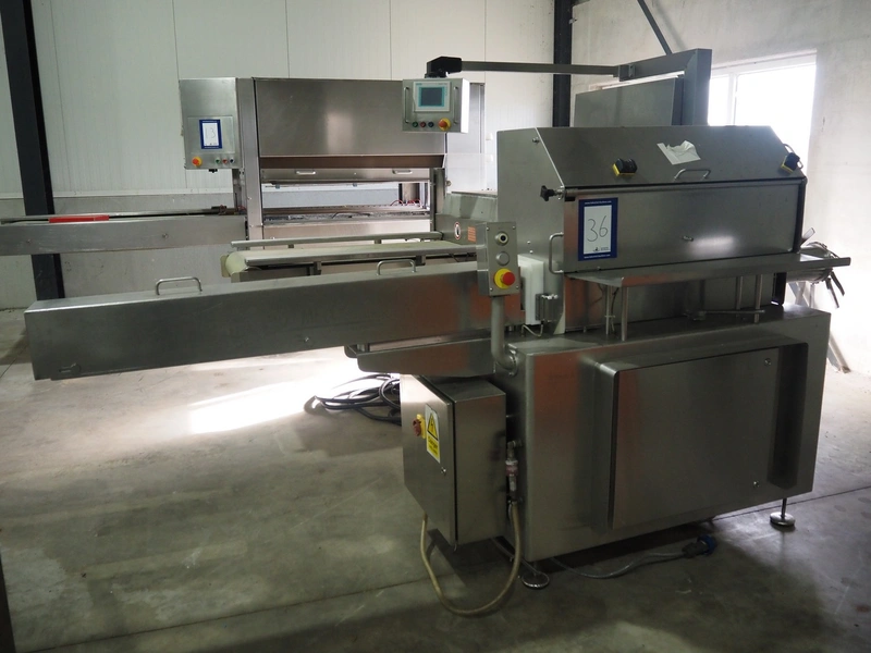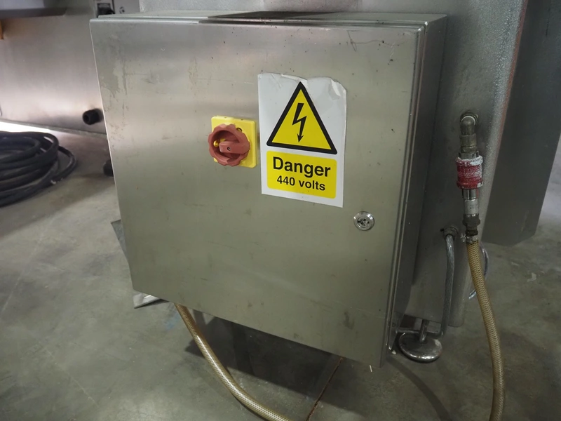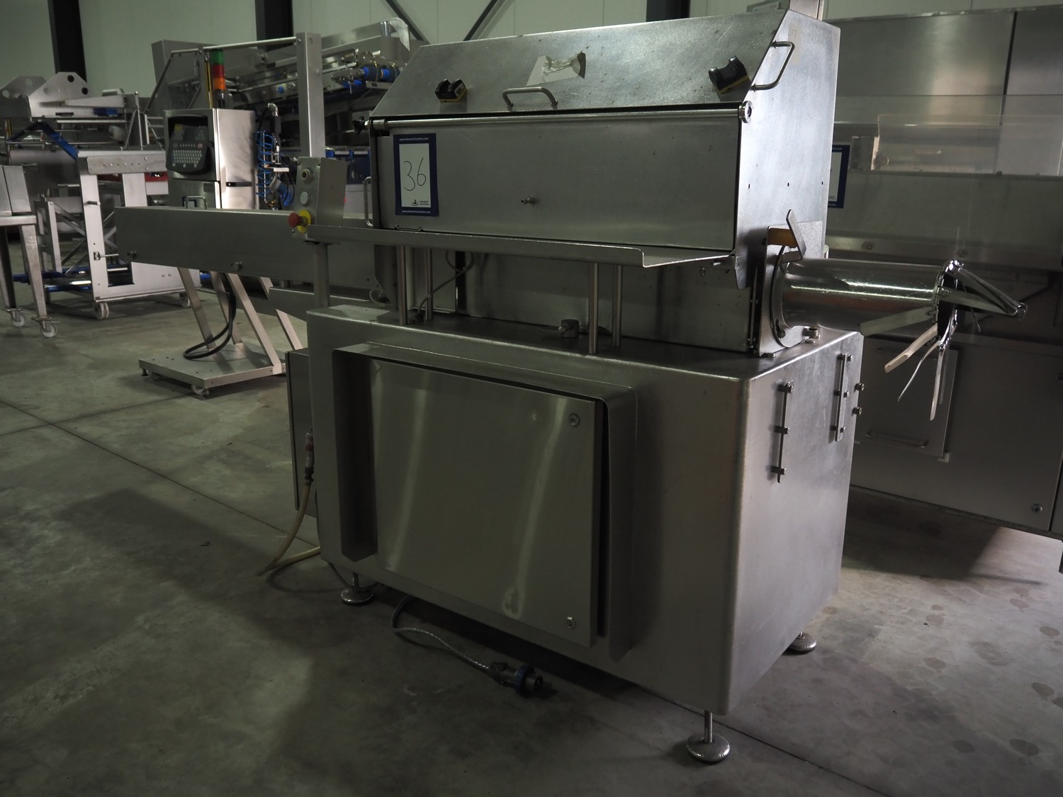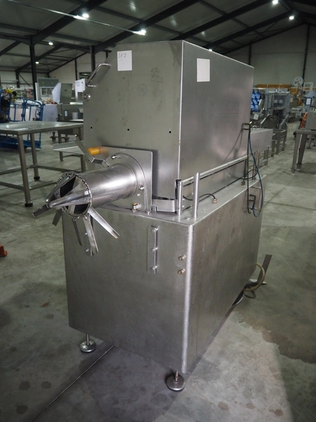 Inox Meccanica meat press, output diameter: 135 mm, total dimensions: 2950 mm x 1100 mm x 1530 mm.