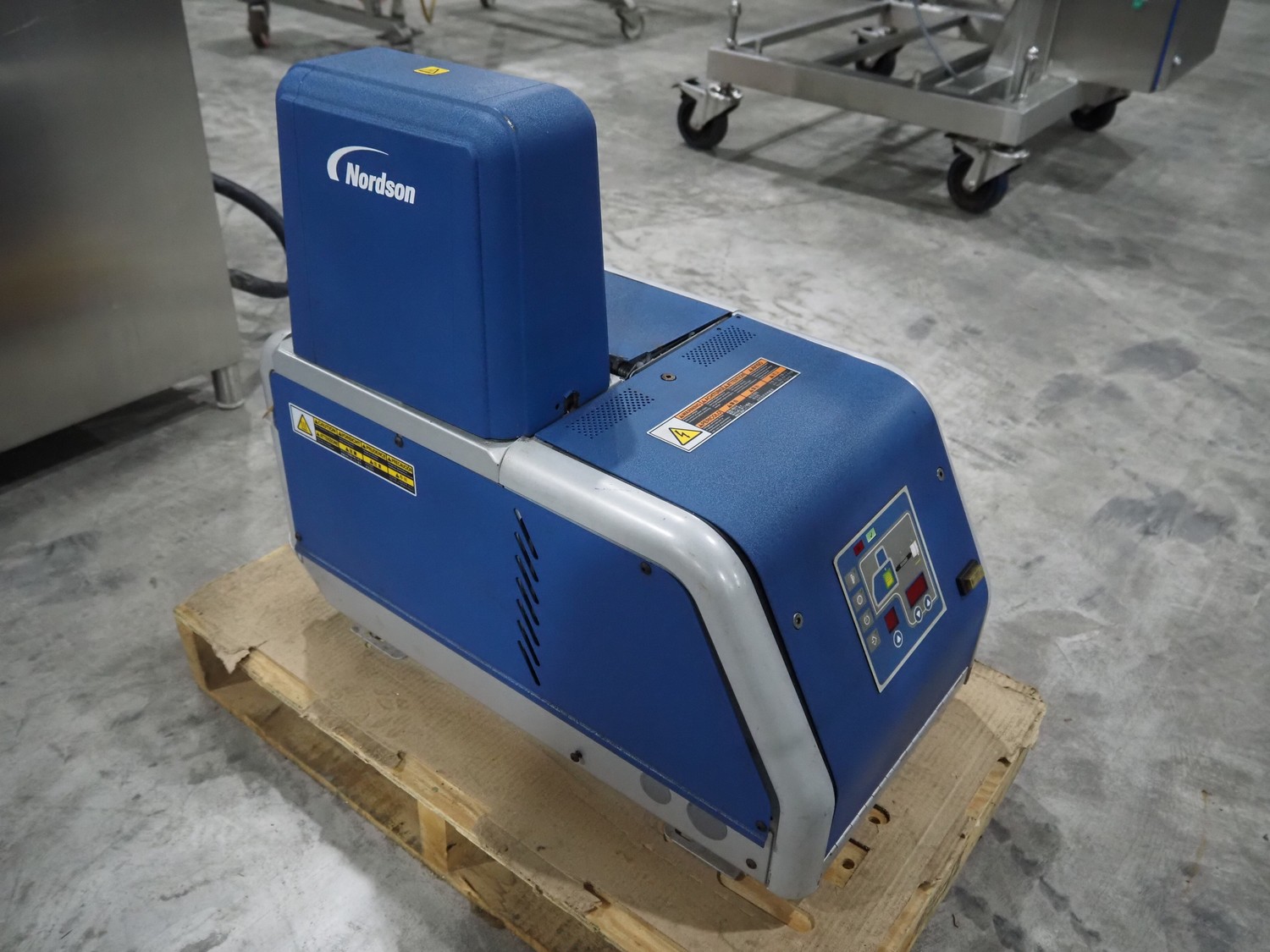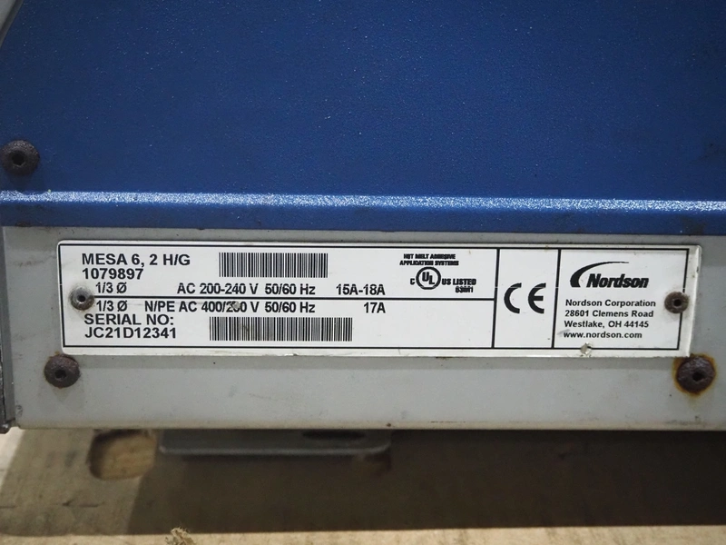 Nordson glue unit, type: MESA, serial number: JC21D12341, 200/240 V, 50/60 Hz, 15/18 A, dimensions: 750 mm x 350 mm x 570 mm.