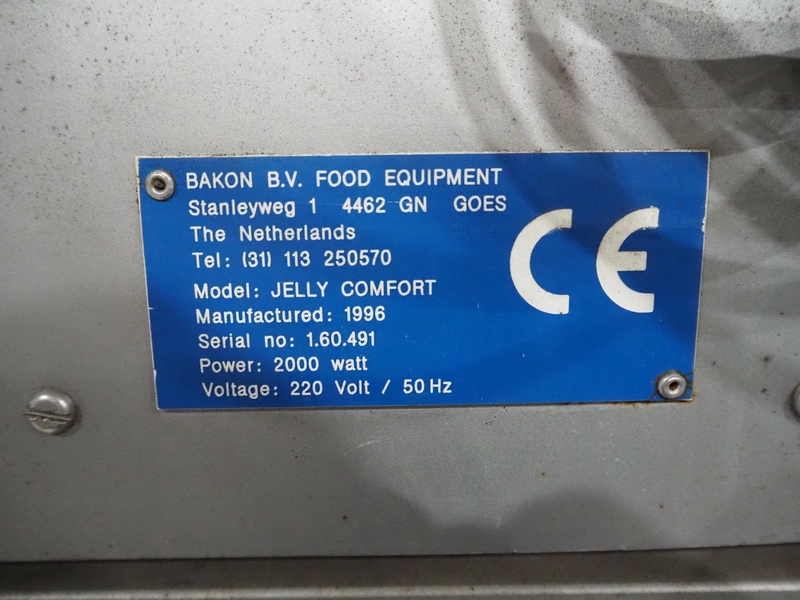 Bakon mobile jelly machine, type: Jelly comfort, serial number: 1.60.491, year of construction 1996, 220 V, 50 Hz, 2000 W, dimensions: 650 mm x 550 mm x 950 mm.