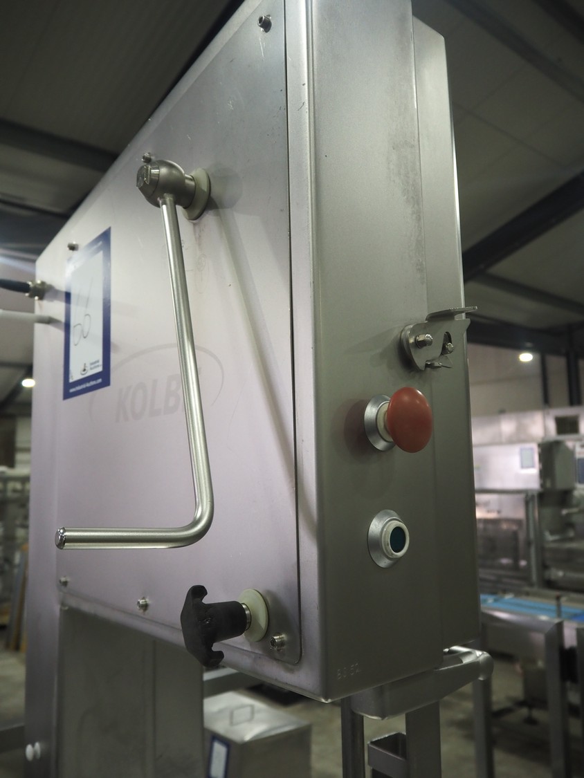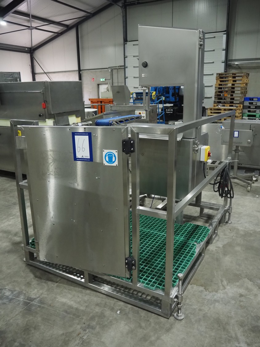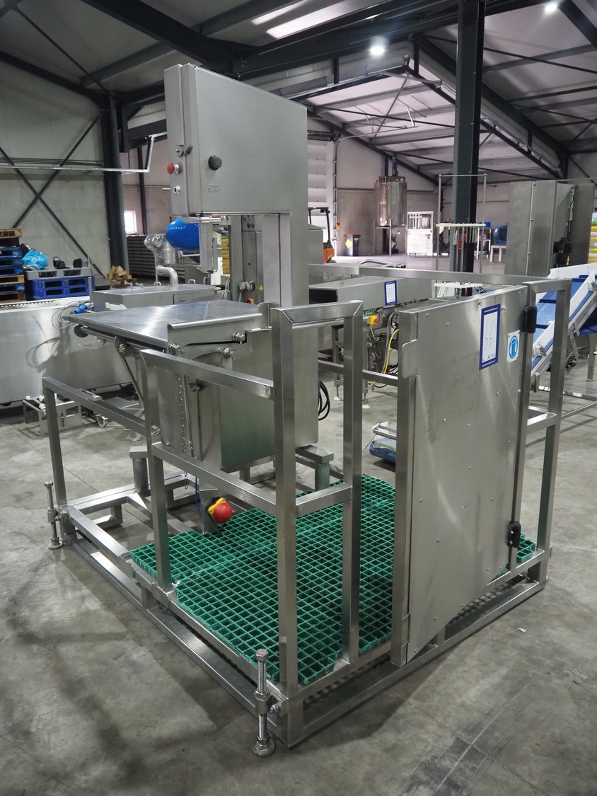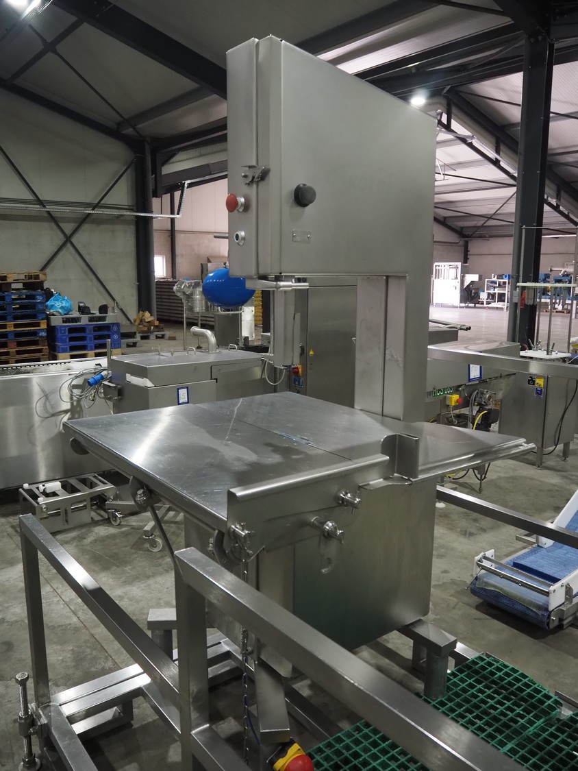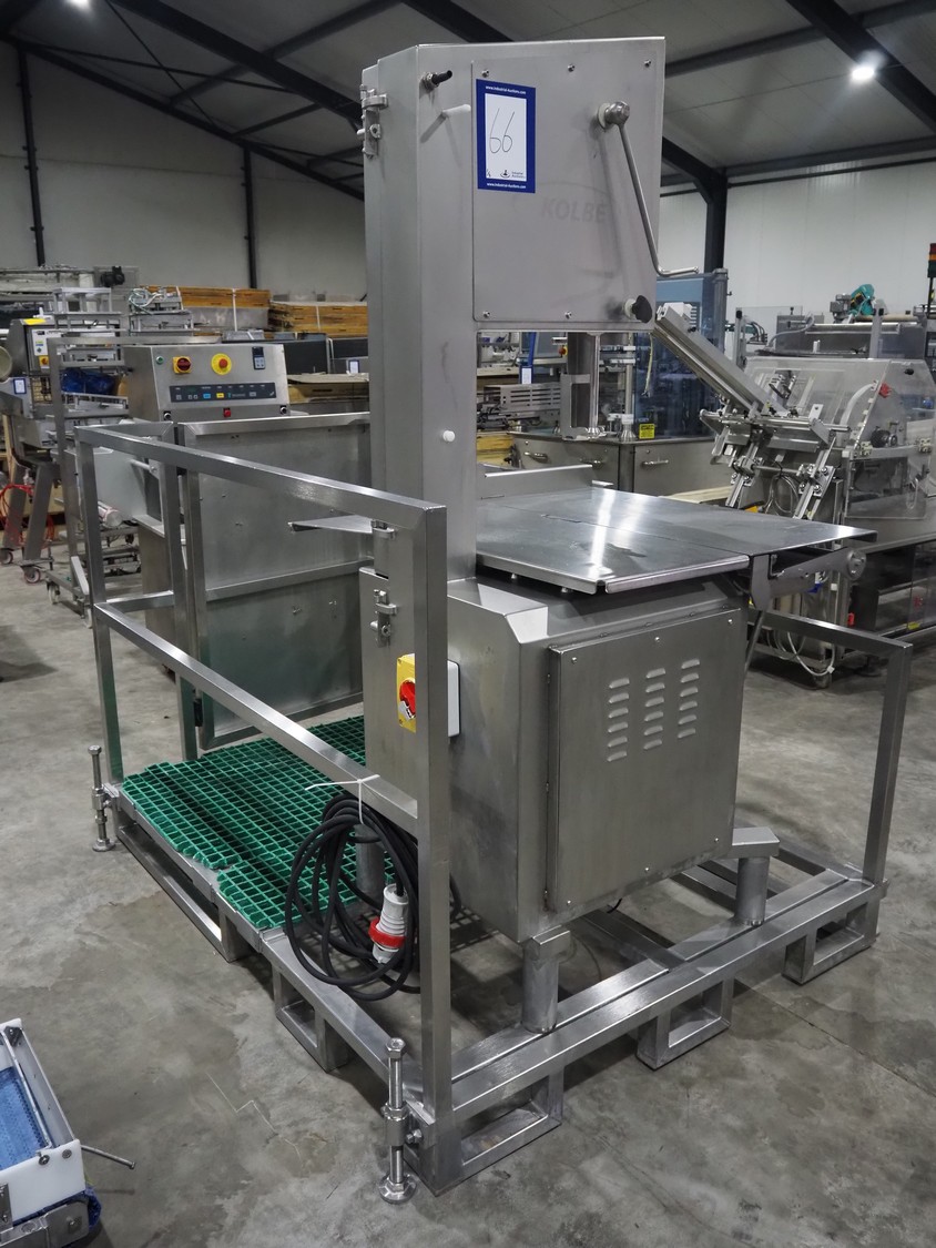 Kolbe bandsaw on platform, table dimensions: 970 mm x 870 mm, total dimensions: 1150 mm x 1050 mm x 2000 mm. S/s platform, platform dimensions: 1900 mm x 1600 mm x 1300 mm.