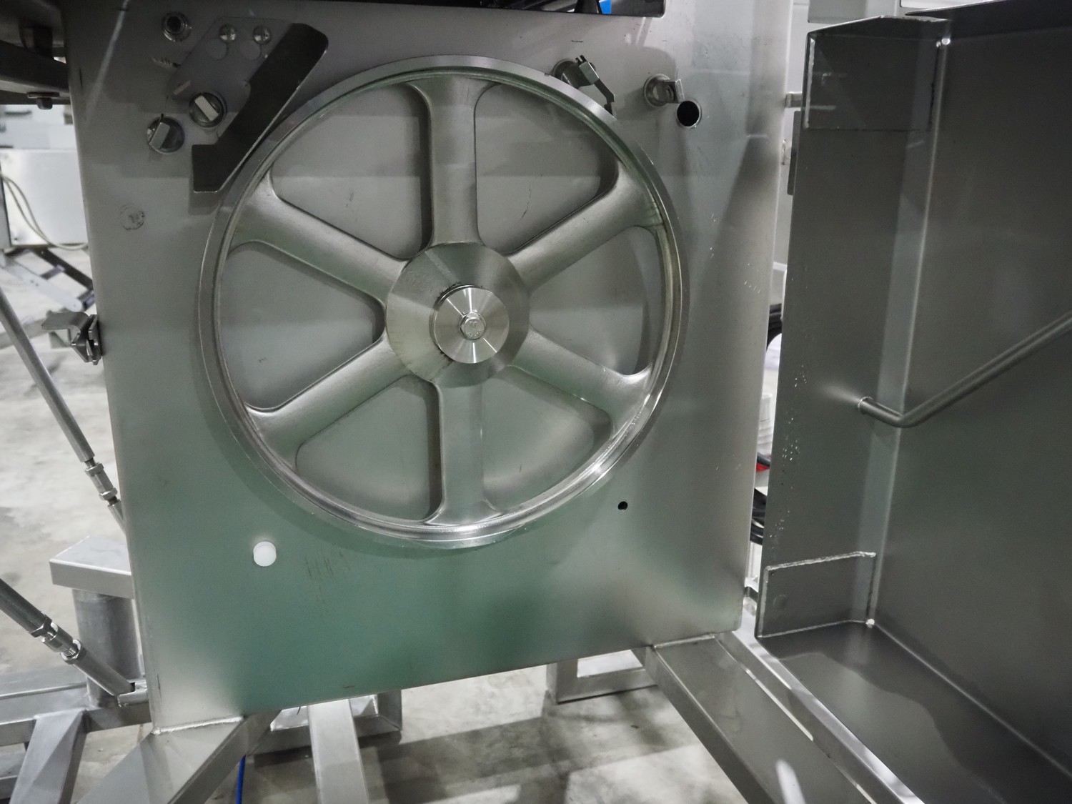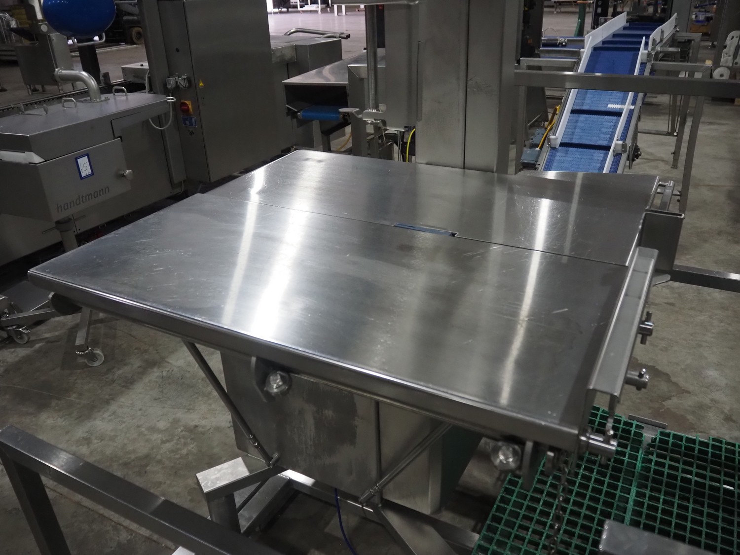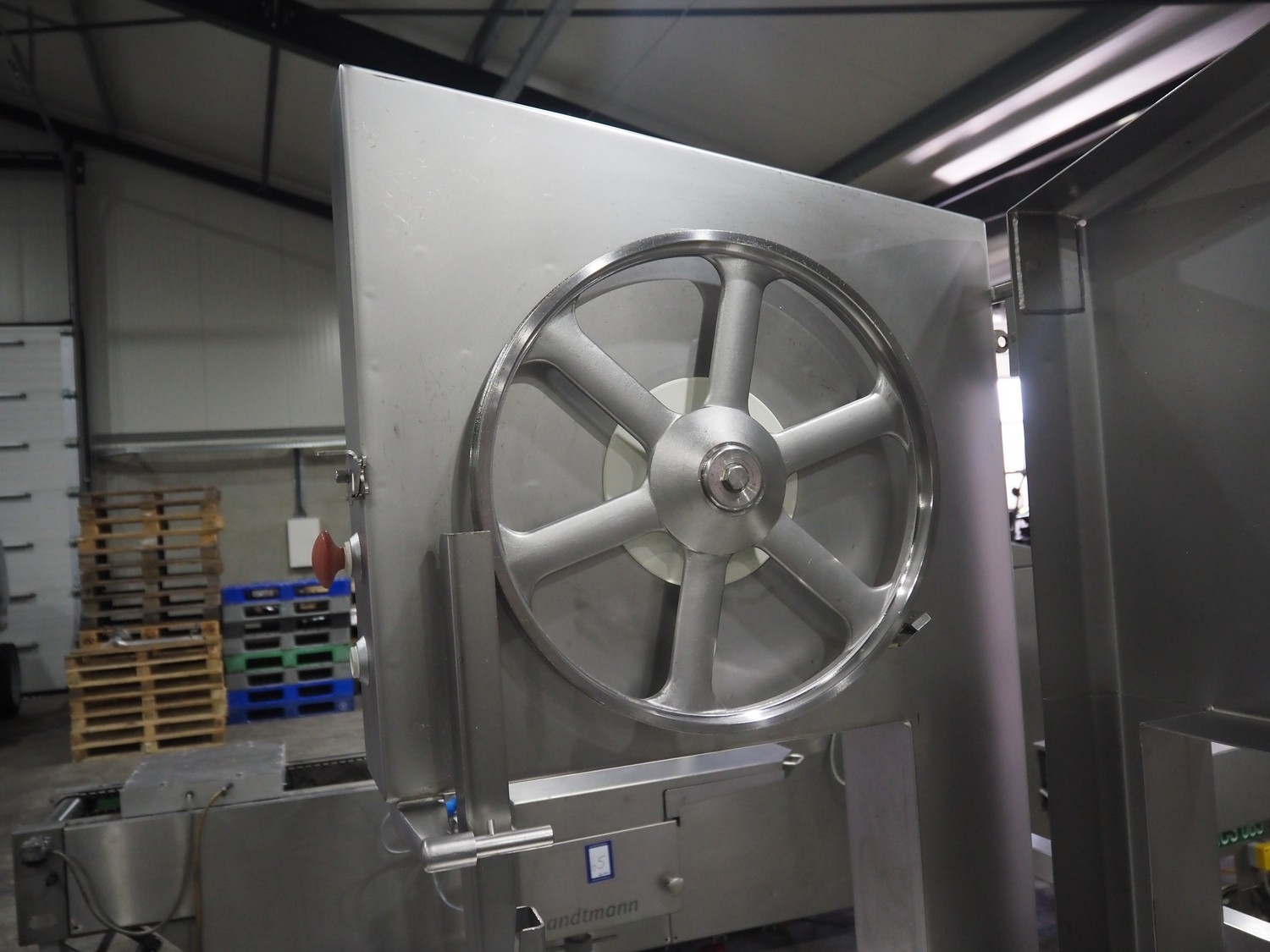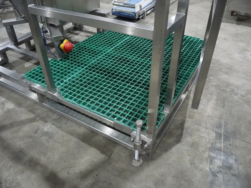 Kolbe bandsaw on platform, table dimensions: 970 mm x 870 mm, total dimensions: 1150 mm x 1050 mm x 2000 mm. S/s platform, platform dimensions: 1900 mm x 1600 mm x 1300 mm.