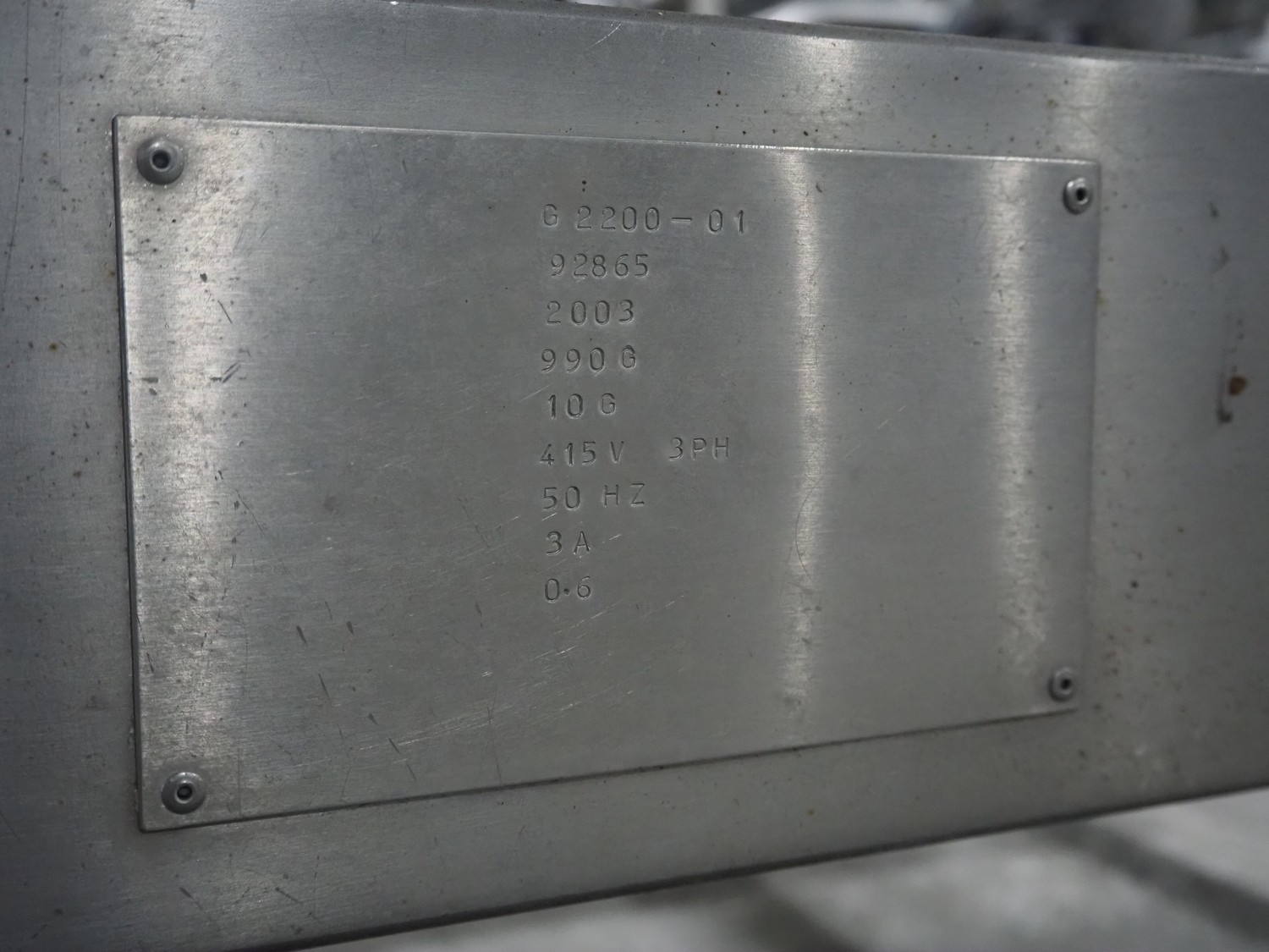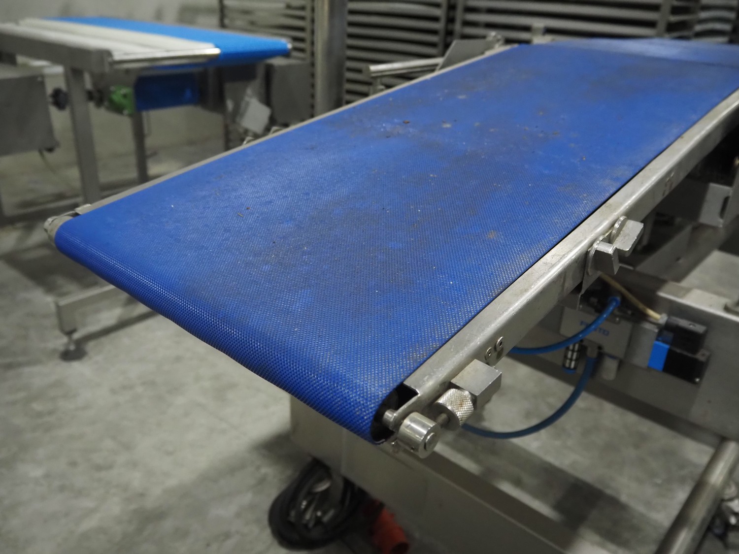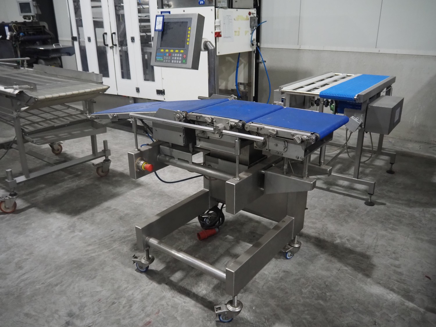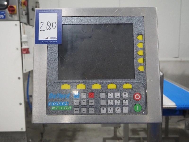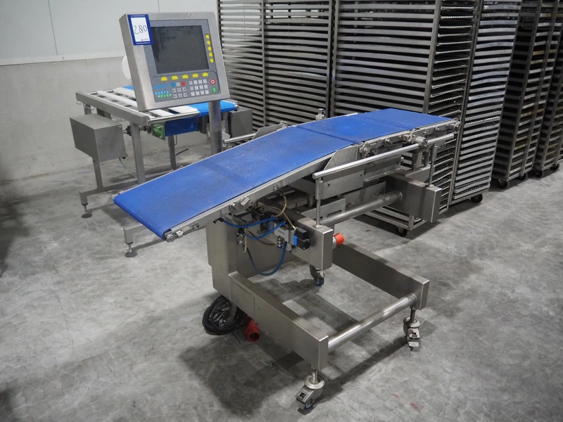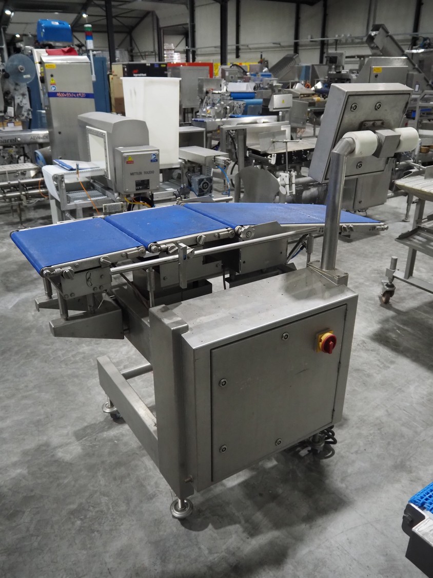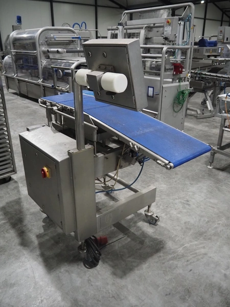 AEW Delford mobile checkweigher, type: G2200-01, serial number: N3, year of construction: 2003, 415 V, 3 Ph, 50 Hz, 3 A, maximum capacity: 990 g, minimum capacity: 10 g, plastic belts, belt width: 360 mm, dimensions: 1550 mm x 900 mm x 1500 mm.
