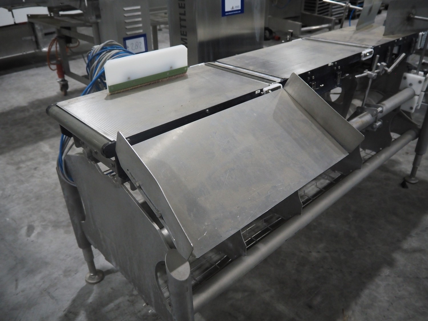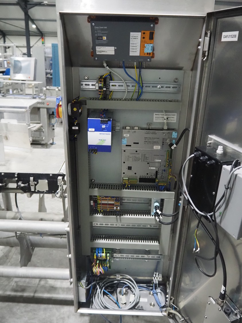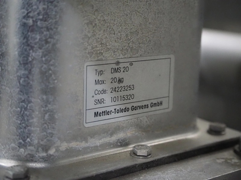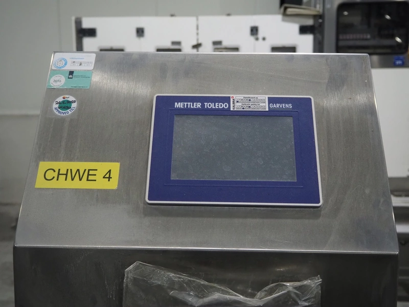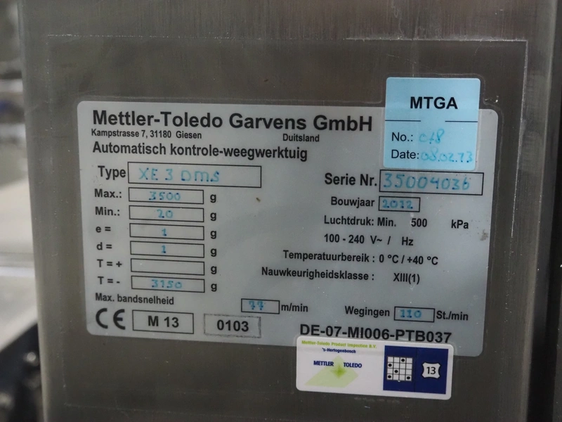 Mettler-Toledo Garvens GmbH checkweigher with rejector, type: XE3DMS, serial number: 35004036, year of construction: 2012, 100/240 V, maximum: 3500 kg, minimum: 0.020 kg, e=: 0.001 kg, d=: 0.001 kg, T=: 3.150 kg, plastic belt, belt width: (6x) 300 mm, total dimensions: 1960 mm x 1070 mm x 1630 mm.