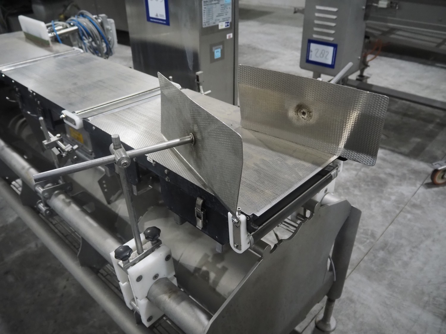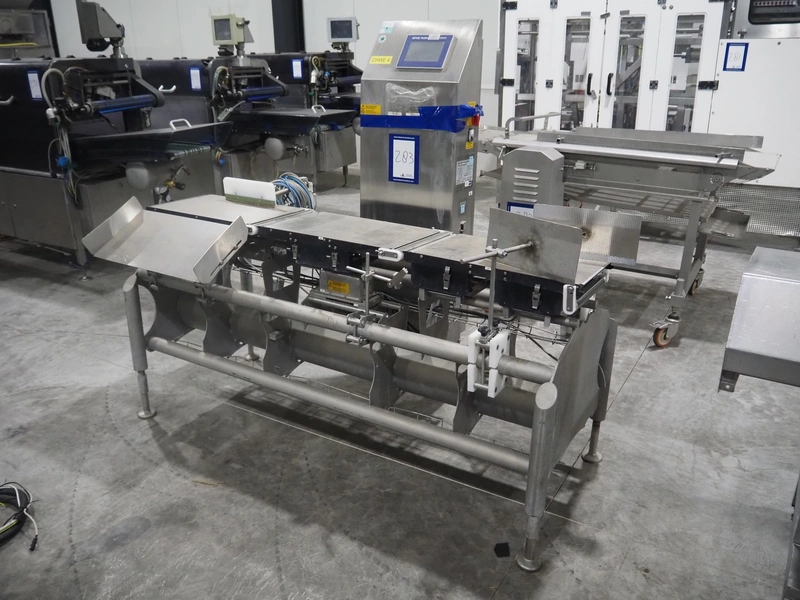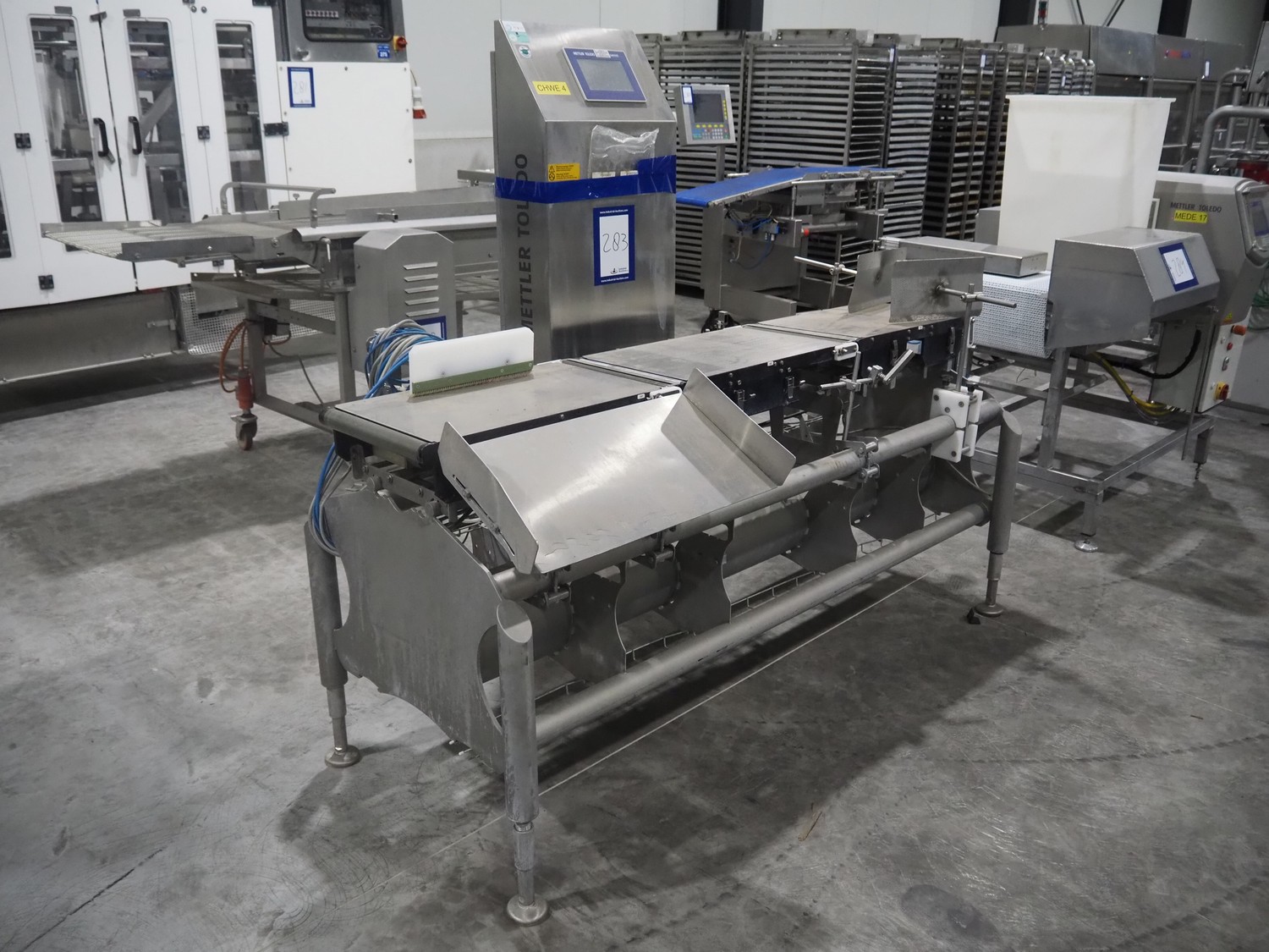 Mettler-Toledo Garvens GmbH checkweigher with rejector, type: XE3DMS, serial number: 35004036, year of construction: 2012, 100/240 V, maximum: 3500 kg, minimum: 0.020 kg, e=: 0.001 kg, d=: 0.001 kg, T=: 3.150 kg, plastic belt, belt width: (6x) 300 mm, total dimensions: 1960 mm x 1070 mm x 1630 mm.