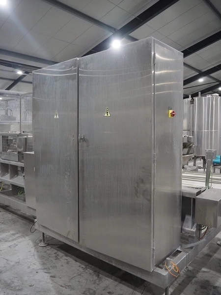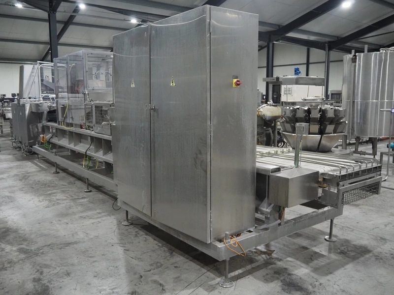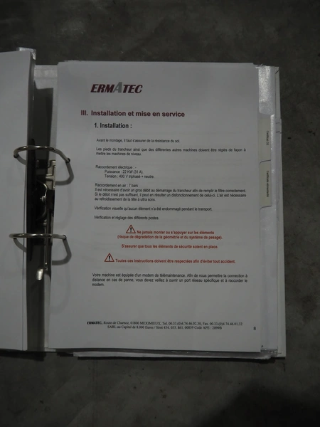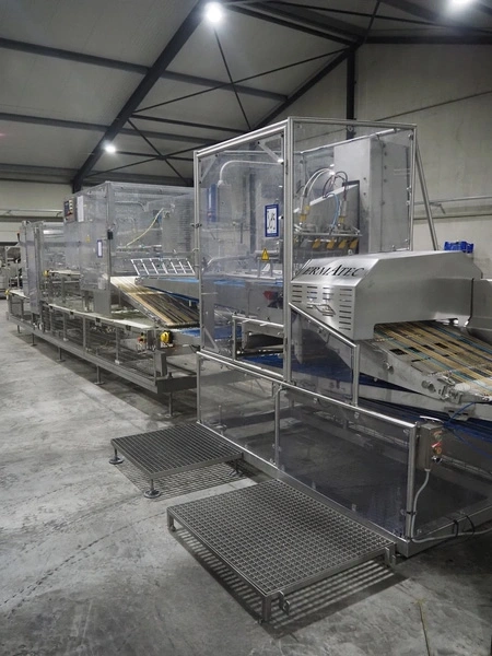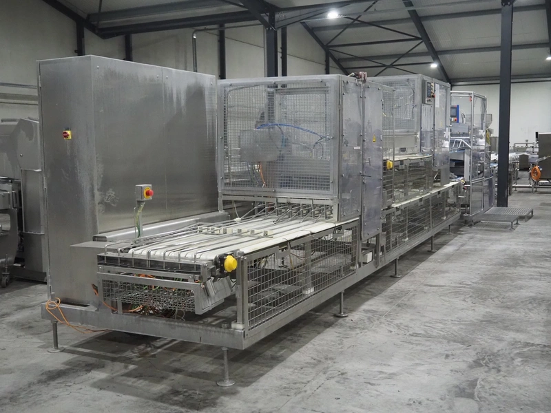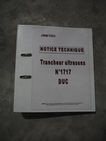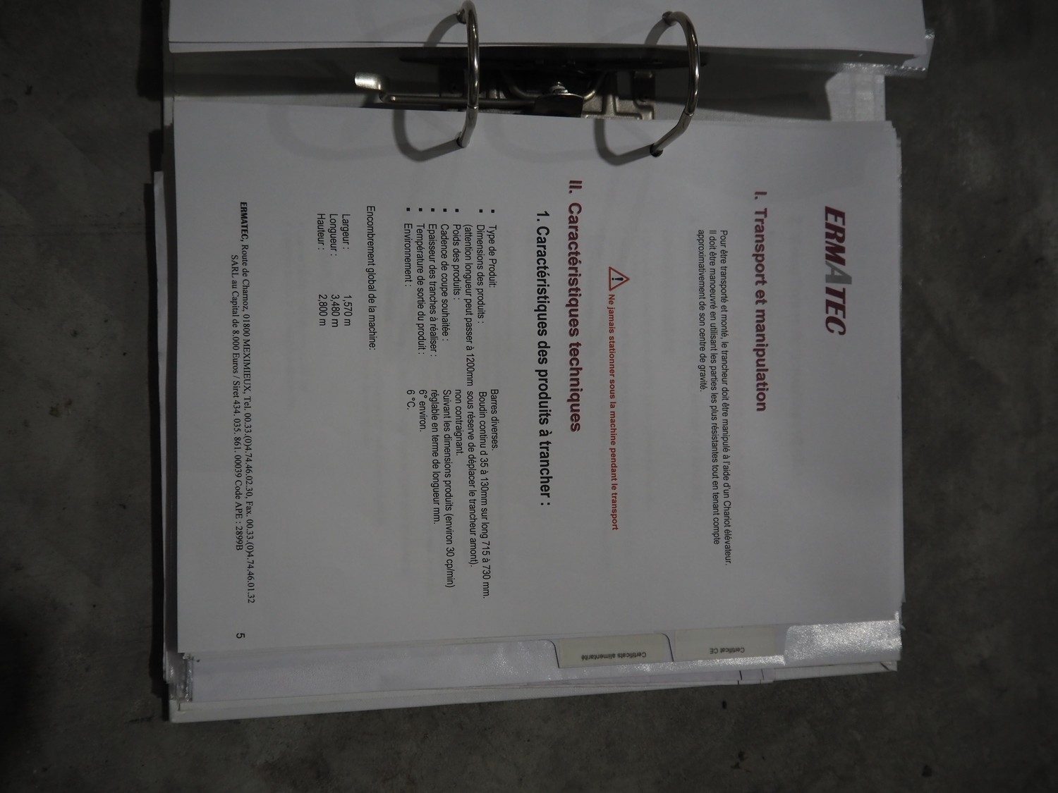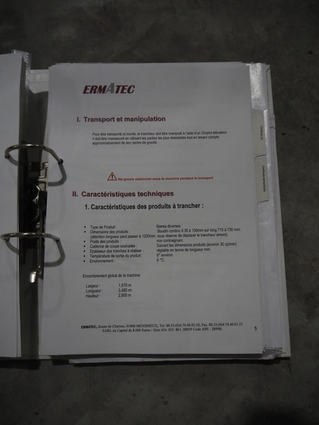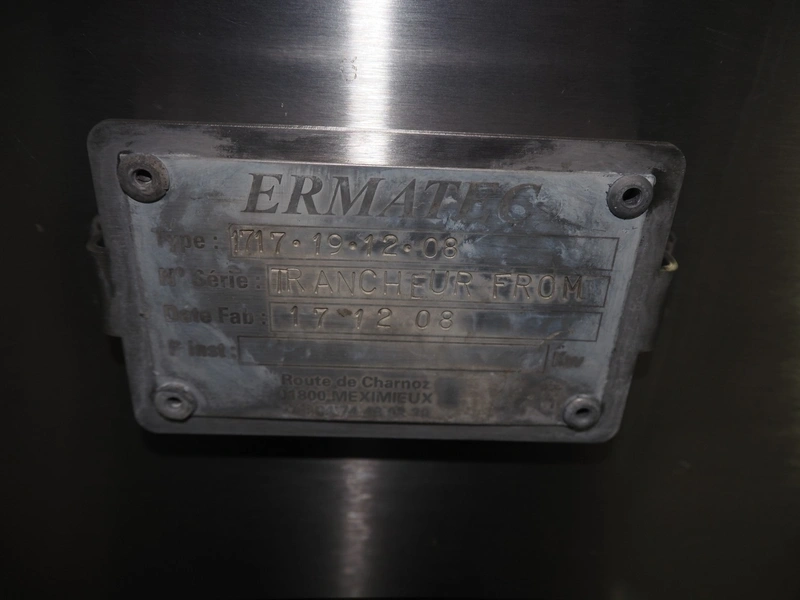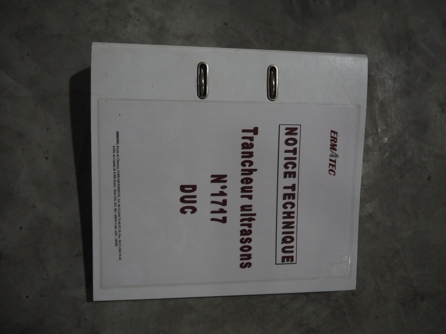 Ermatec ultrasonic slicing line used for cheese, type: 1717-19-12-08, serial number: Trancheur From, year of construction: 17/12/08, working width: 600 mm, 6 lanes, plastic belts, belt width: 75 mm, total dimensions: 13200 mm x 1900 mm x 2600 mm. Including pallet with various parts, dimensions: 1200 mm x 980 mm x 1120 mm. Including pallet box with various parts, dimensions pallet: 1200 mm x 800 mm x 1000 mm.