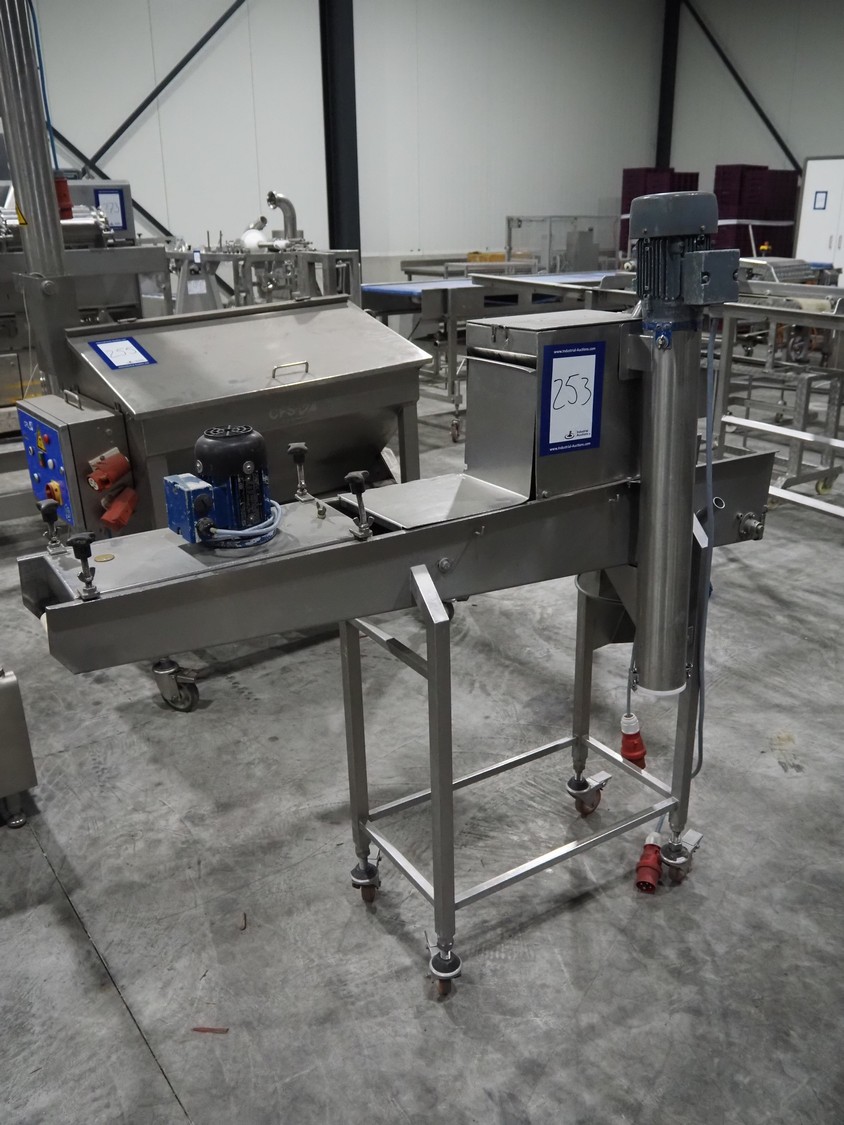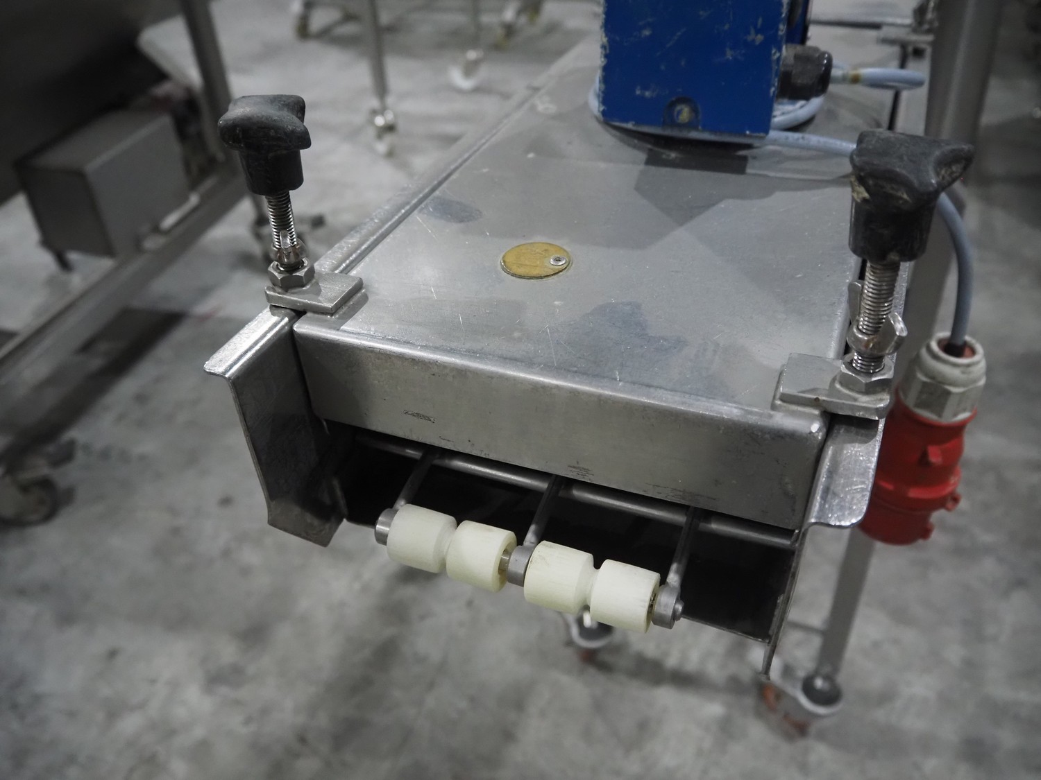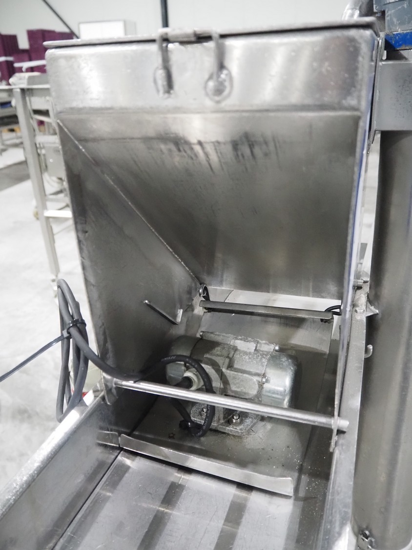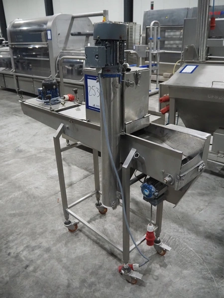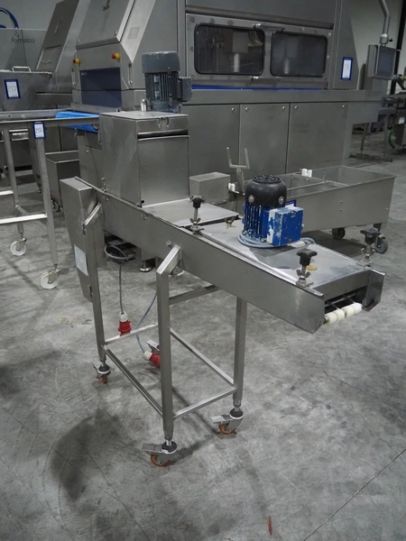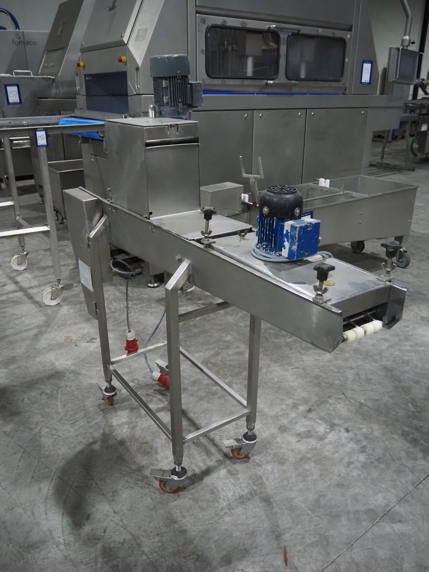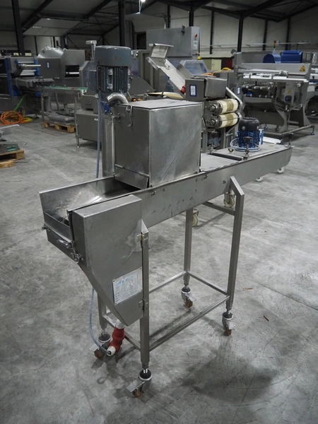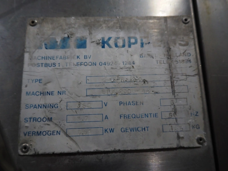 Koppens mobile breading machine, number: PR 200-44, 380 V, 3 Ph, 50 Hz, 3.7 A, 0.61 kW, weight: 135 kg, maximum belt width: 200 mm, clearance: 210 mm x 60 mm, total dimensions: 1550 mm x 500 mm x 1520 mm. Without belt.
