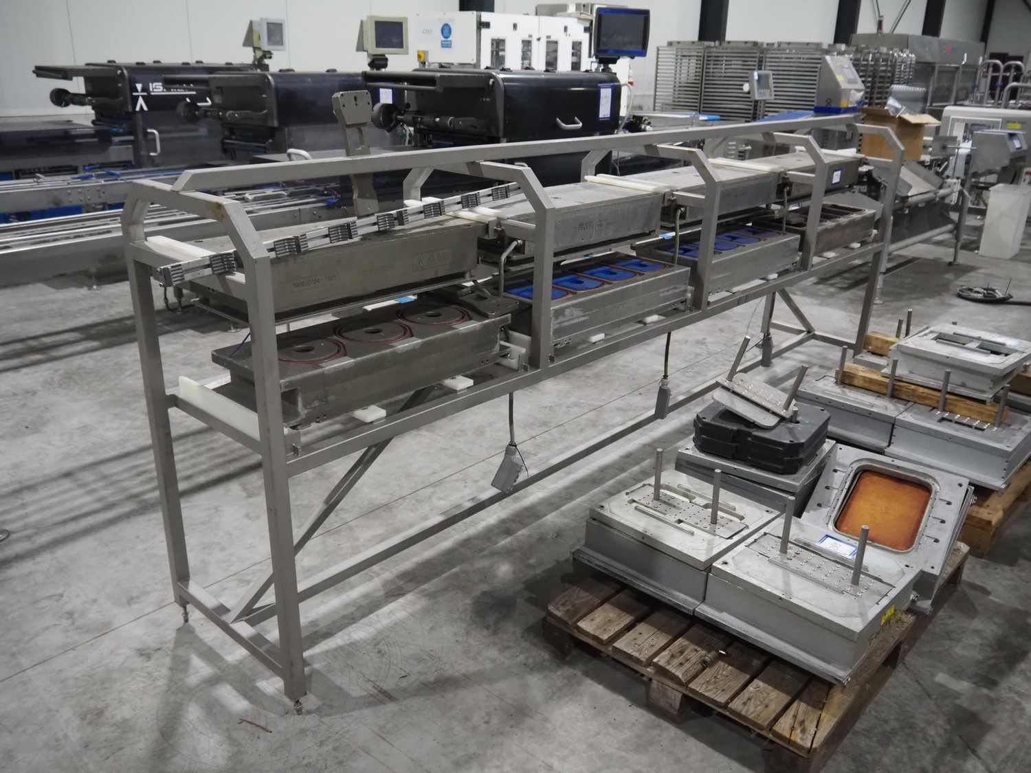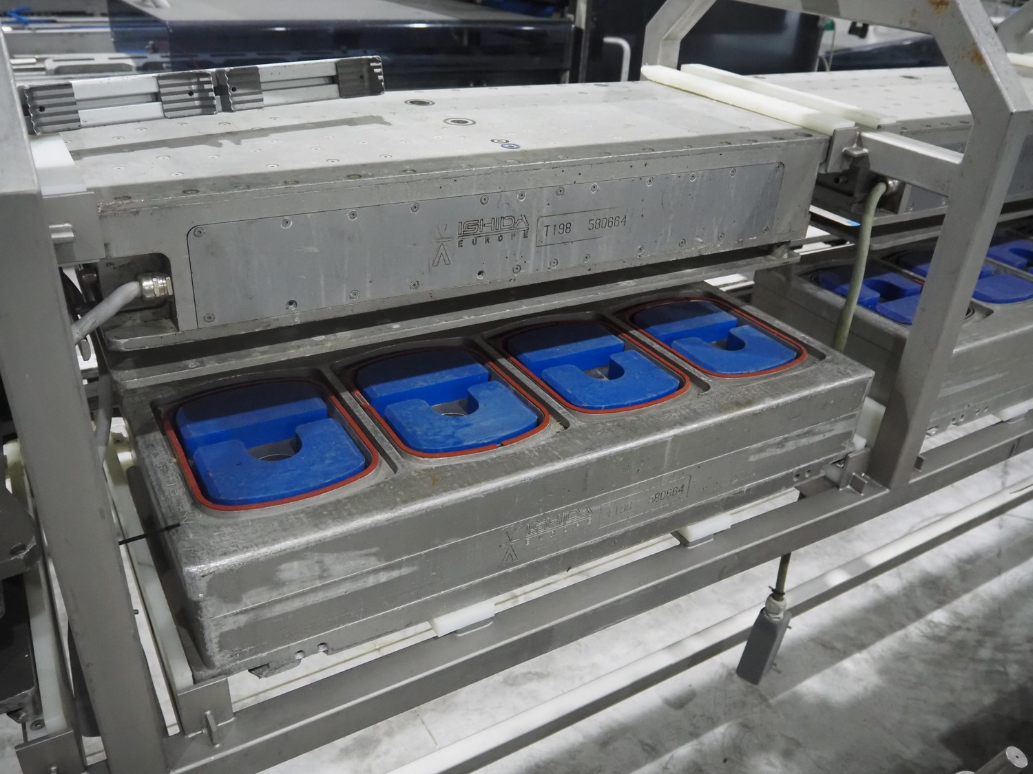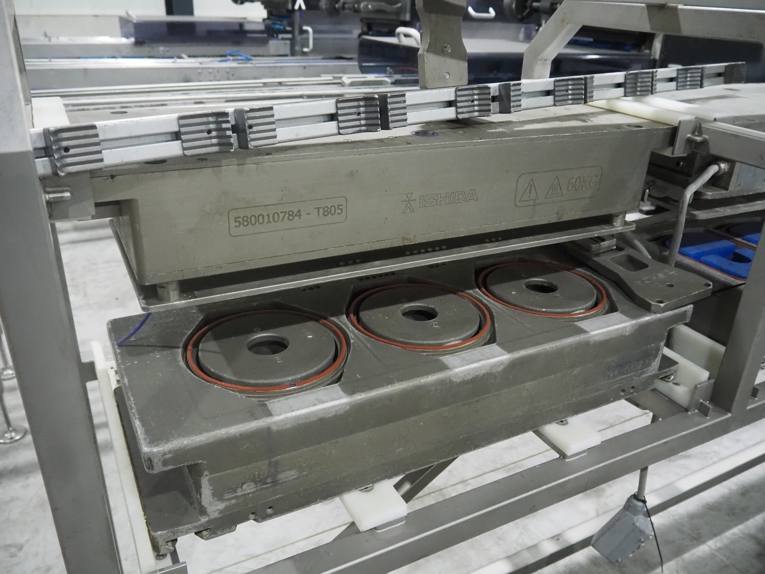 Ishida s/s rack for dye's, 4 dyes, dimensions: (5x) 165 mm x 120, (4x) 200 mm x 150 mm, (4x) 200 mm x 150 mm, (3x) Ø 185 mm, total dimensions: 3650 mm x 595 mm x 1350 mm.