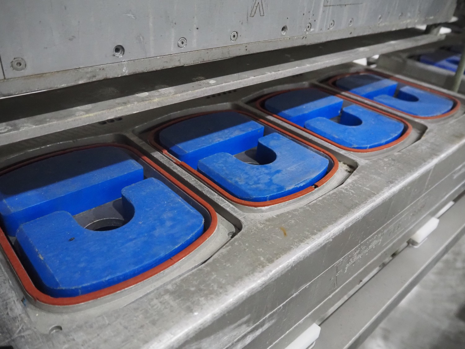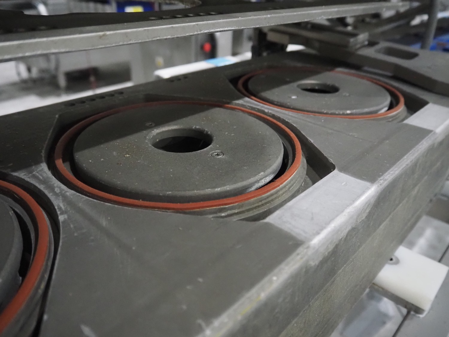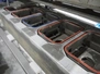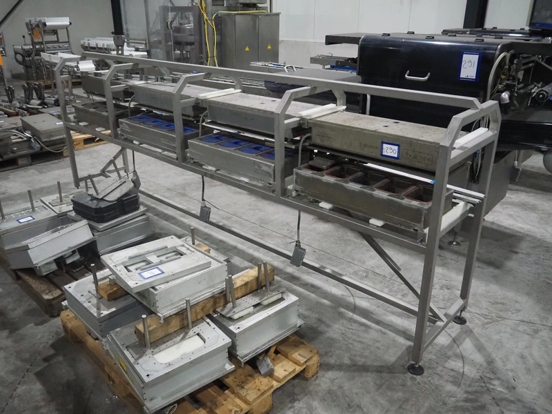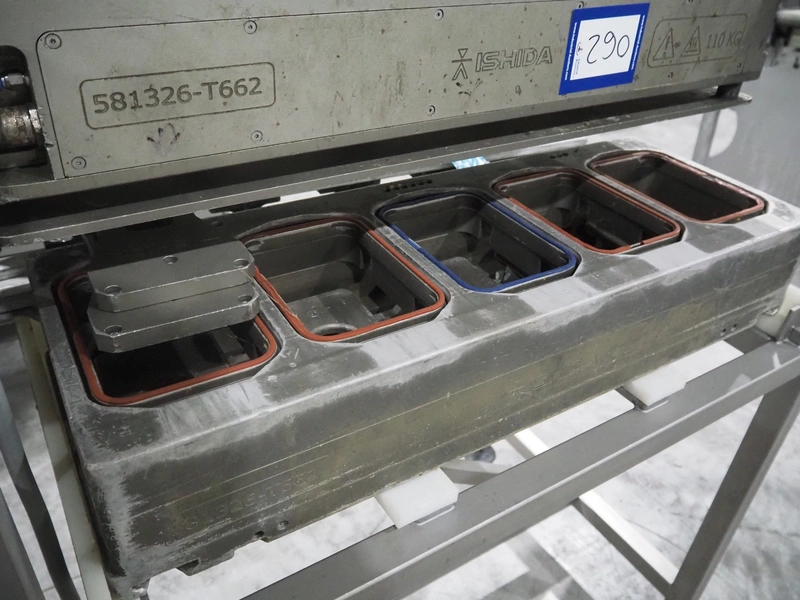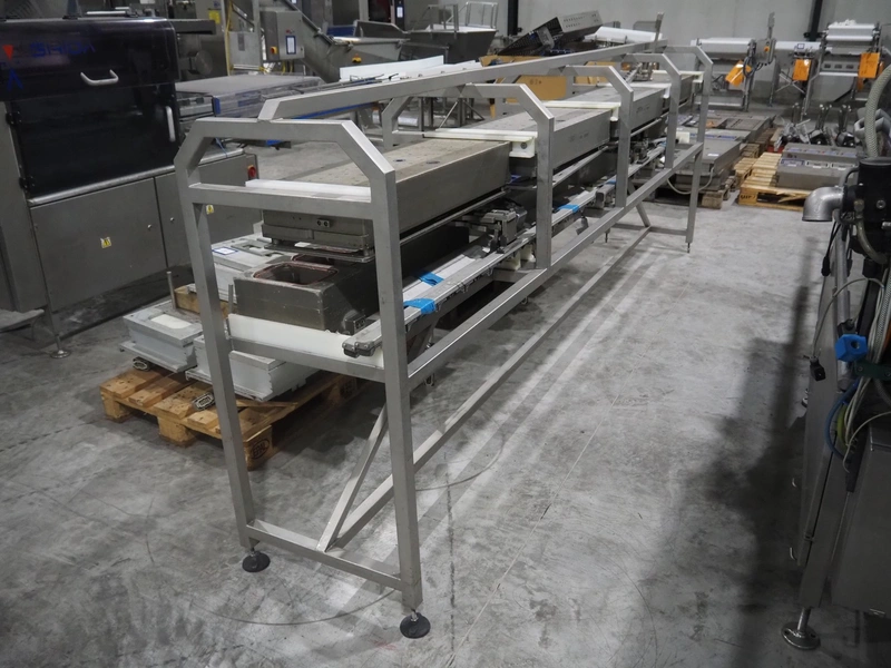 Ishida s/s rack for dye's, 4 dyes, dimensions: (5x) 165 mm x 120, (4x) 200 mm x 150 mm, (4x) 200 mm x 150 mm, (3x) Ø 185 mm, total dimensions: 3650 mm x 595 mm x 1350 mm.